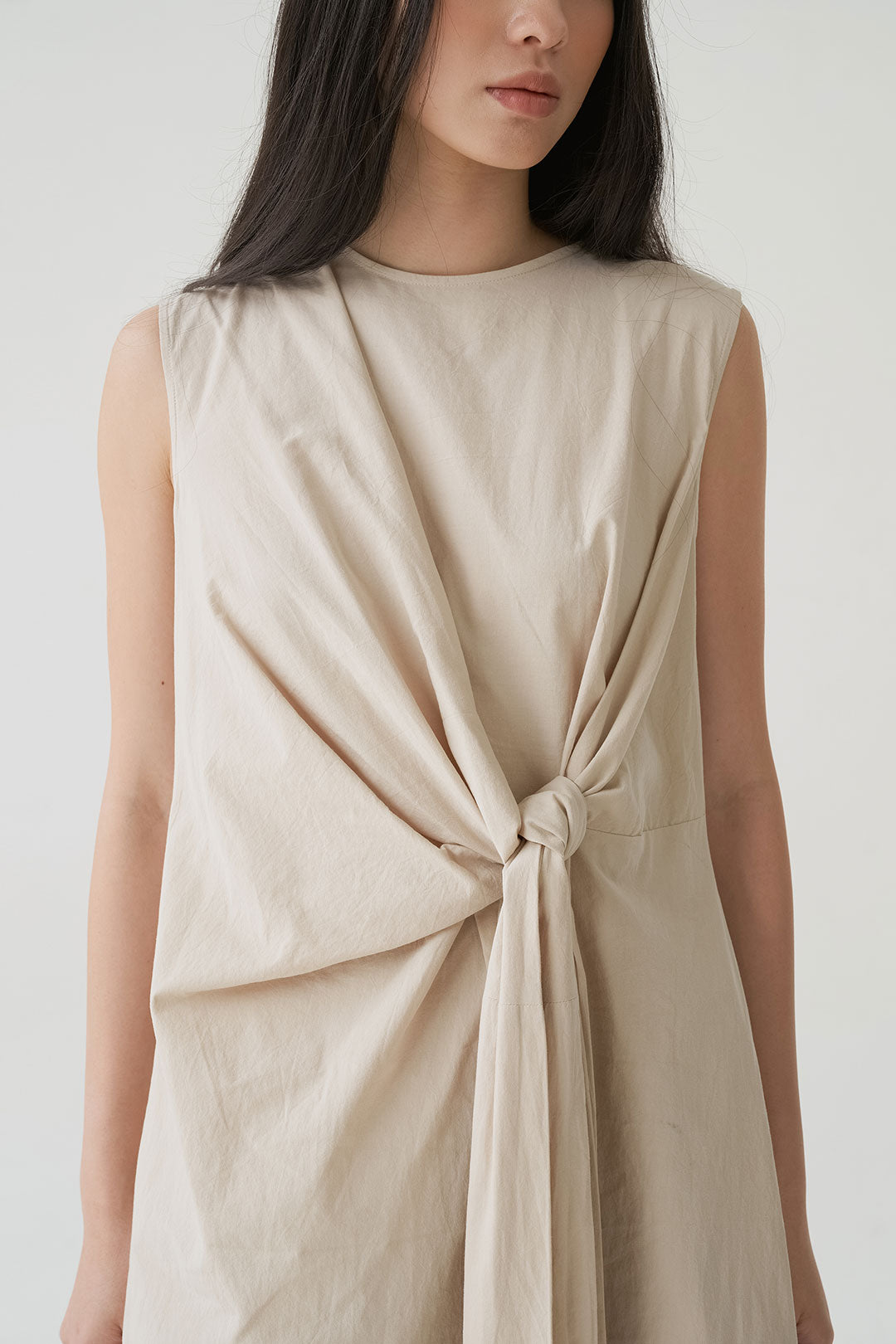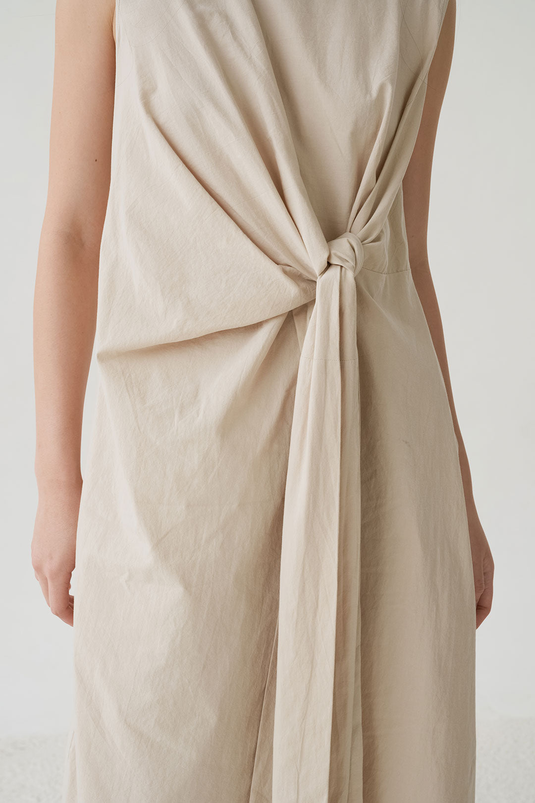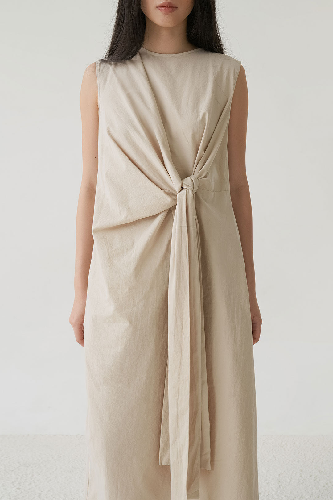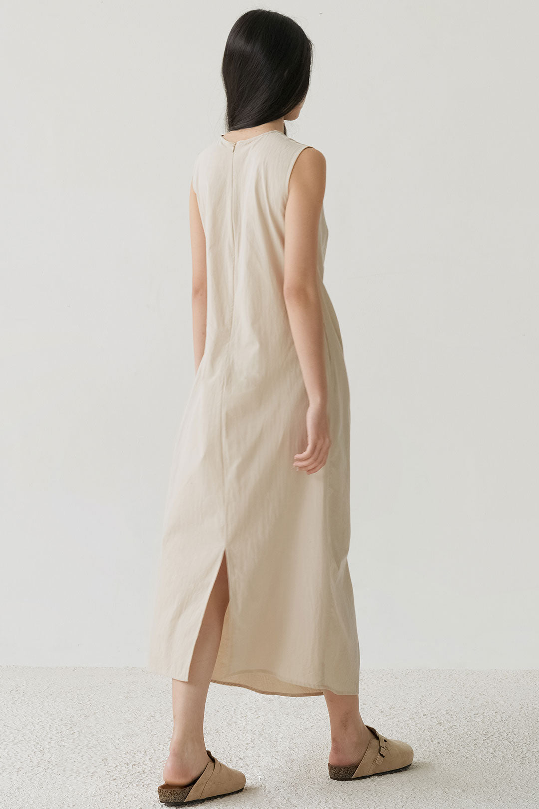 - Minimalist sleeveless dress with a structured yet fluid silhouette