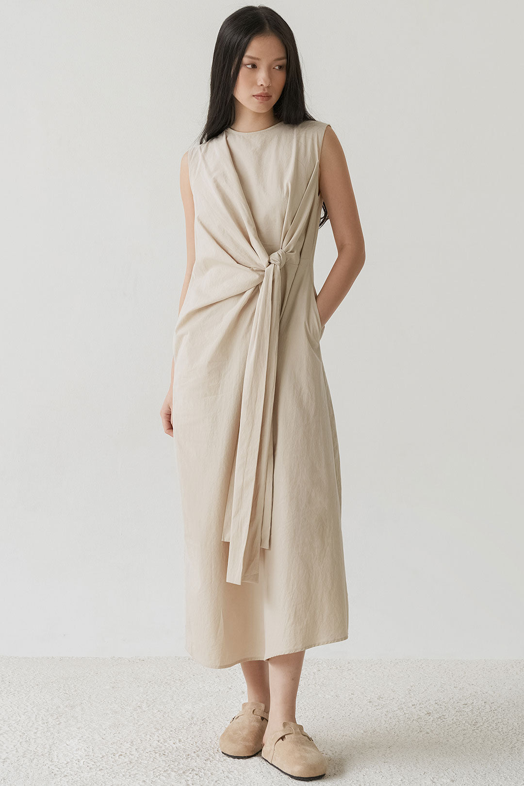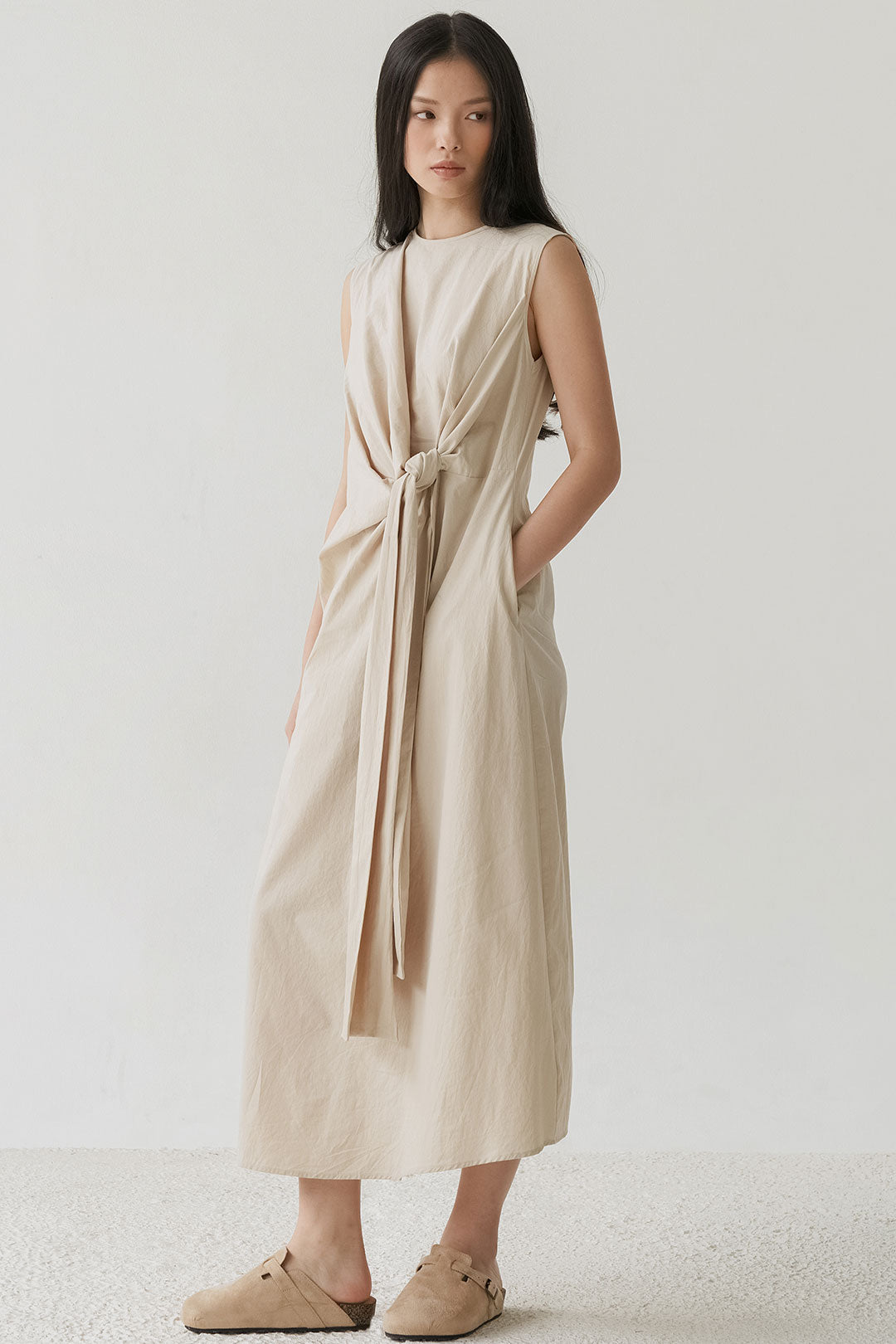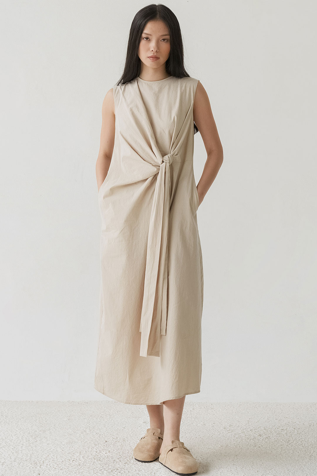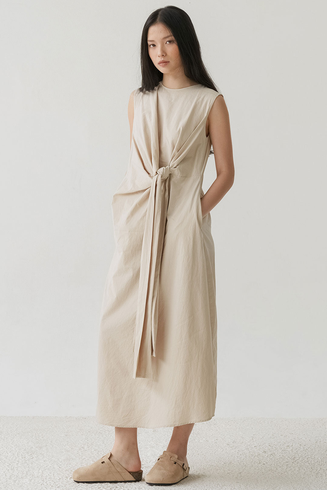 - Minimalist sleeveless dress with a structured yet fluid silhouette