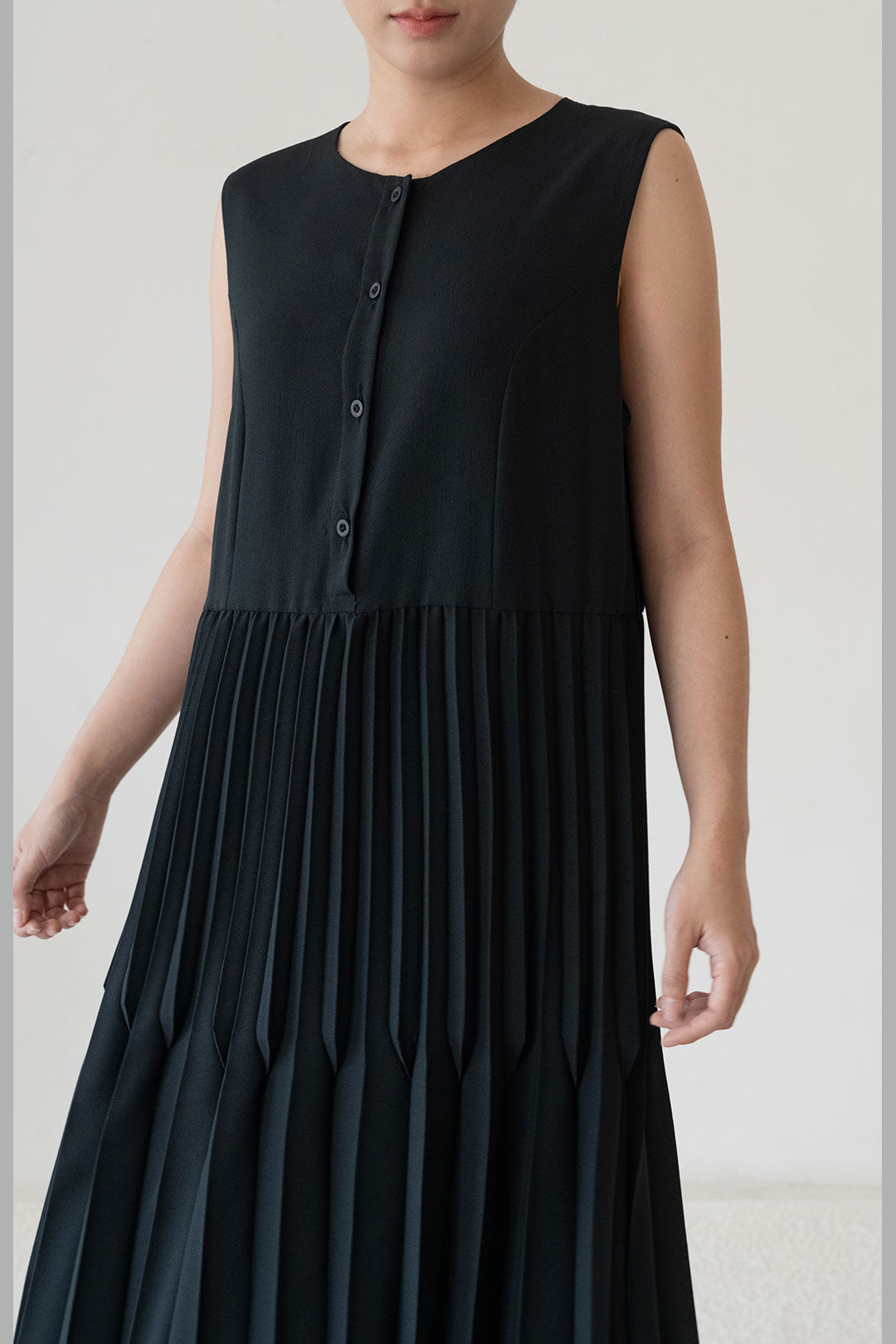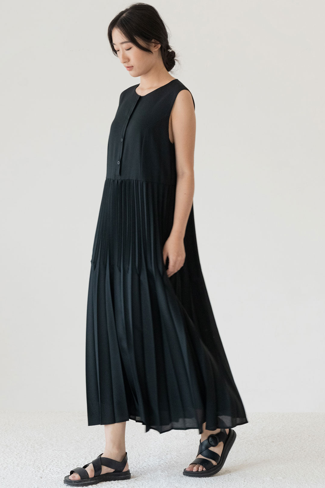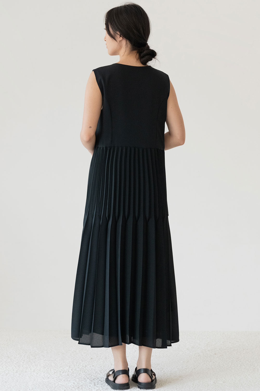 - Sleeveless and finely pleated skirt for a refined silhouette.