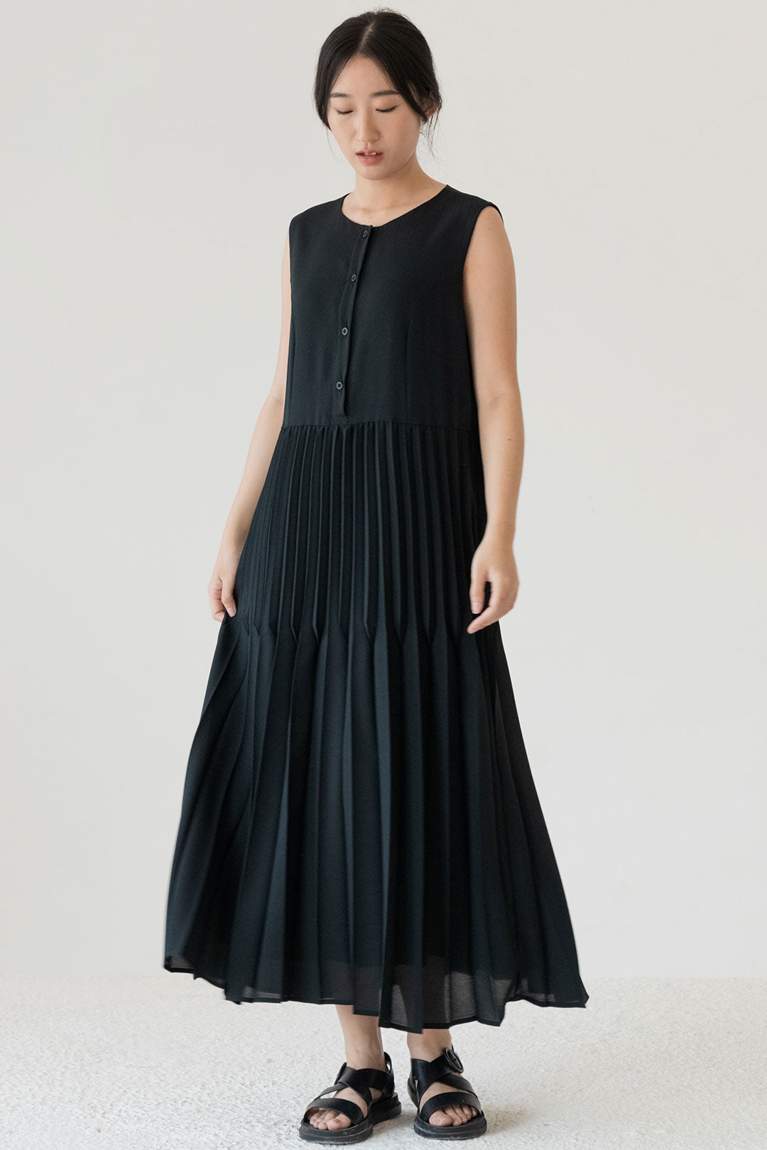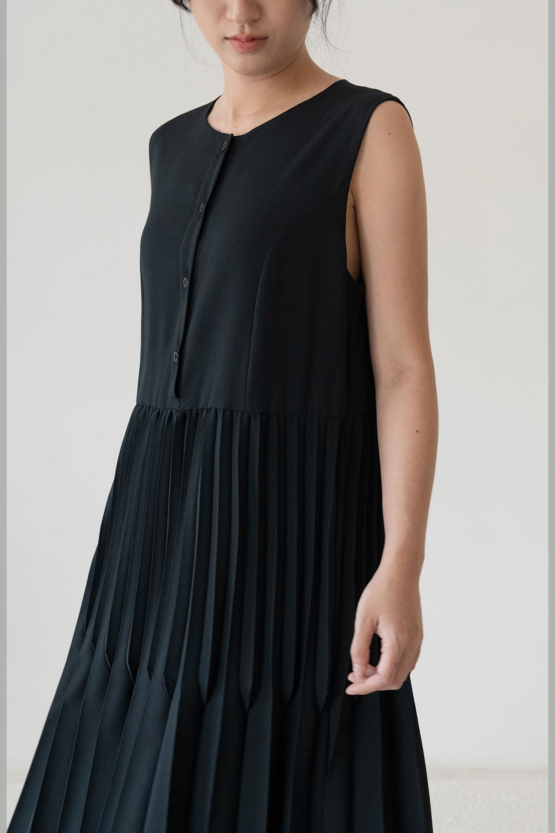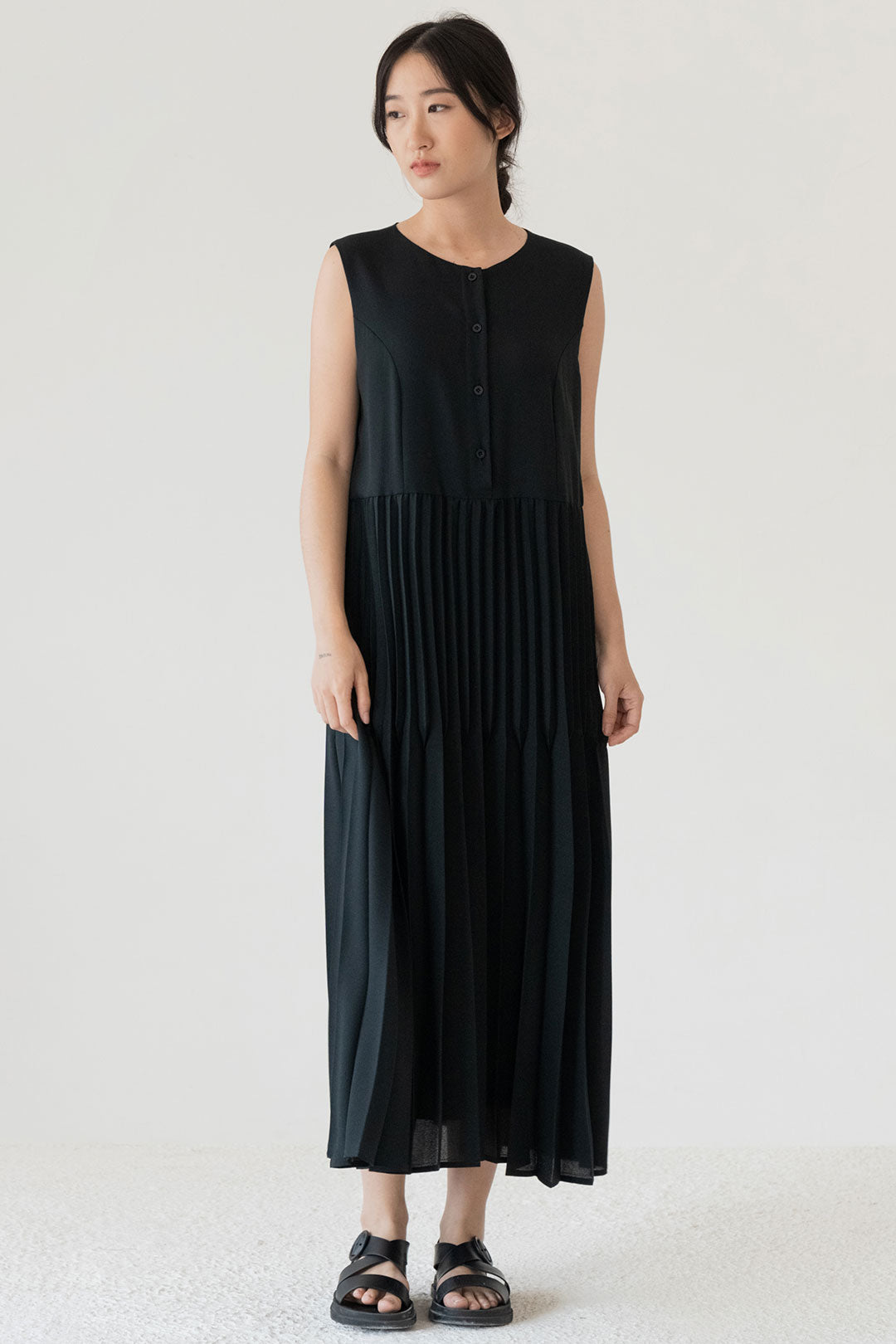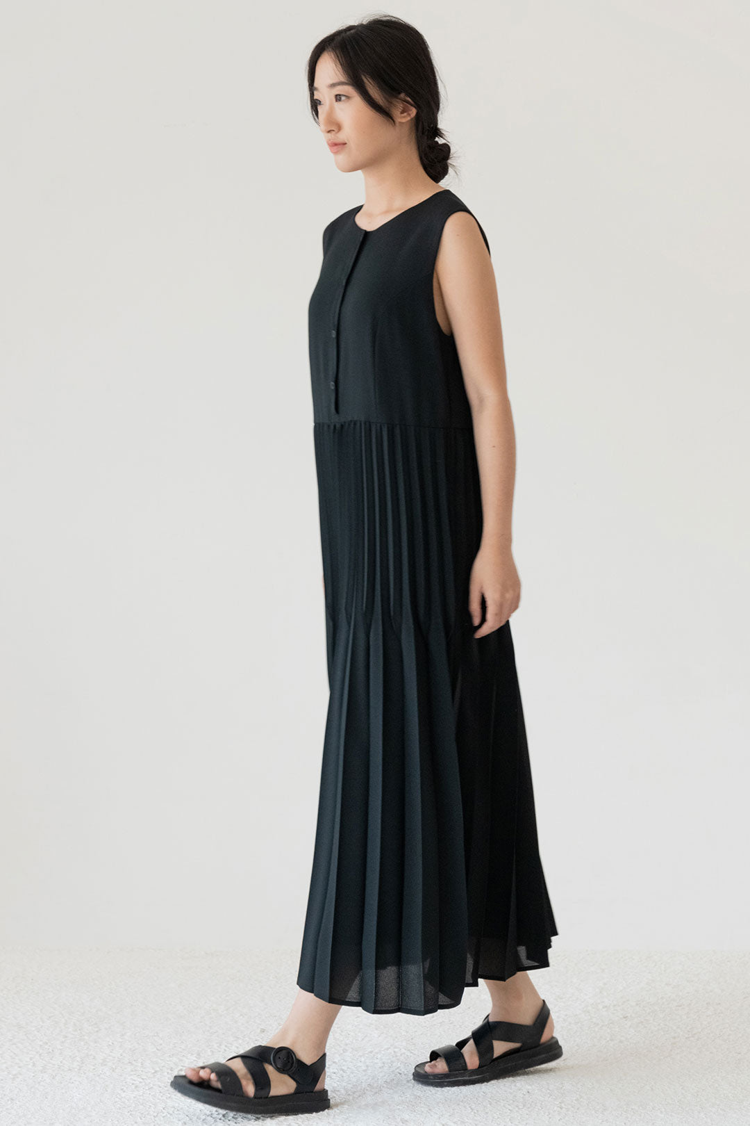 - Sleeveless and finely pleated skirt for a refined silhouette.