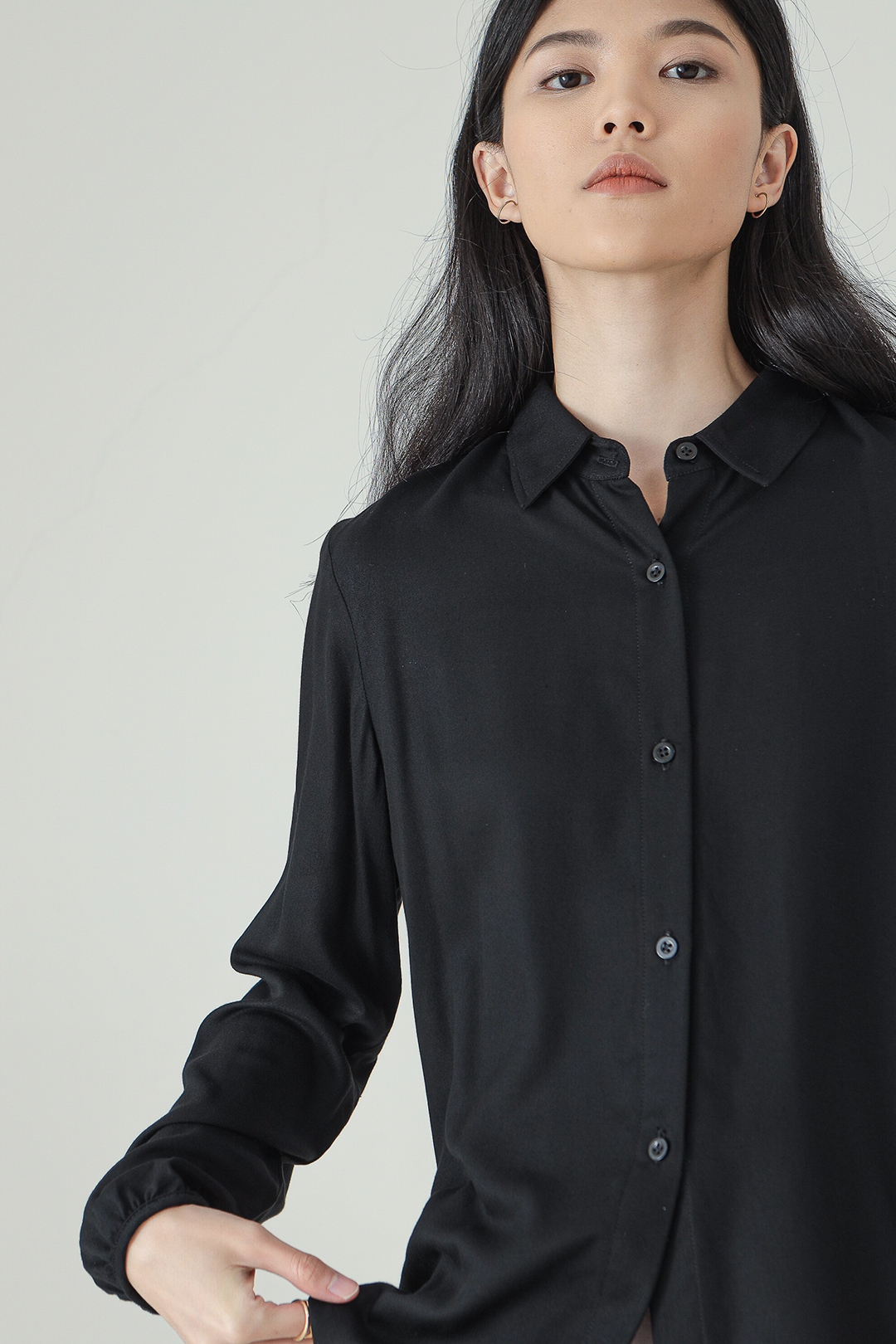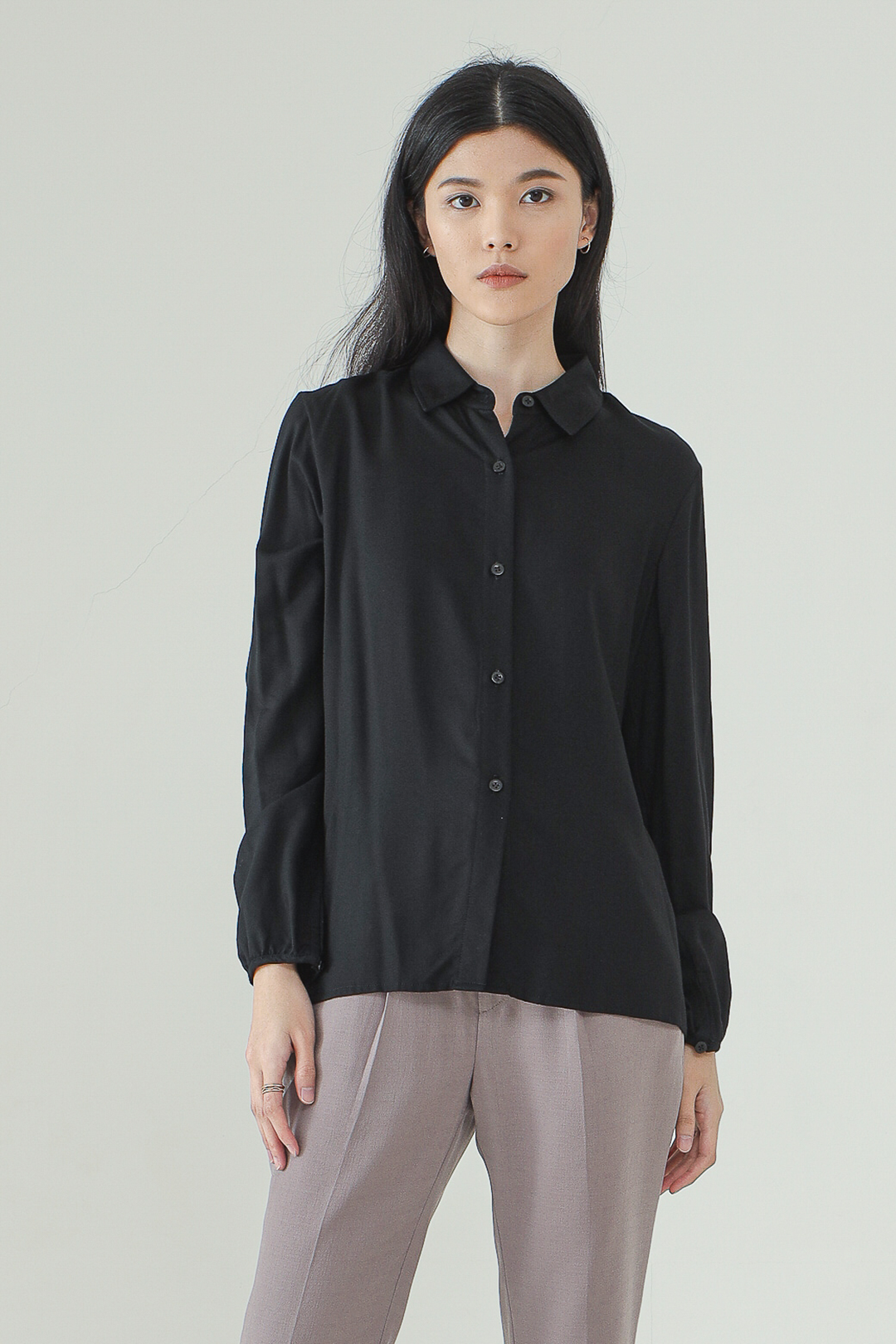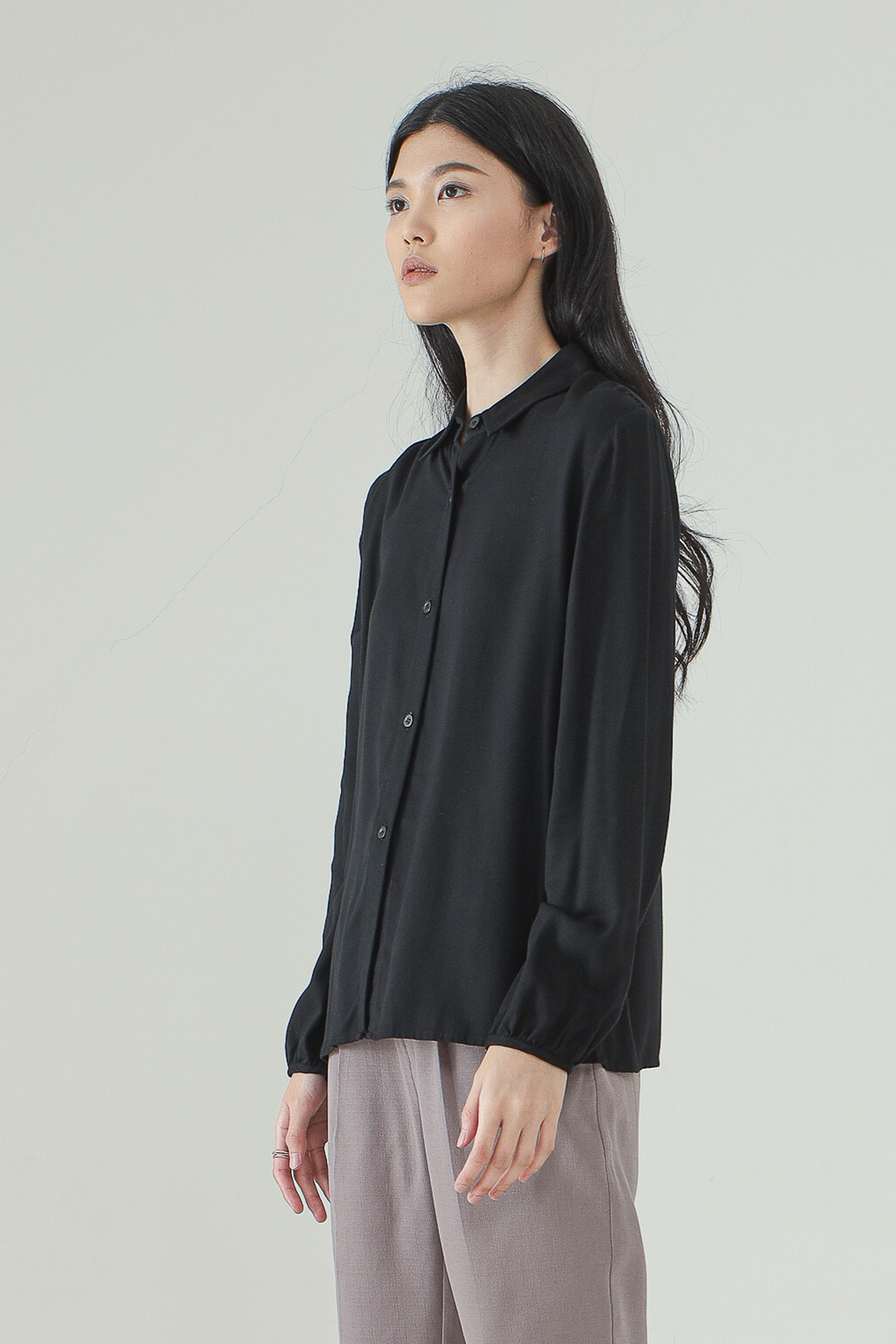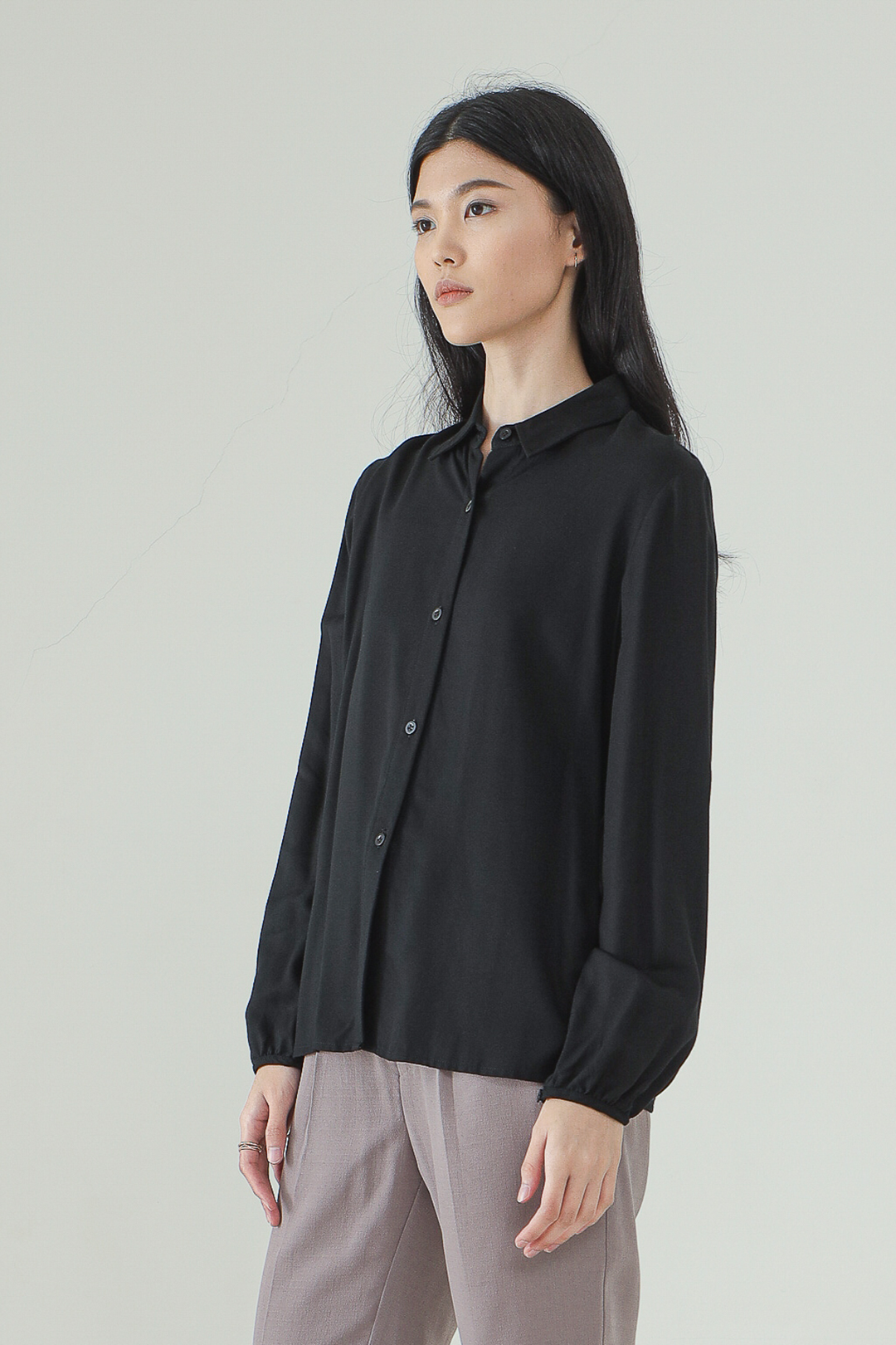 Long gathered-cuff sleeve shirt with collar and front button opening.