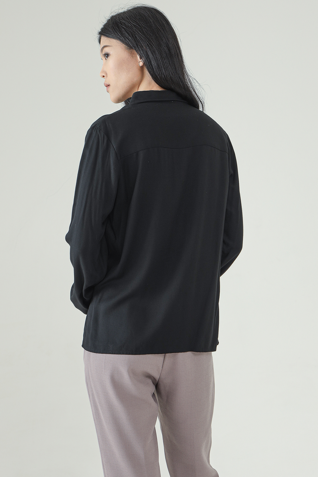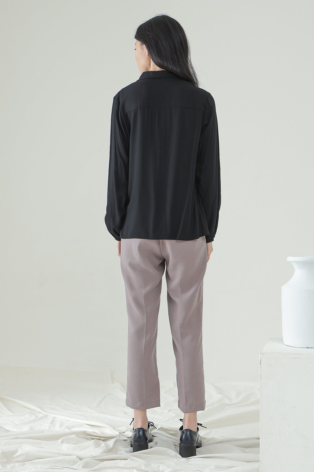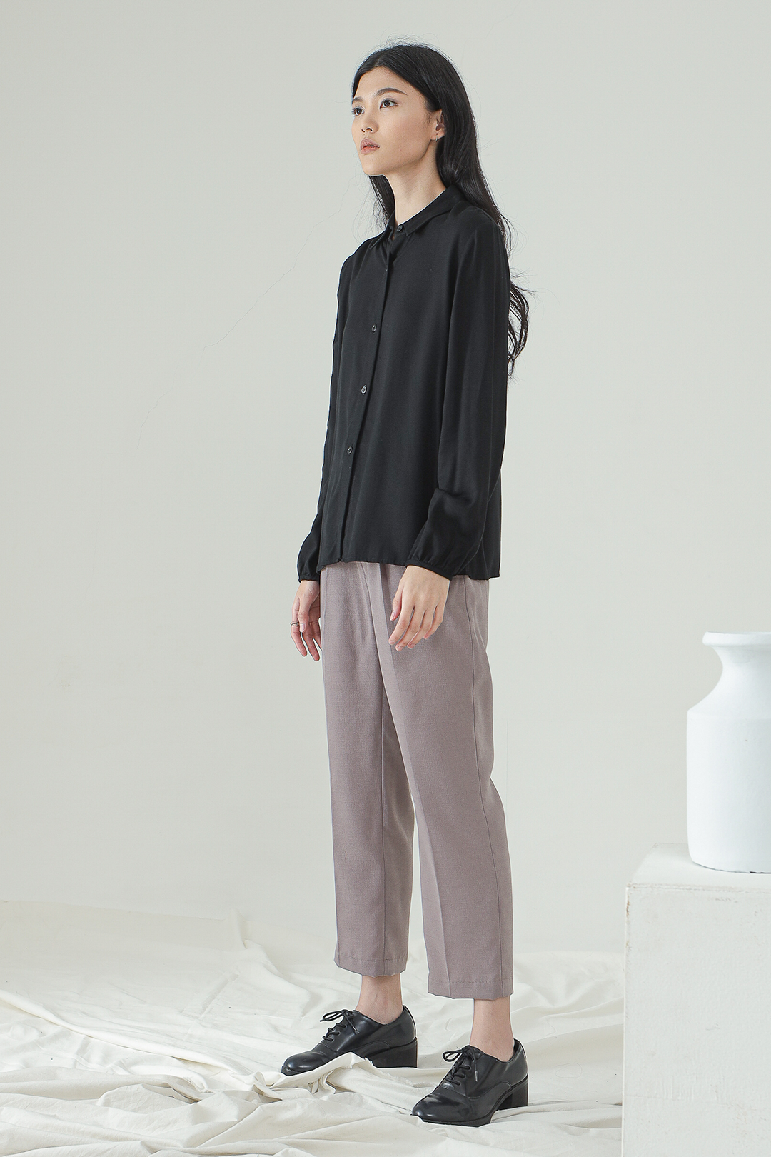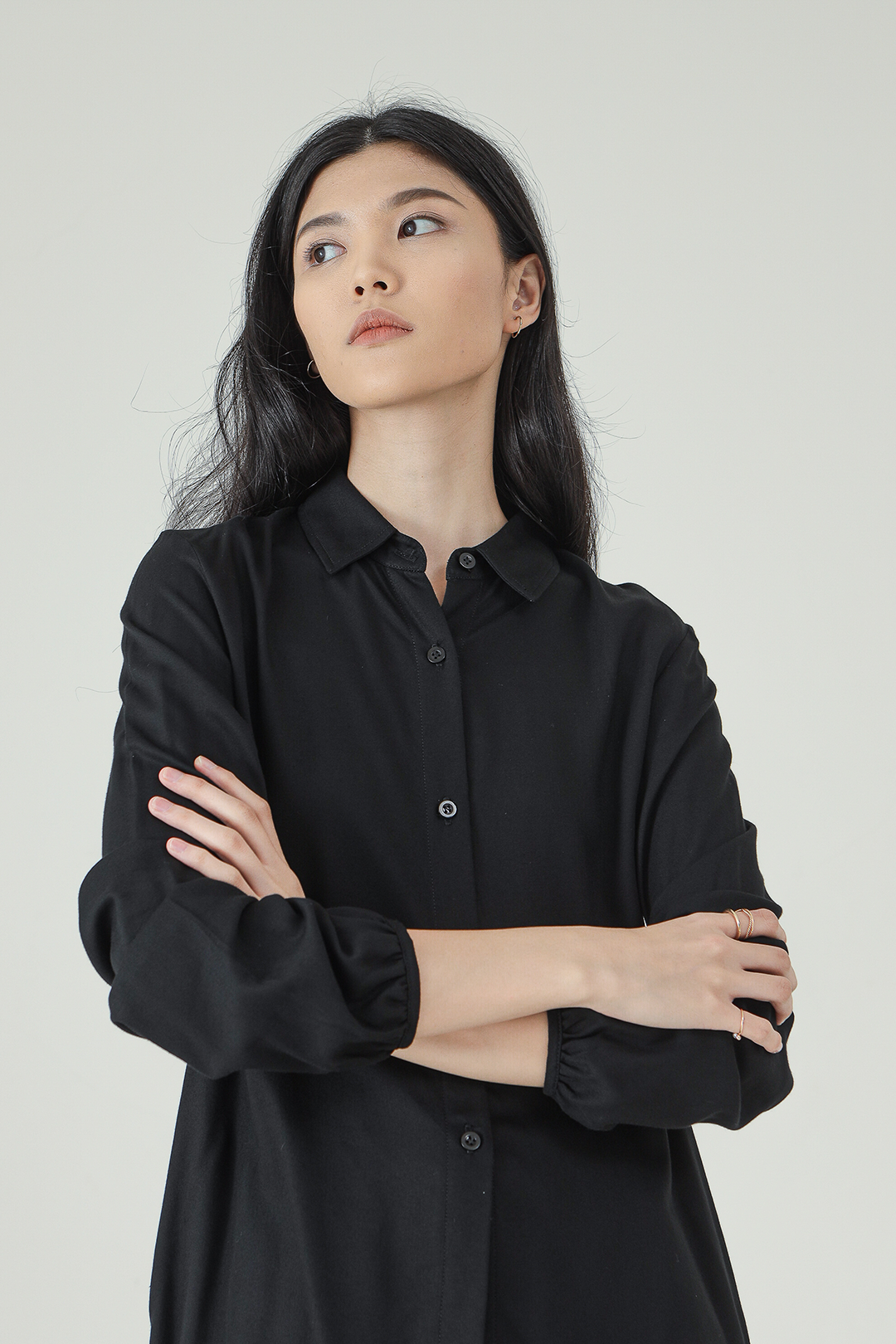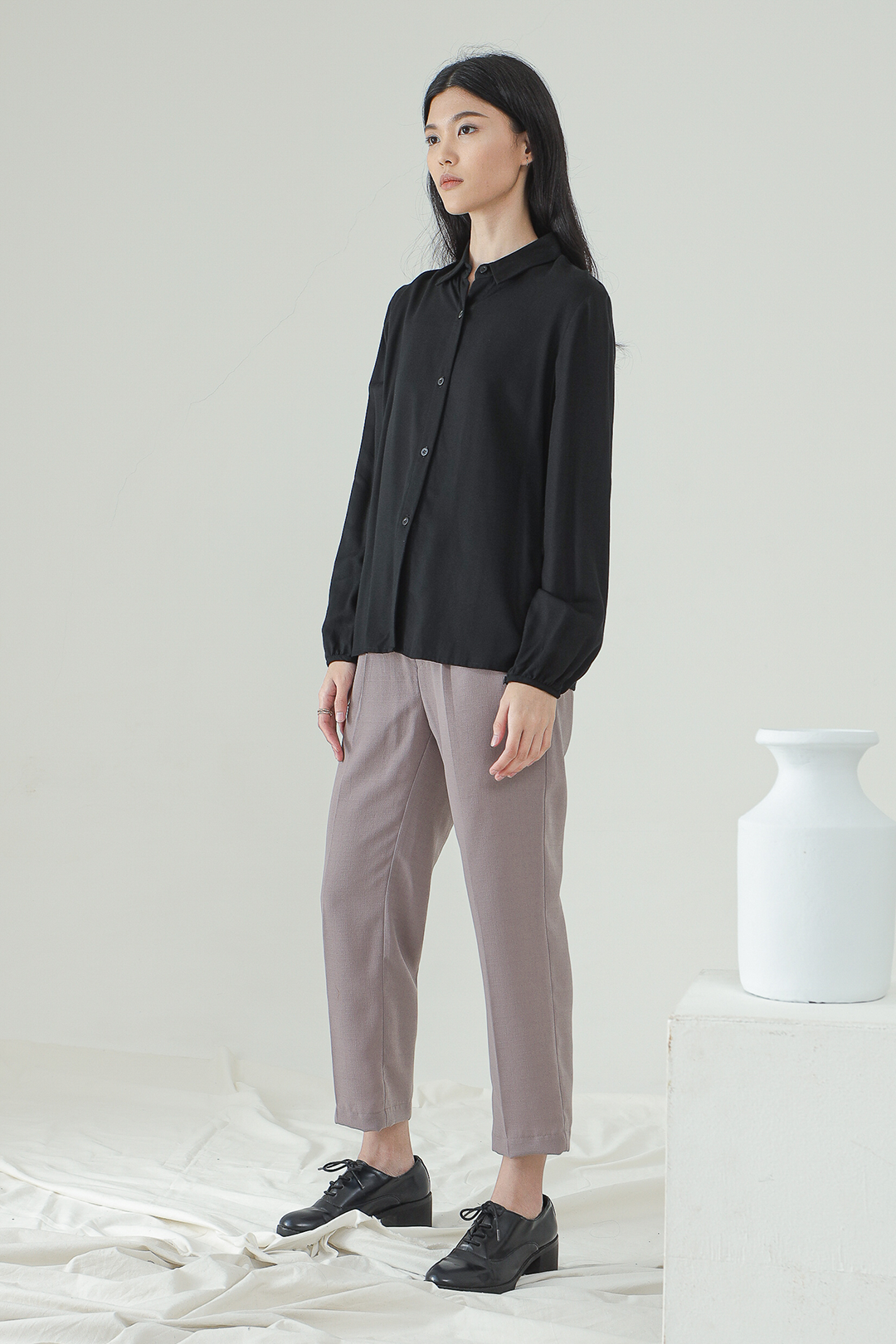 Long gathered-cuff sleeve shirt with collar and front button opening.