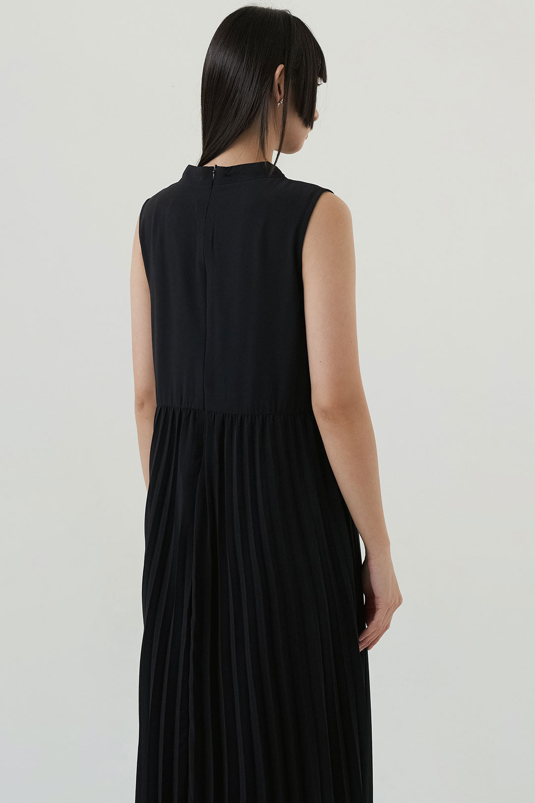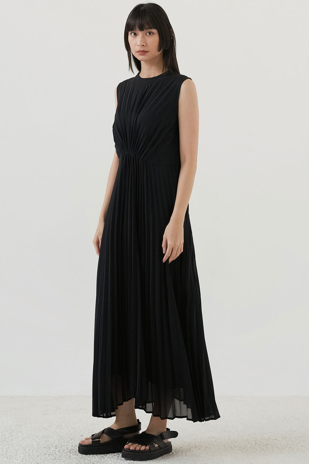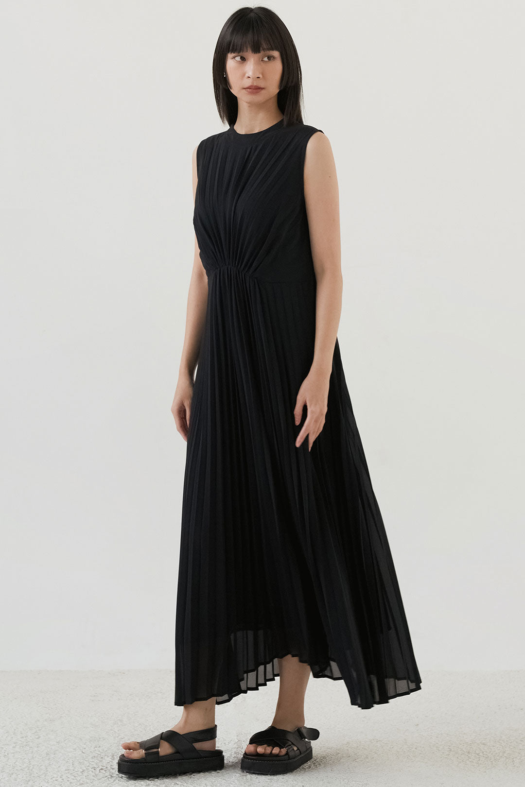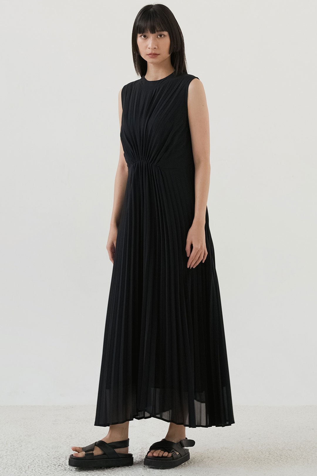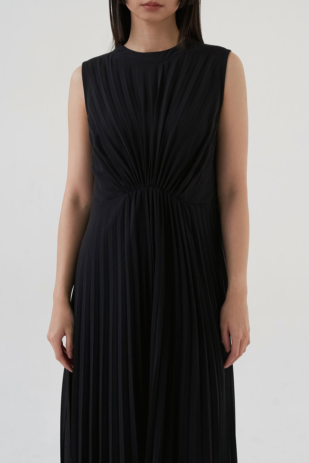 - Soft, flowy fabric with fine pleats that create graceful movement.
