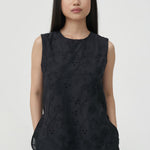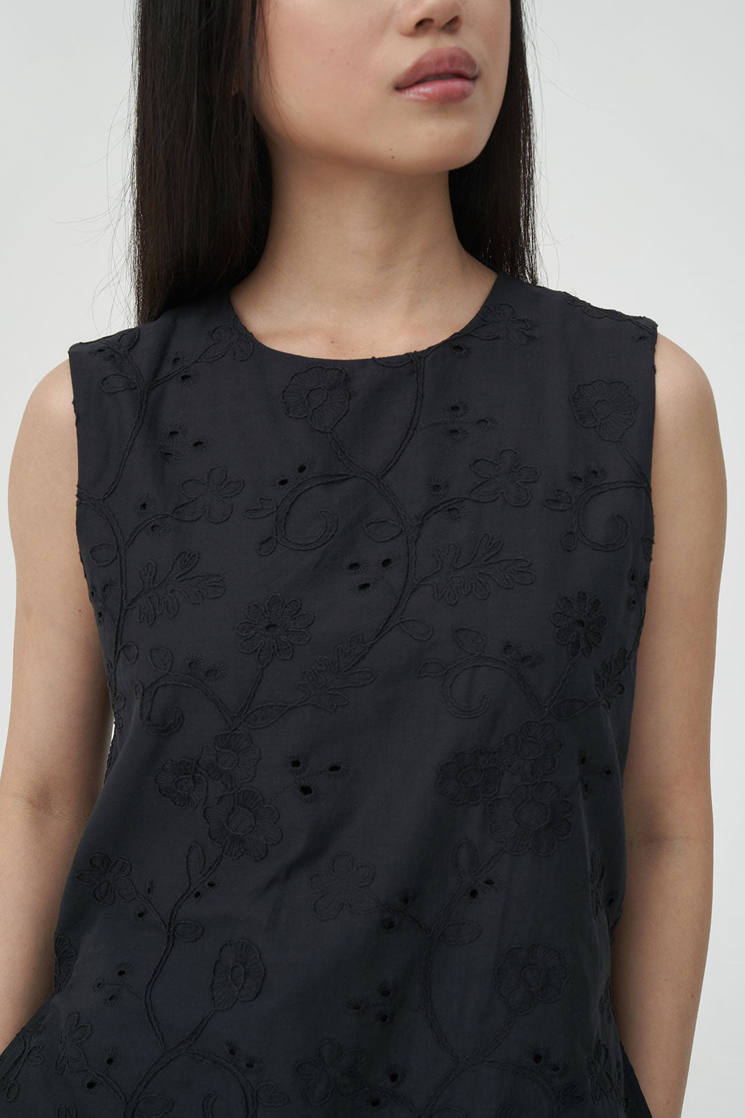 - A sleeveless embroidered top crafted in soft cotton with intricate floral eyelet details throughout.