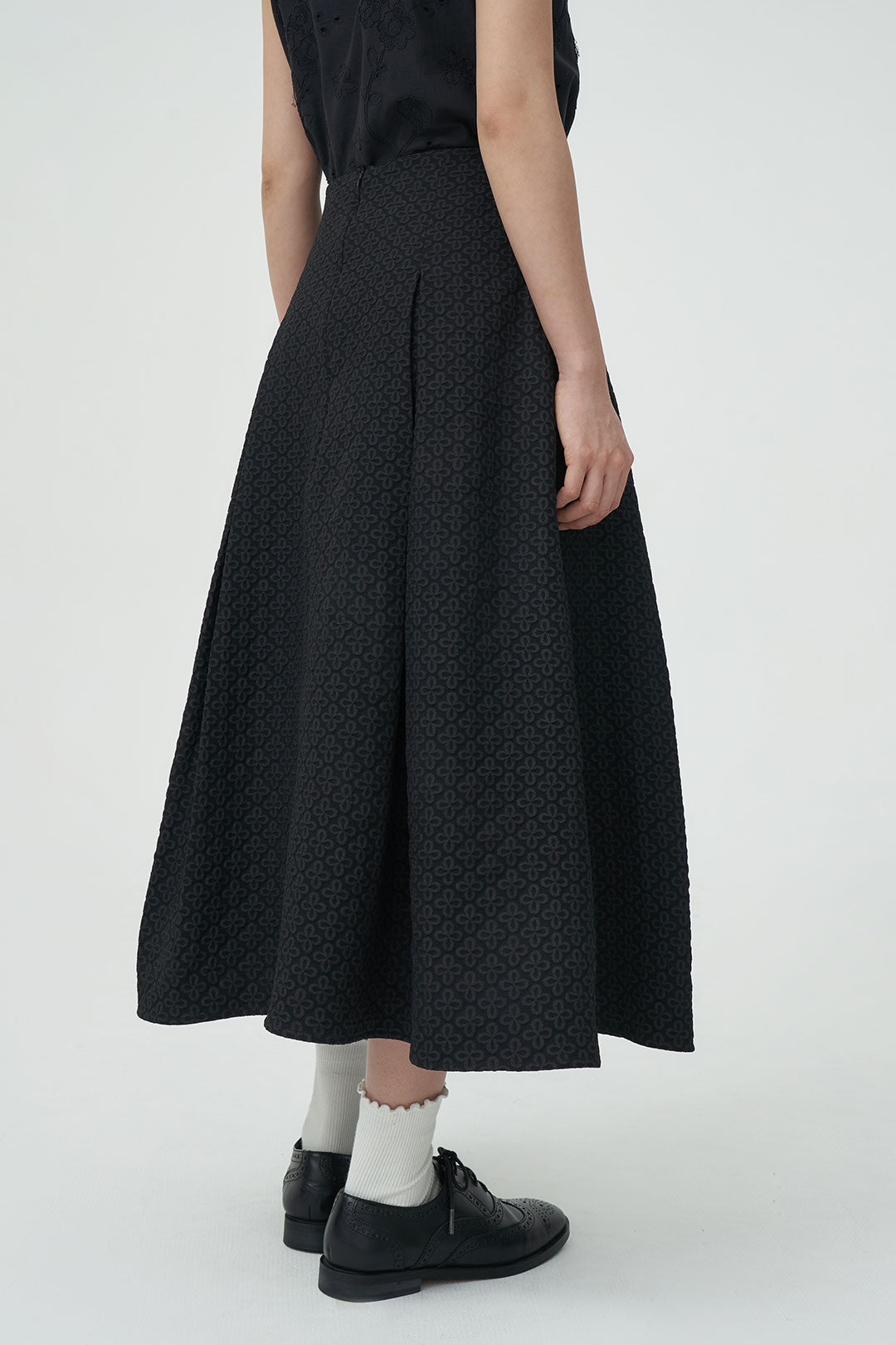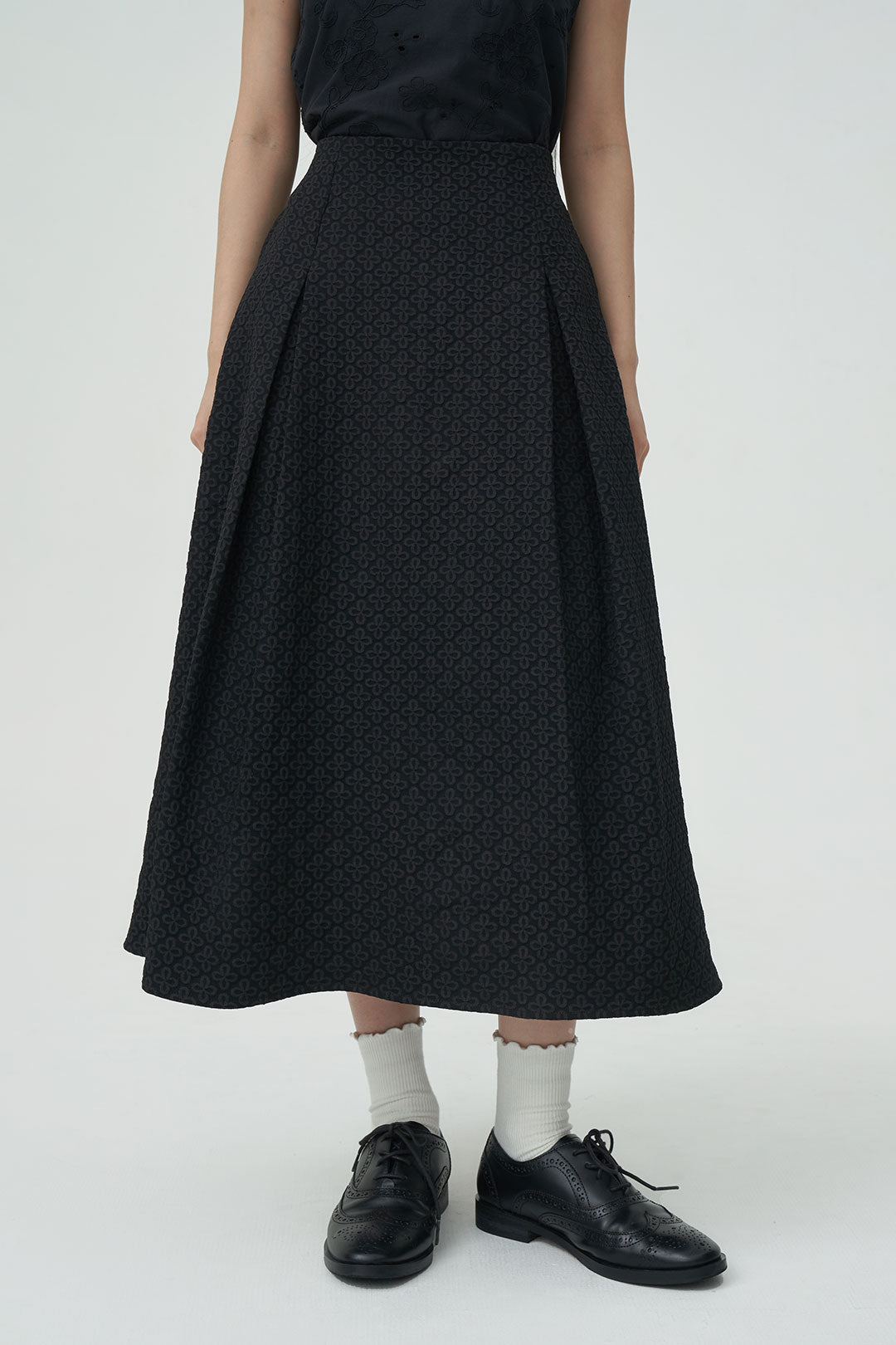 - A midi skirt crafted from textured floral fabric that adds subtle dimension to your look.
