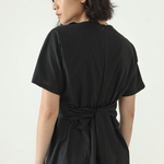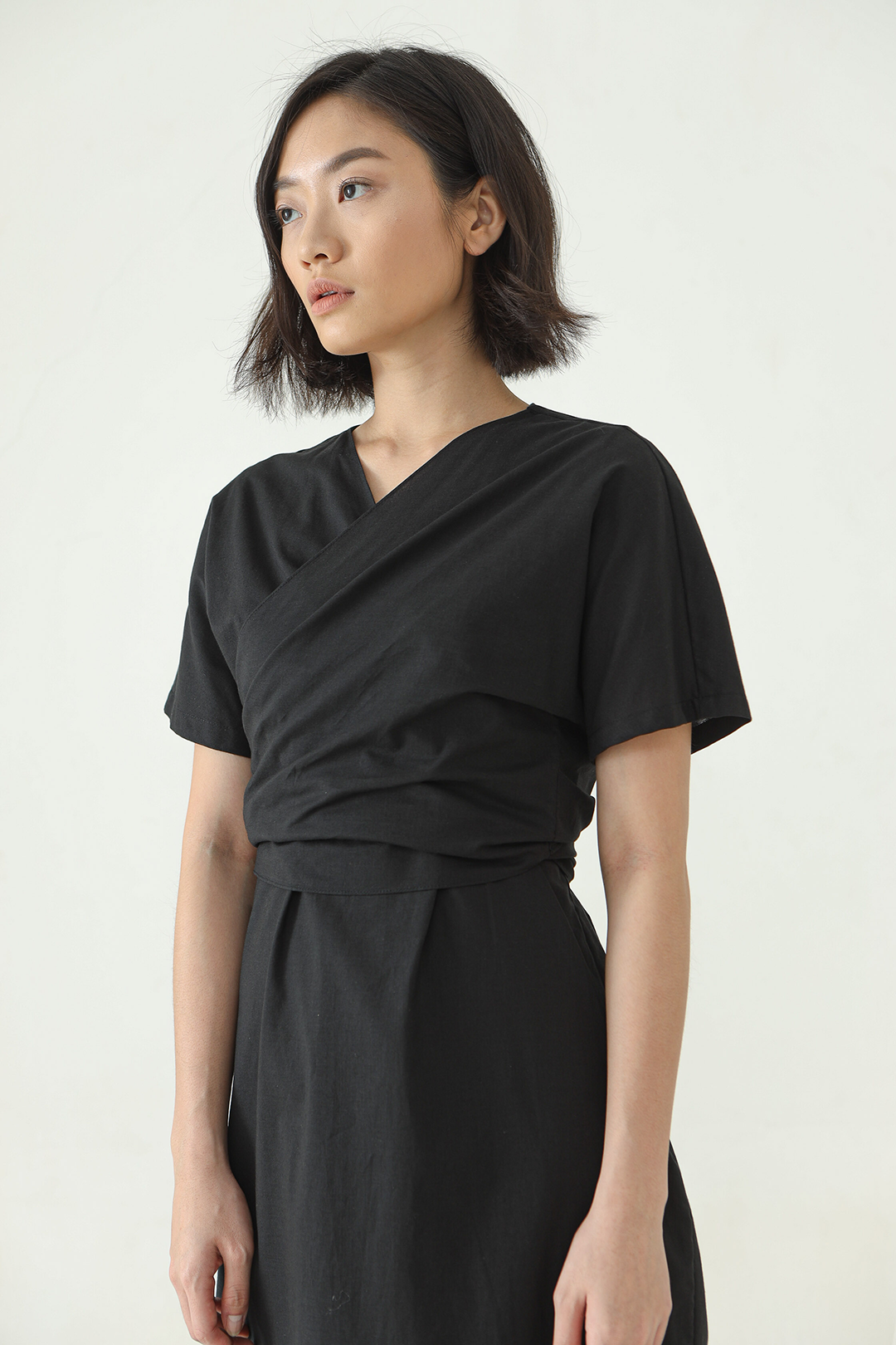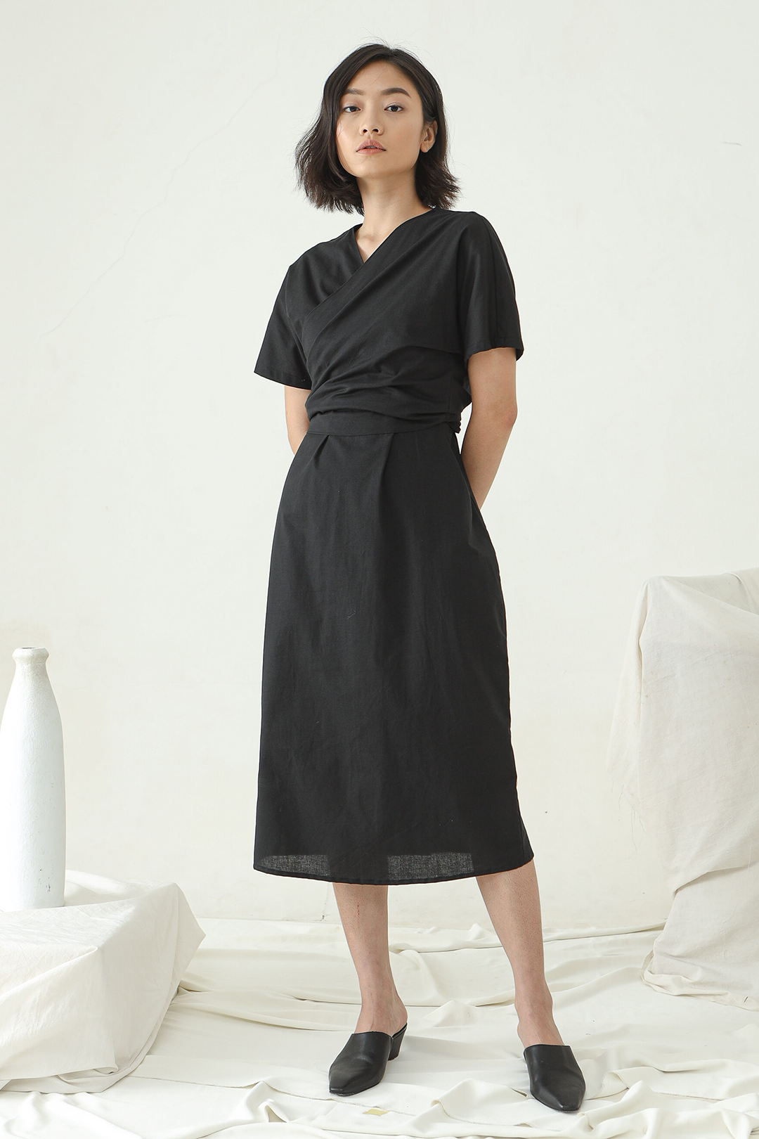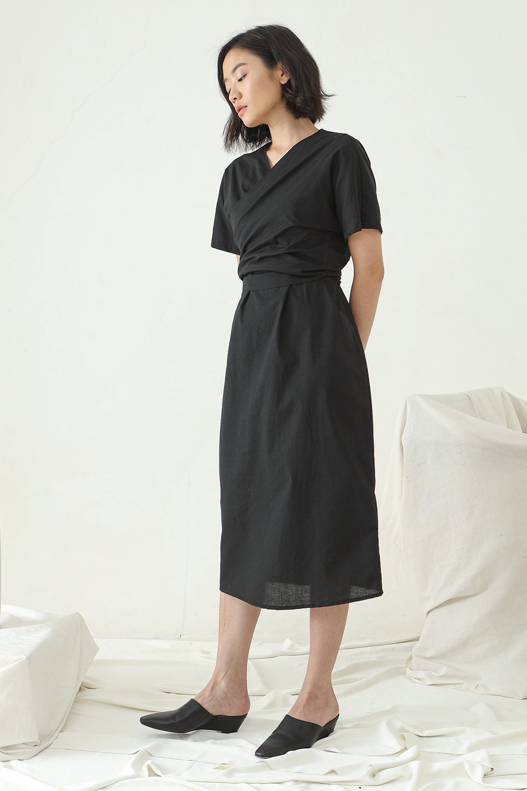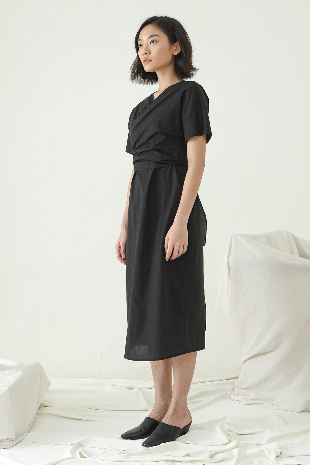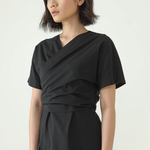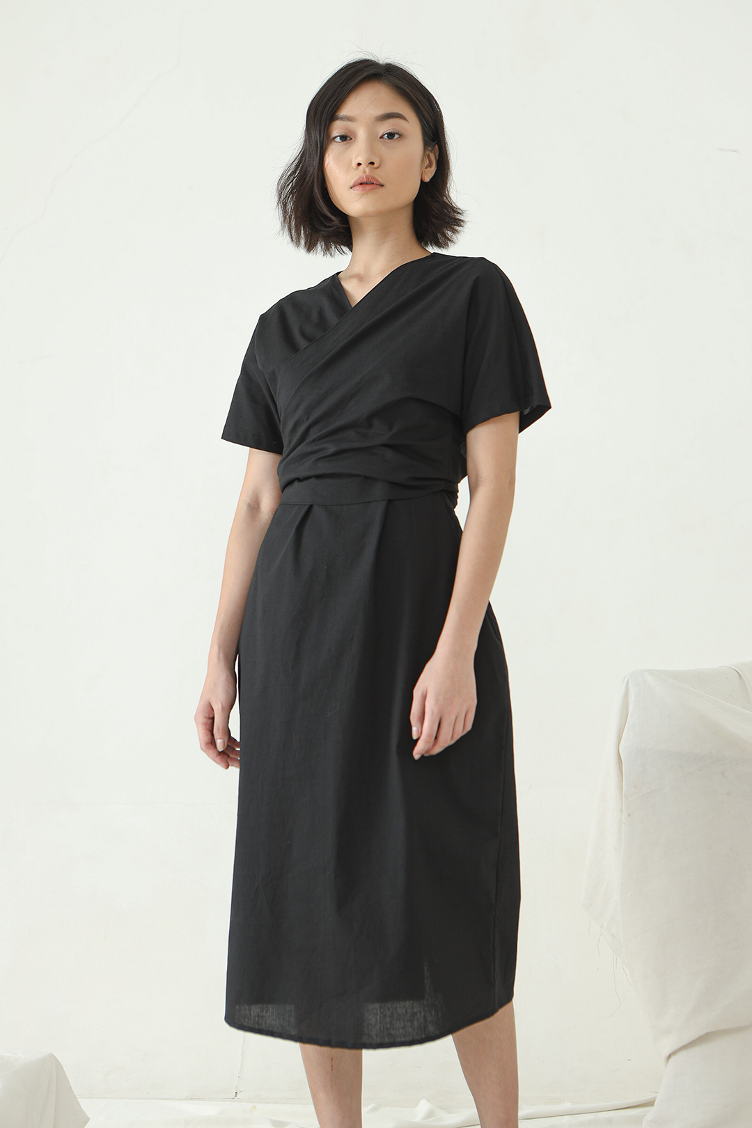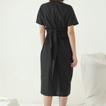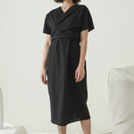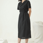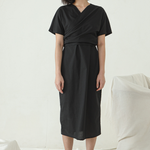 Mid length Wrap dress with V neckline and short sleeves.