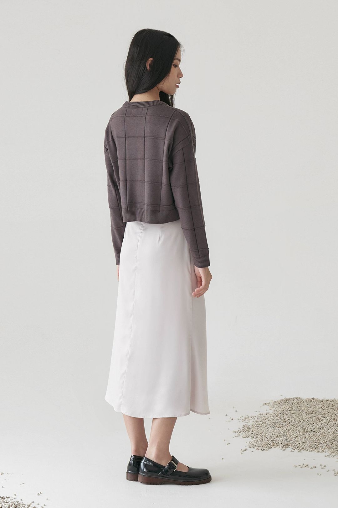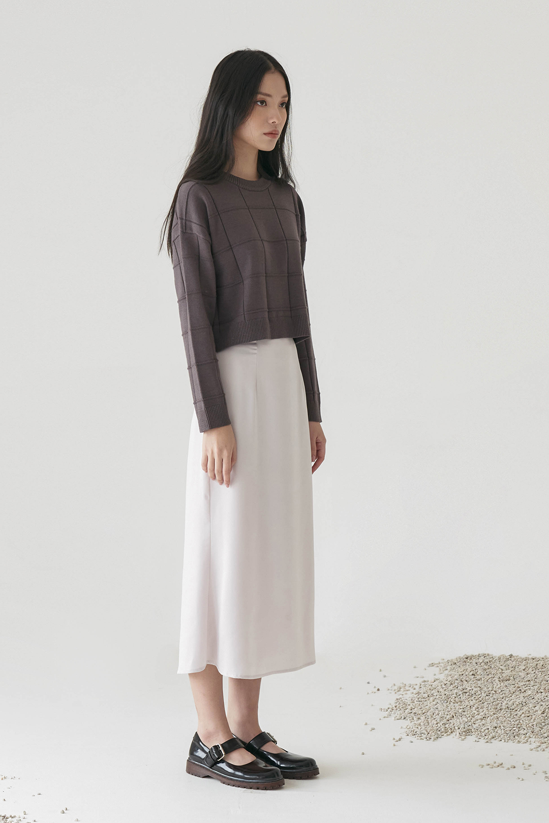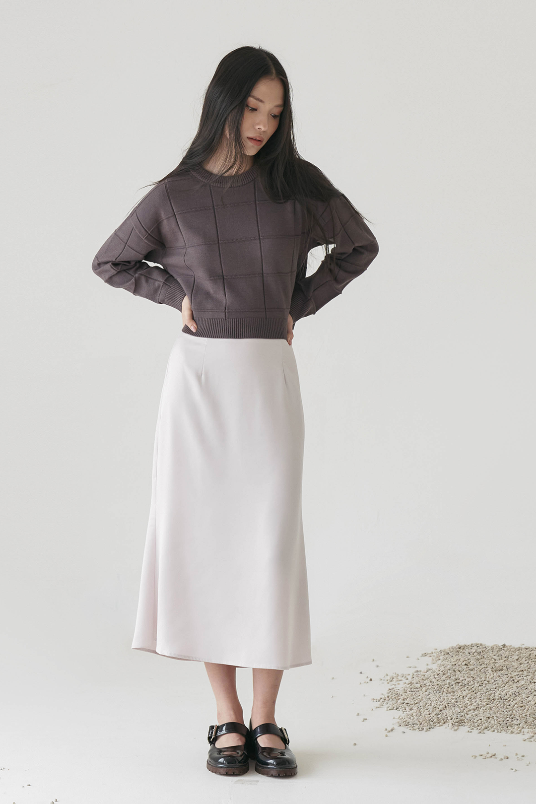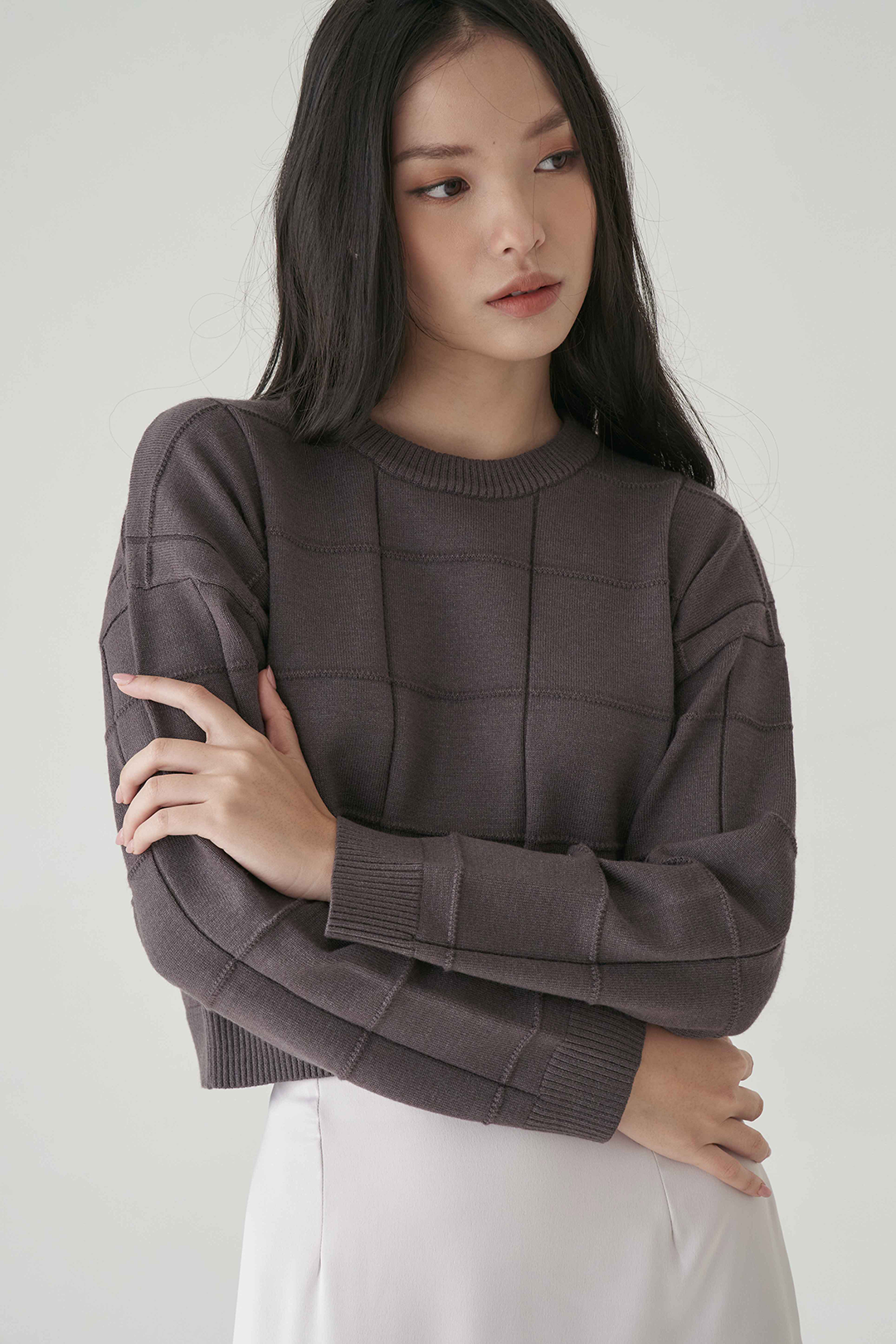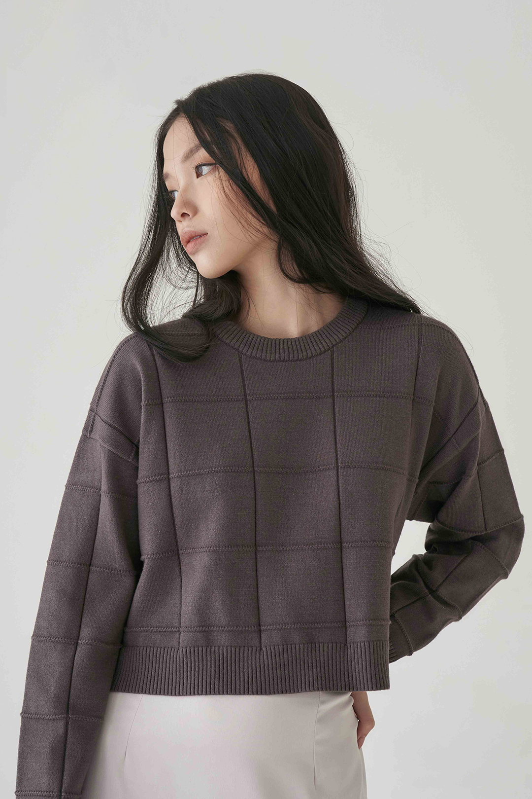 Cropped top knitted top with embossed pattern in long sleeves.