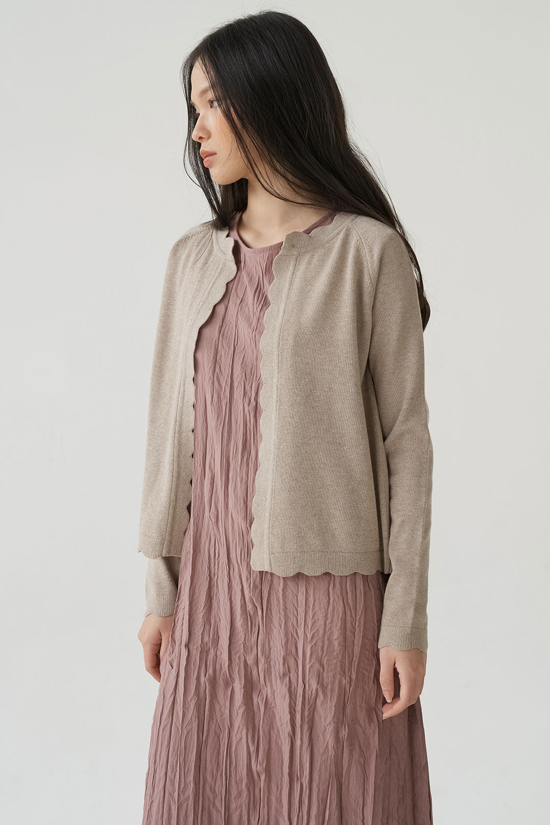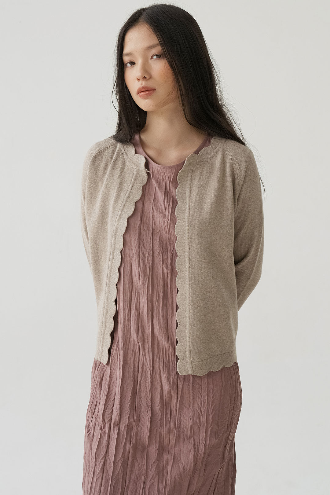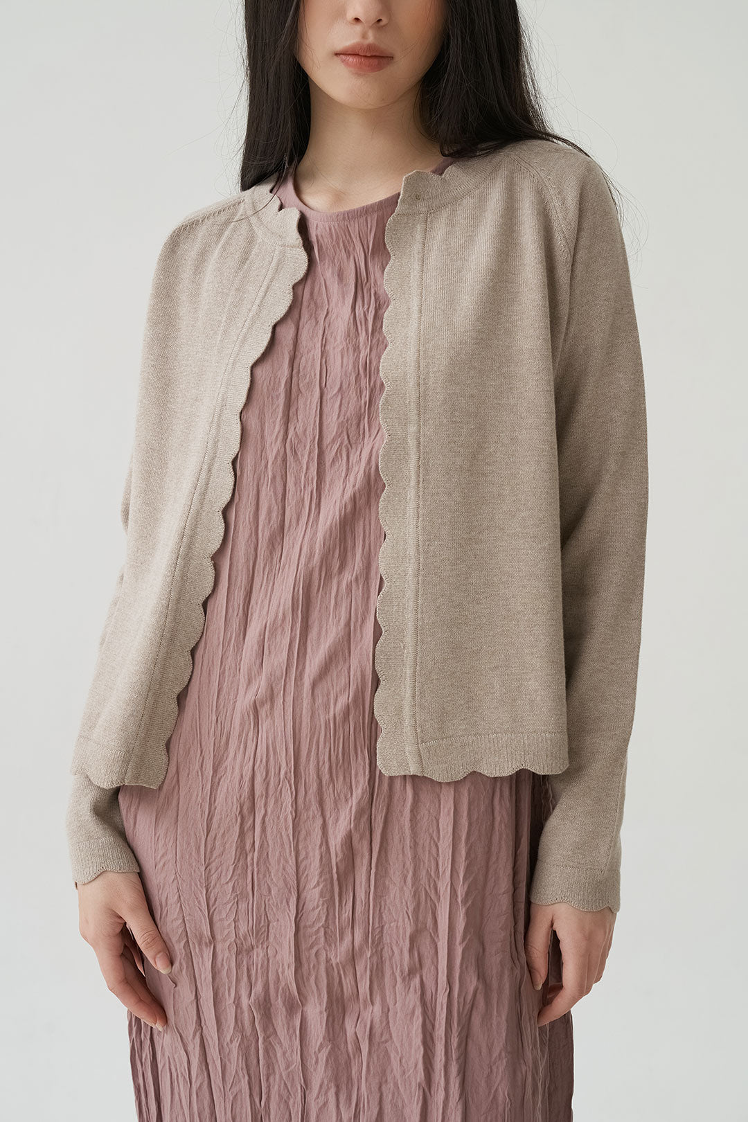 - Scalloped edges add a subtle, playful touch to its classic design.