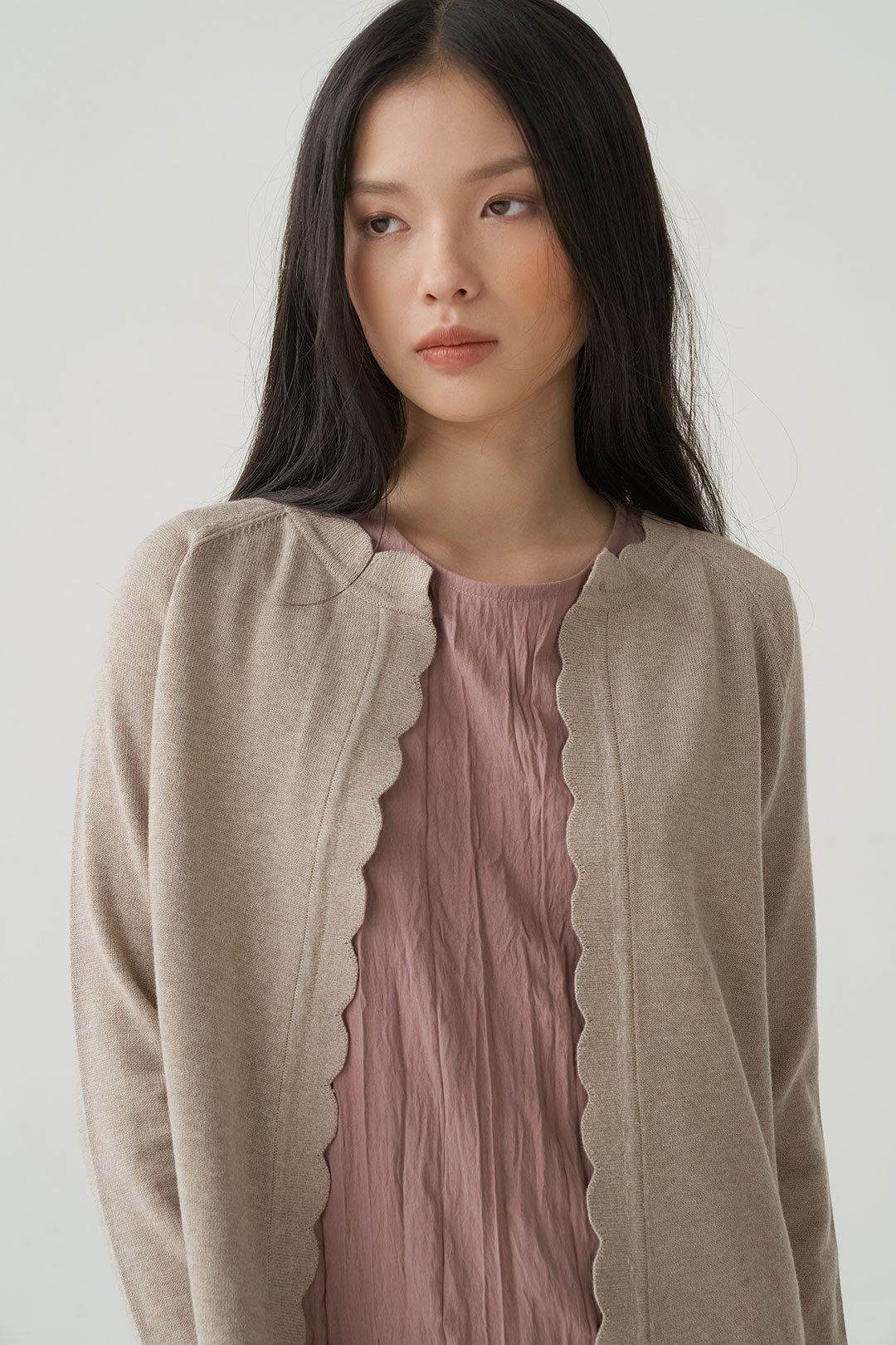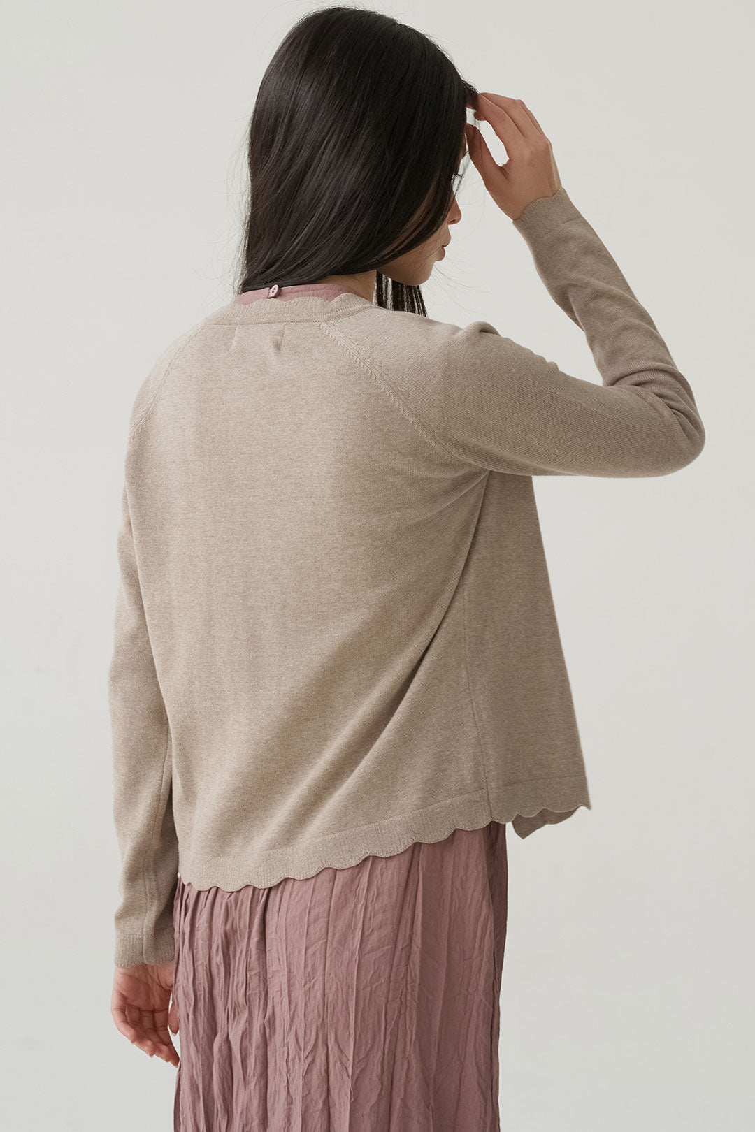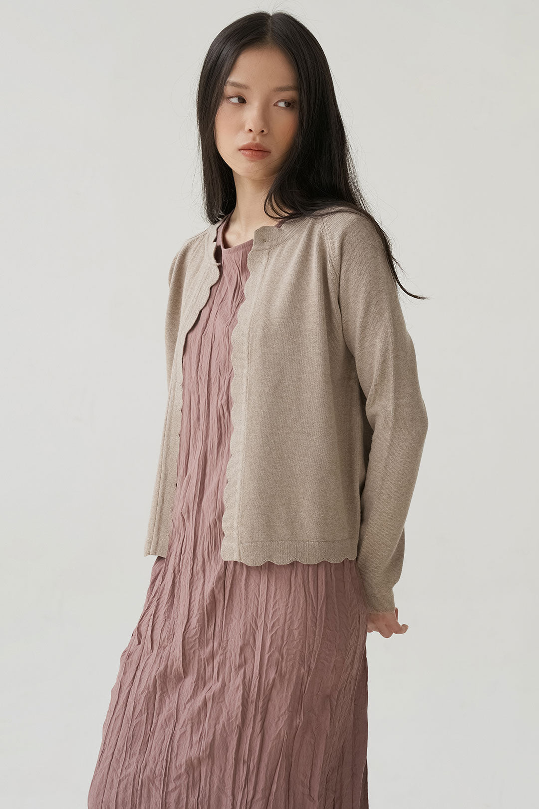 - Scalloped edges add a subtle, playful touch to its classic design.