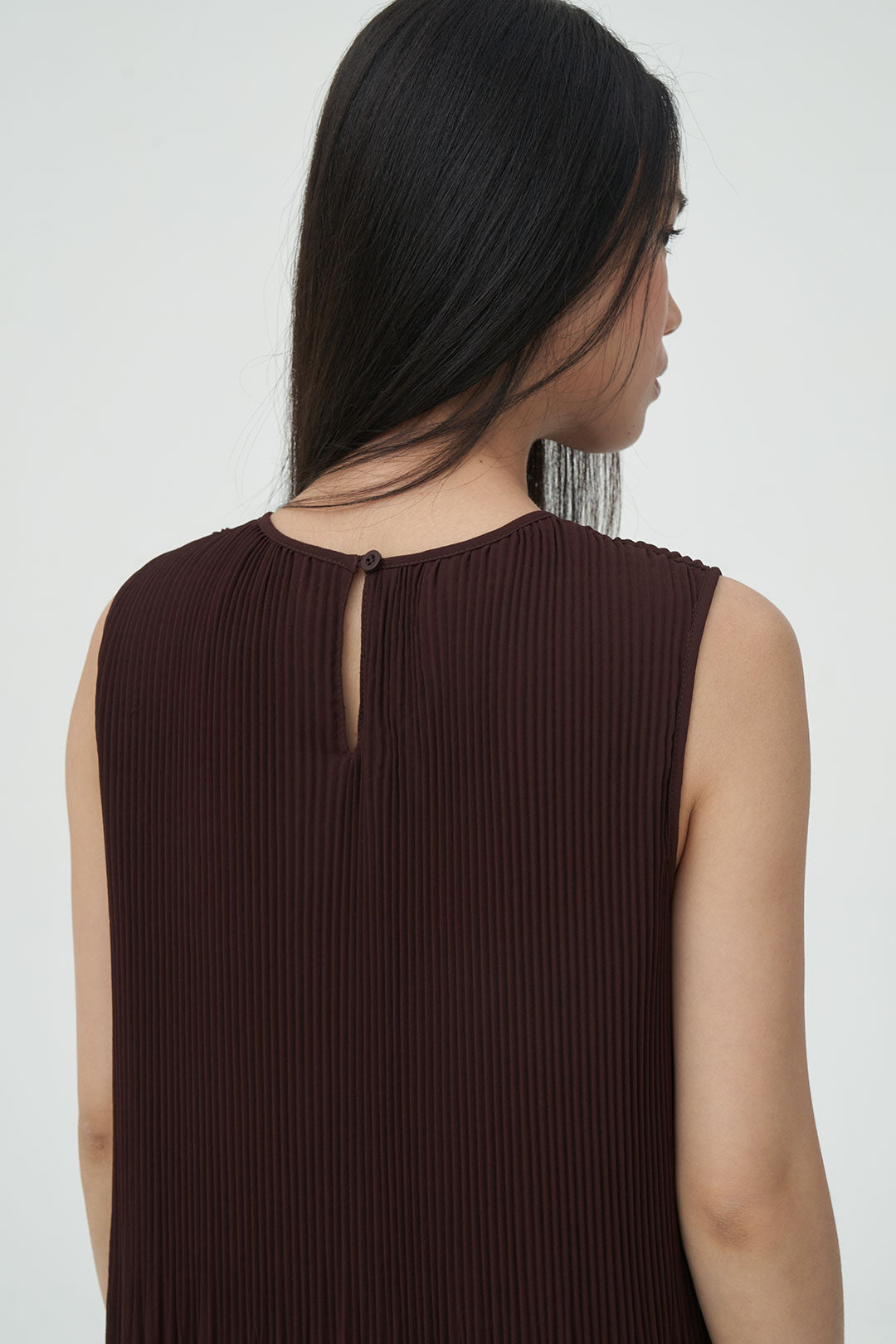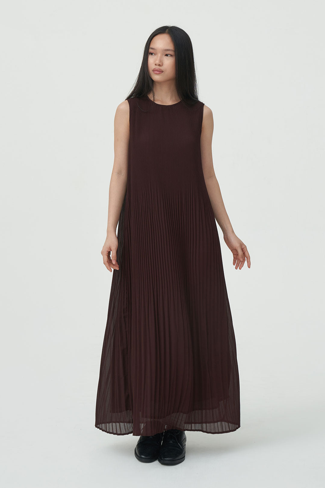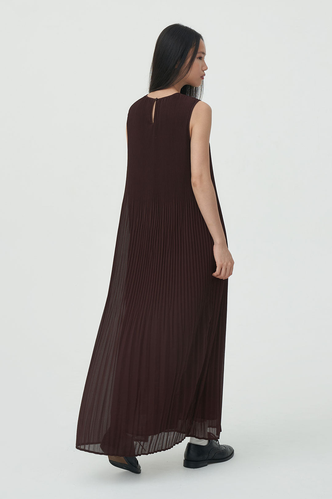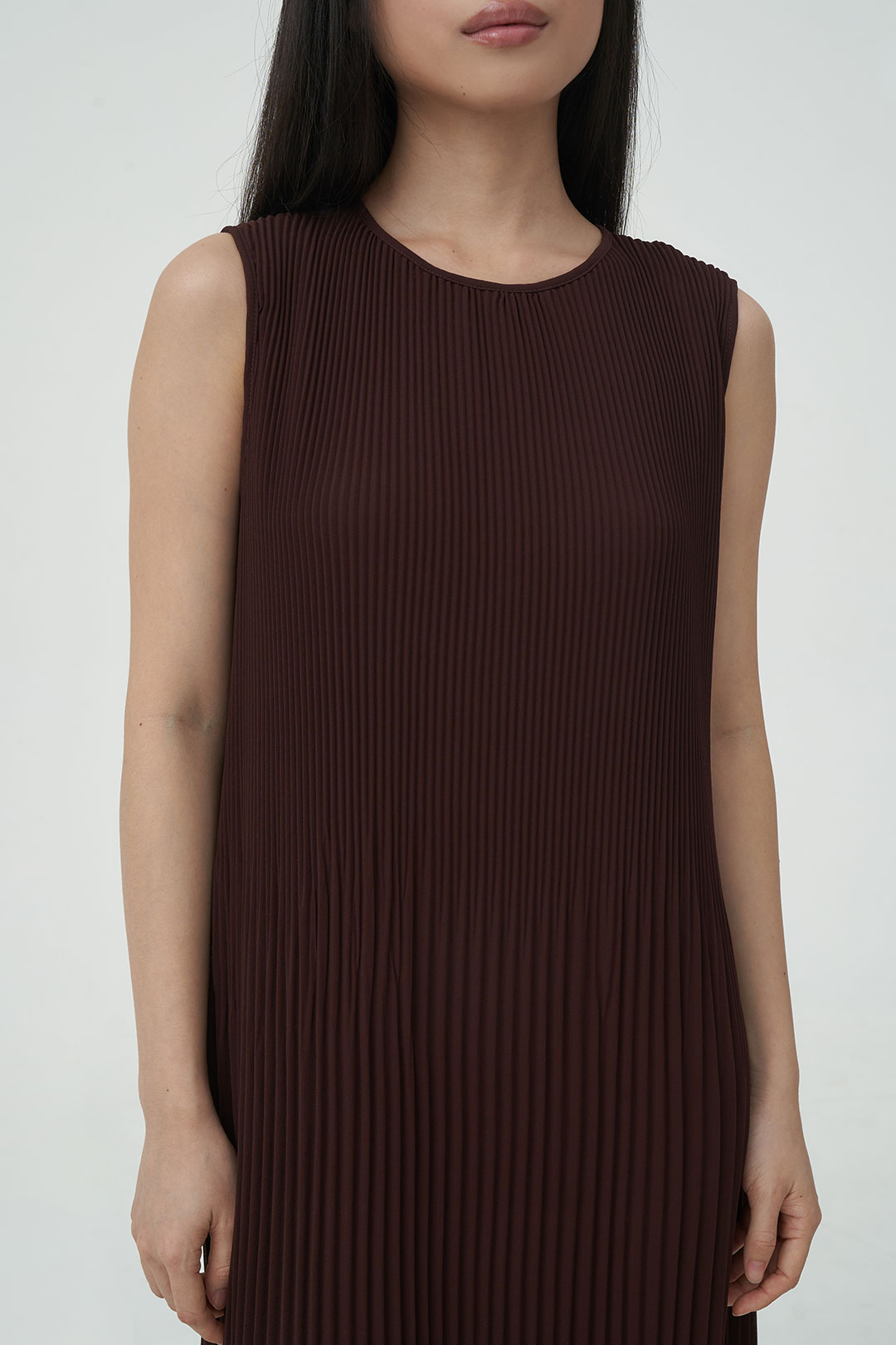 - Sleeveless pleated dress with a soft, flowing silhouette that moves beautifully with every step.
