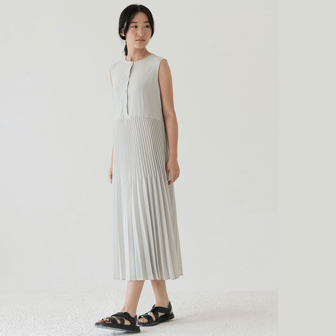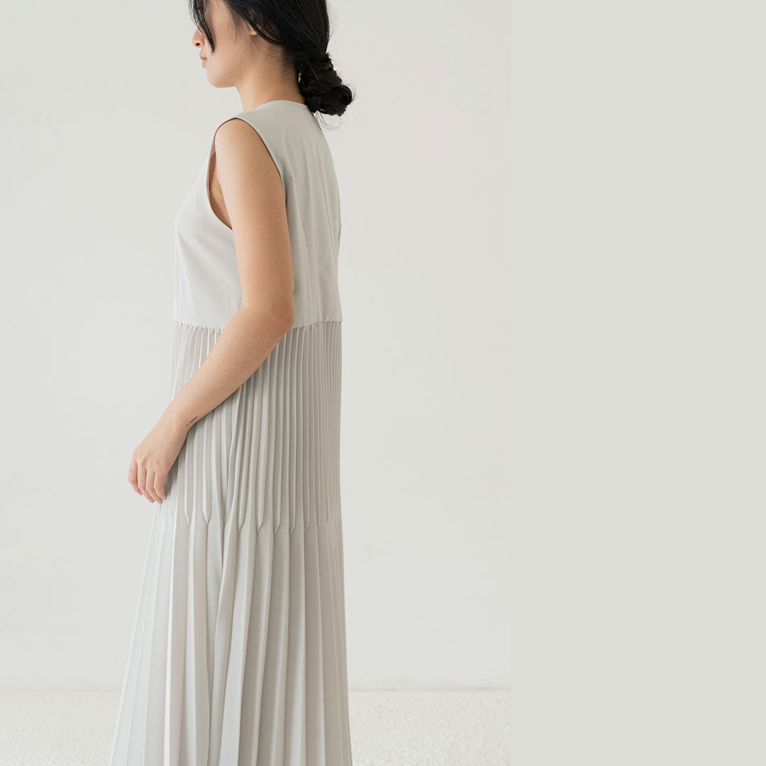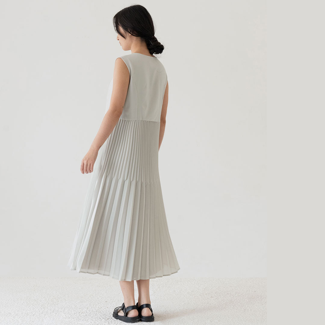 - Sleeveless and finely pleated skirt for a refined silhouette.