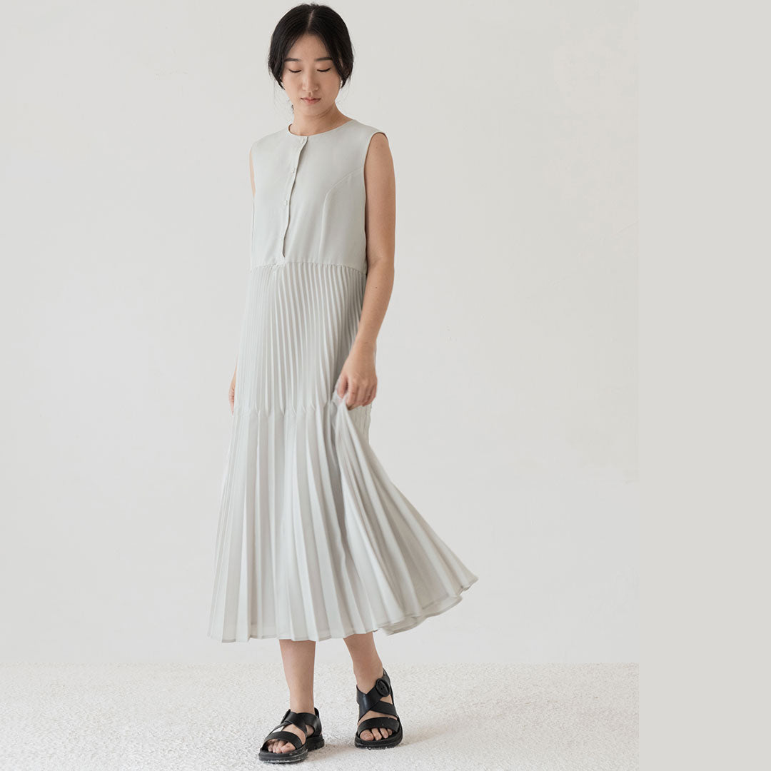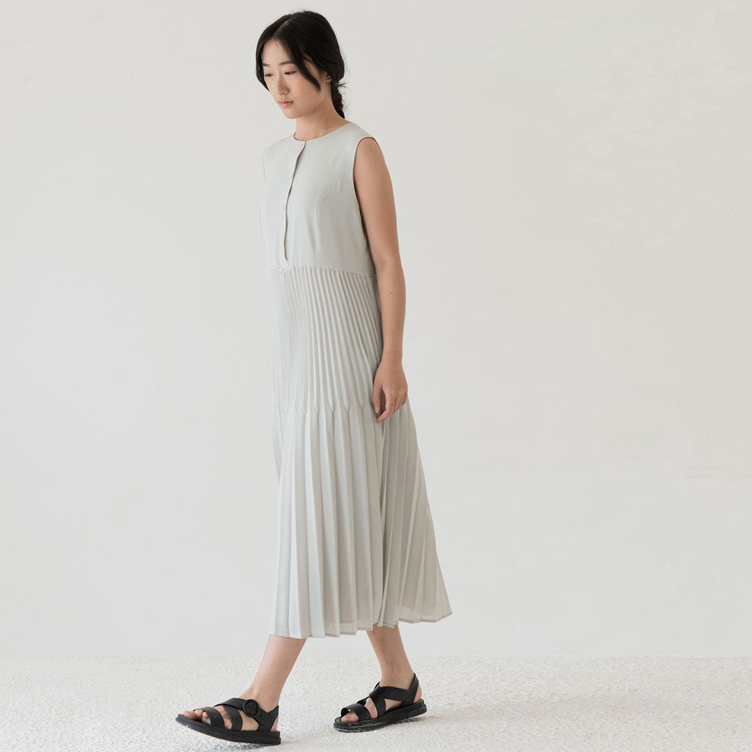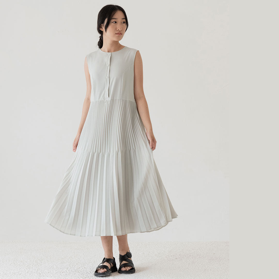 - Sleeveless and finely pleated skirt for a refined silhouette.