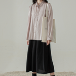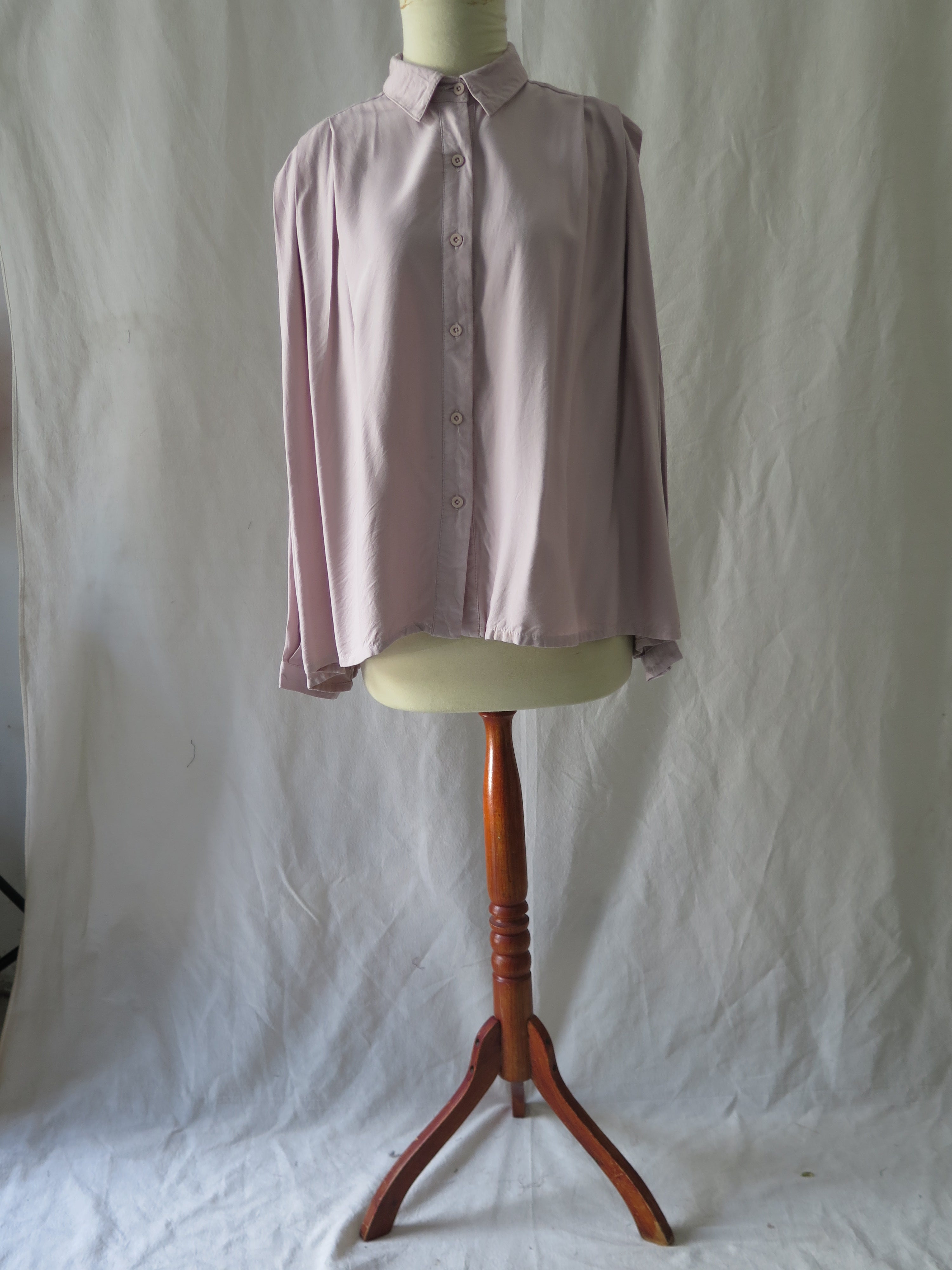 Long sleeved shirt with front buttons opening and pleated detail at the shoulders.