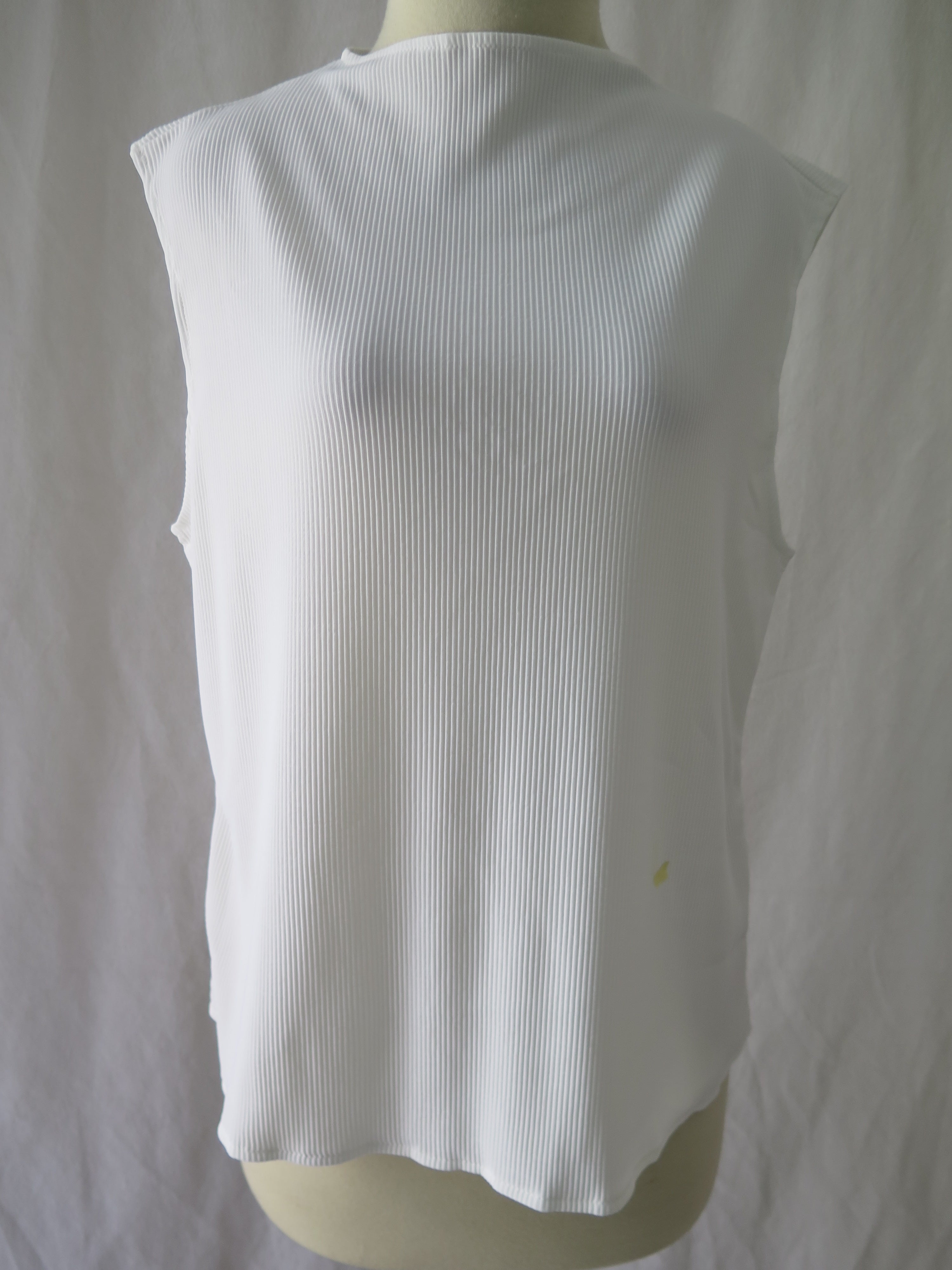 High neckline and sleeveless cut for a clean, modern silhouette.