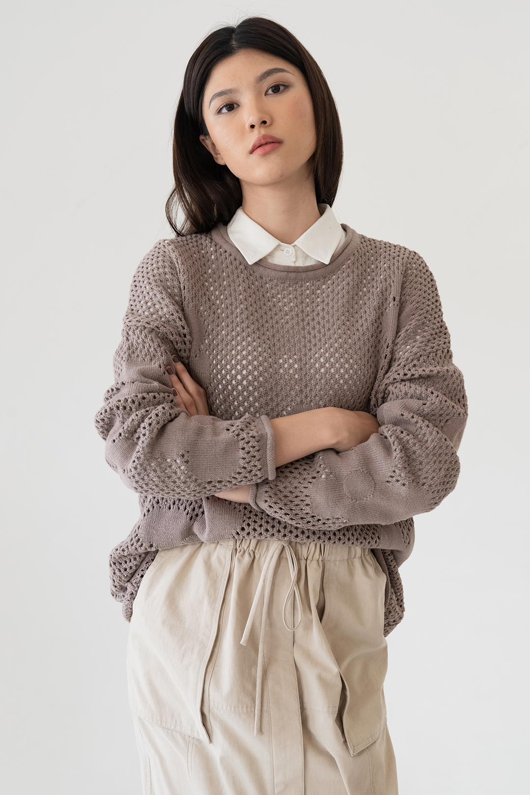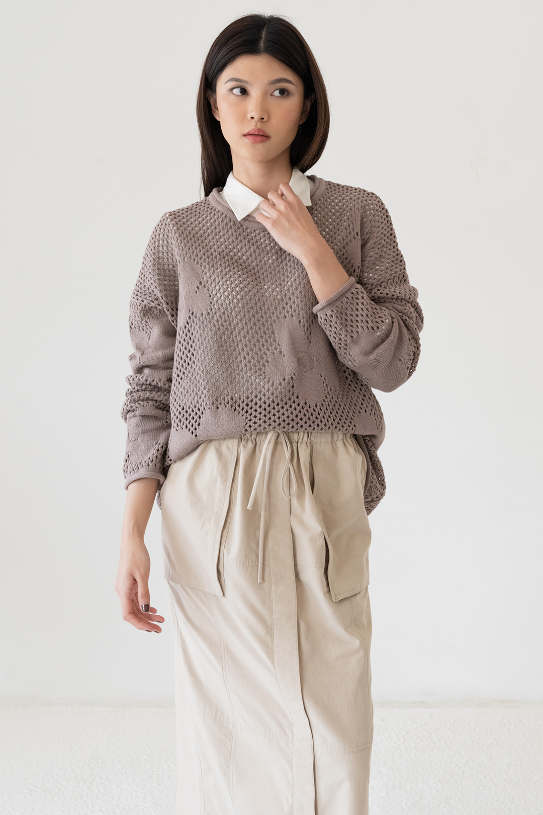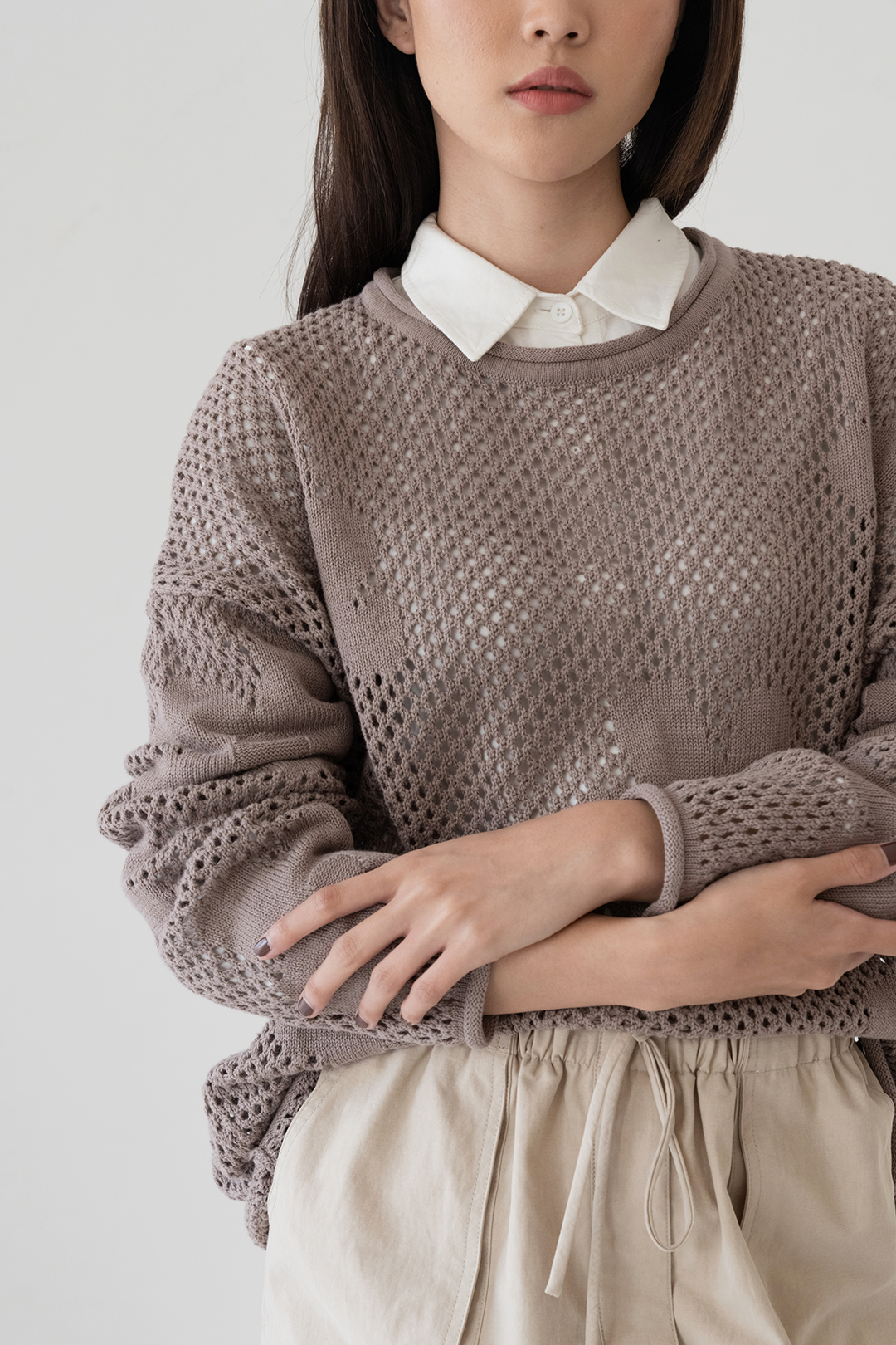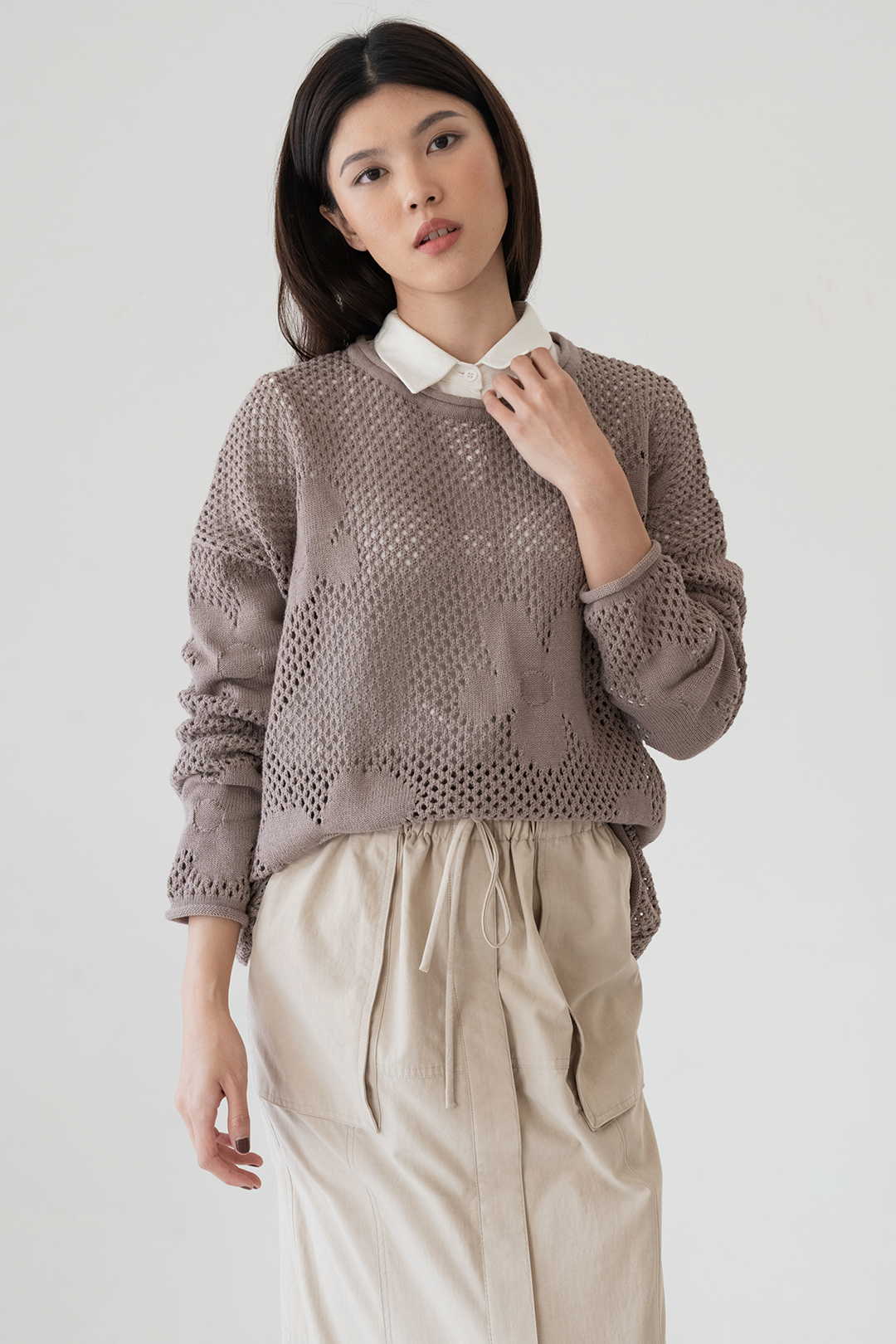 - Long-sleeve knit top with open weave and floral details, perfect for layering.