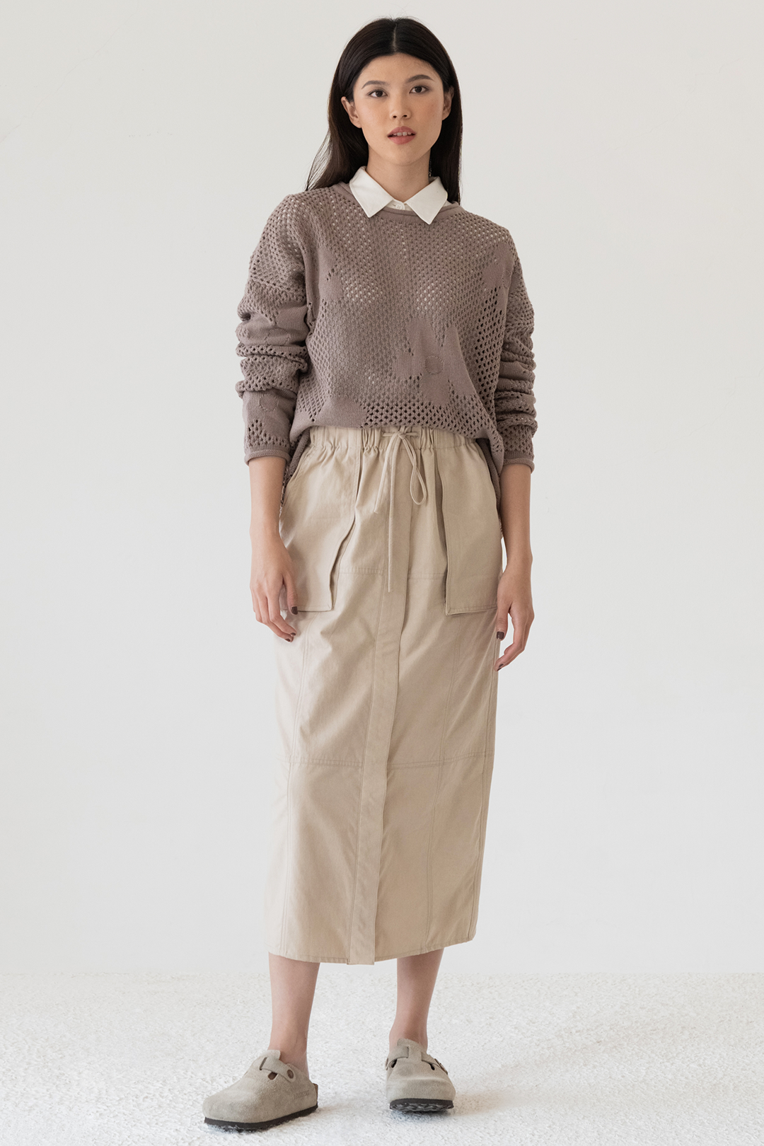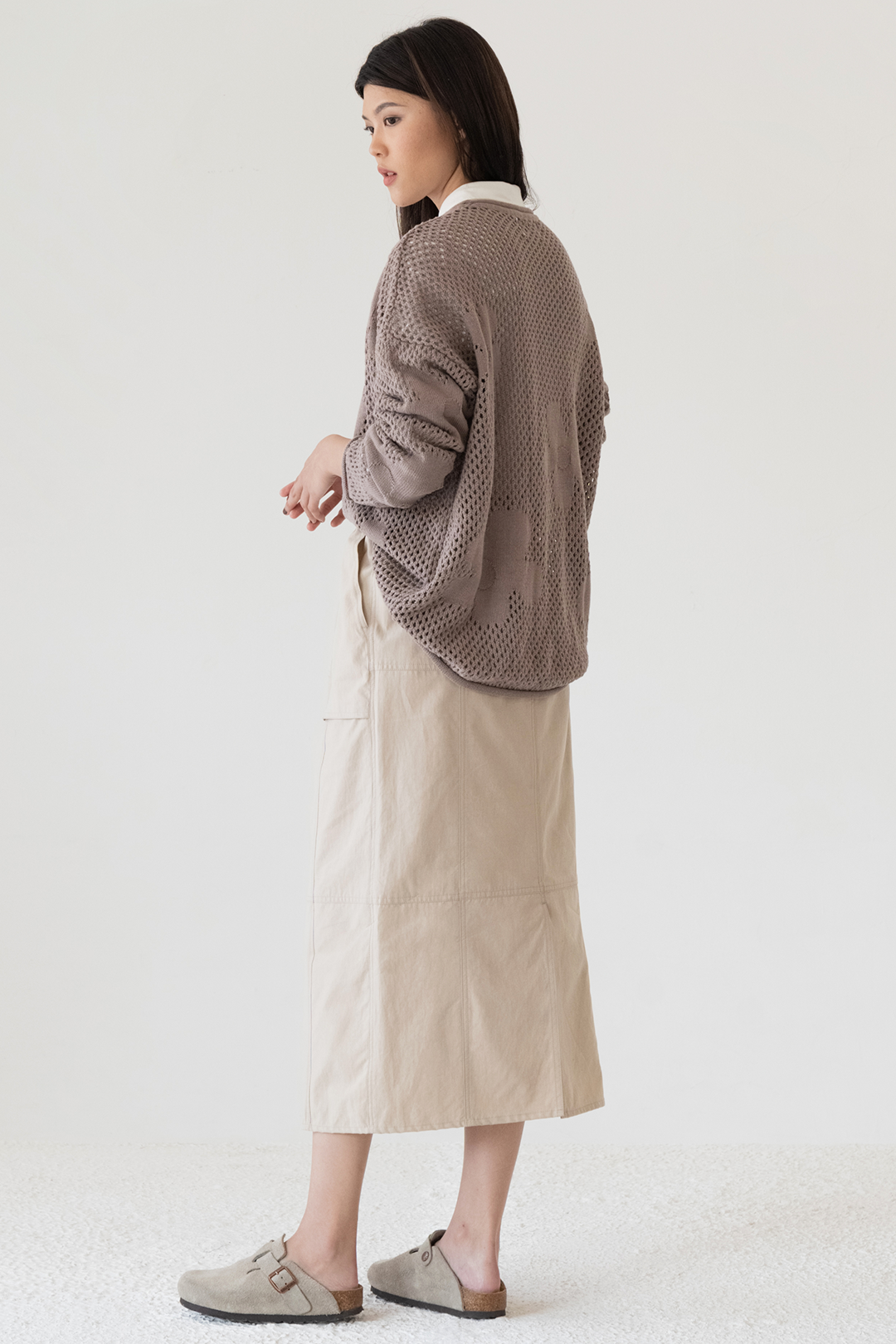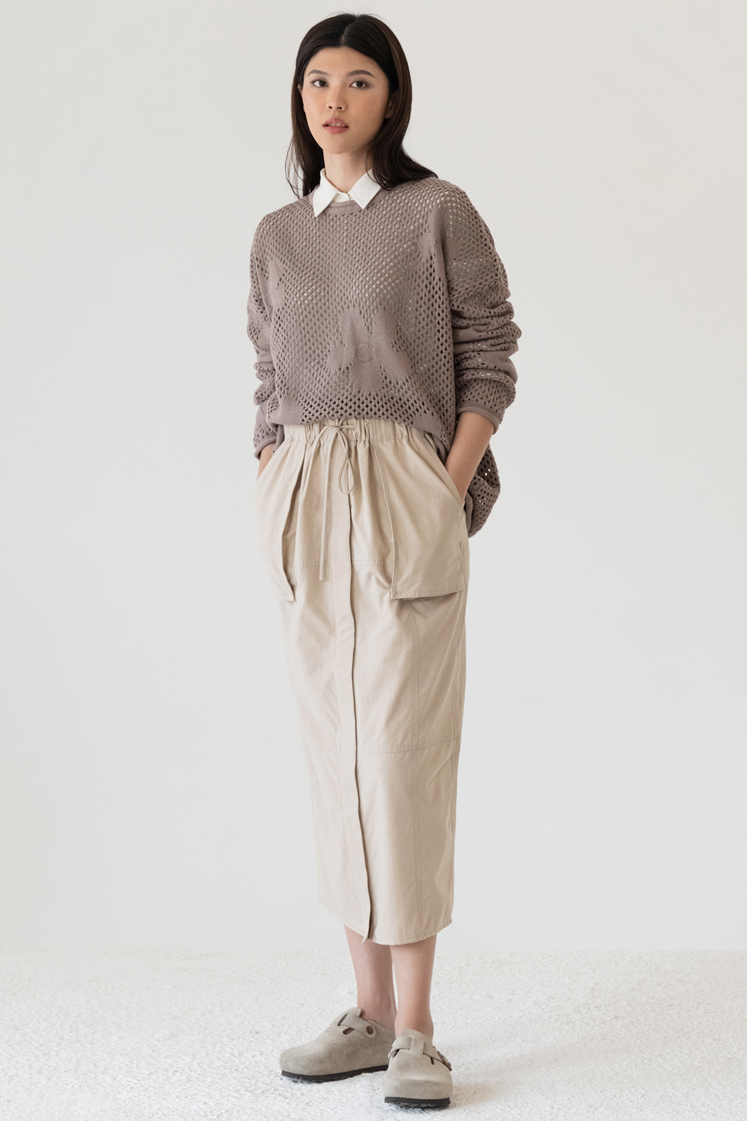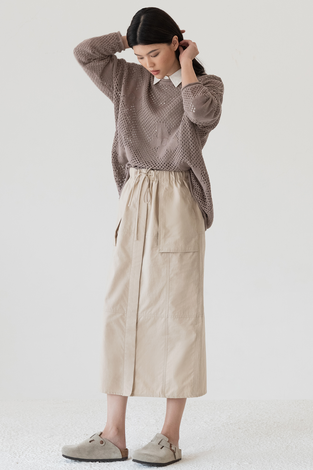- Long-sleeve knit top with open weave and floral details, perfect for layering.