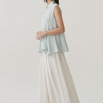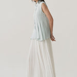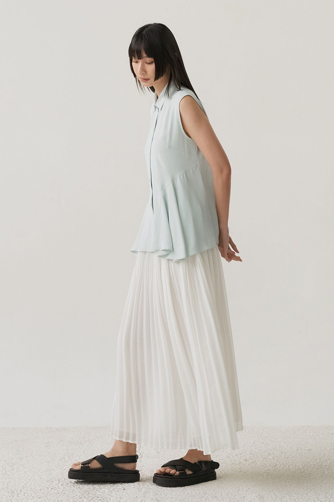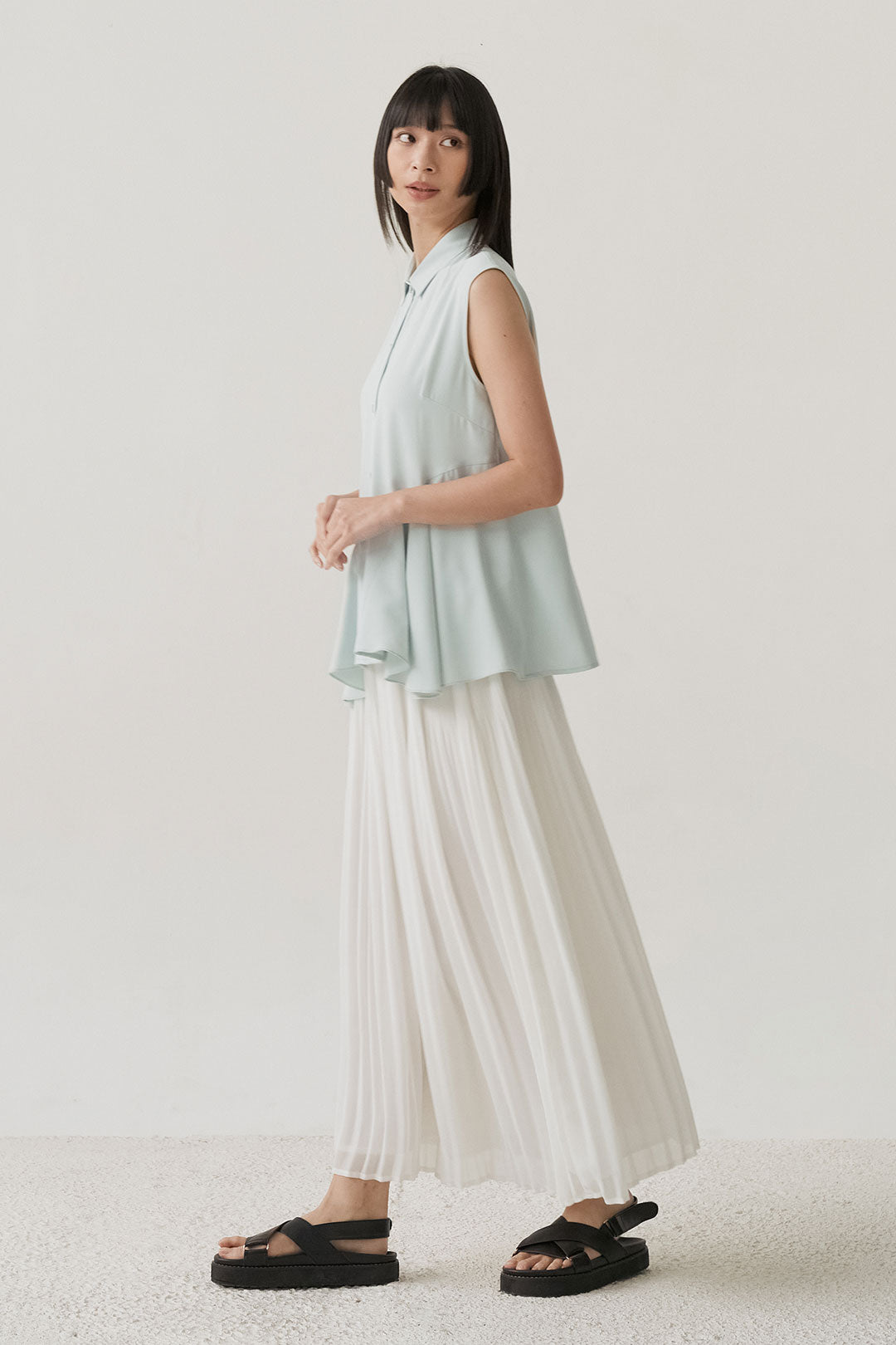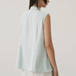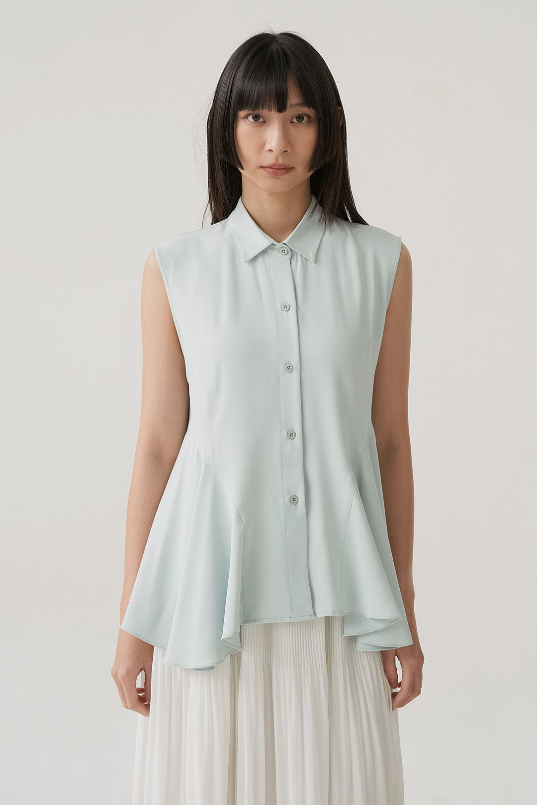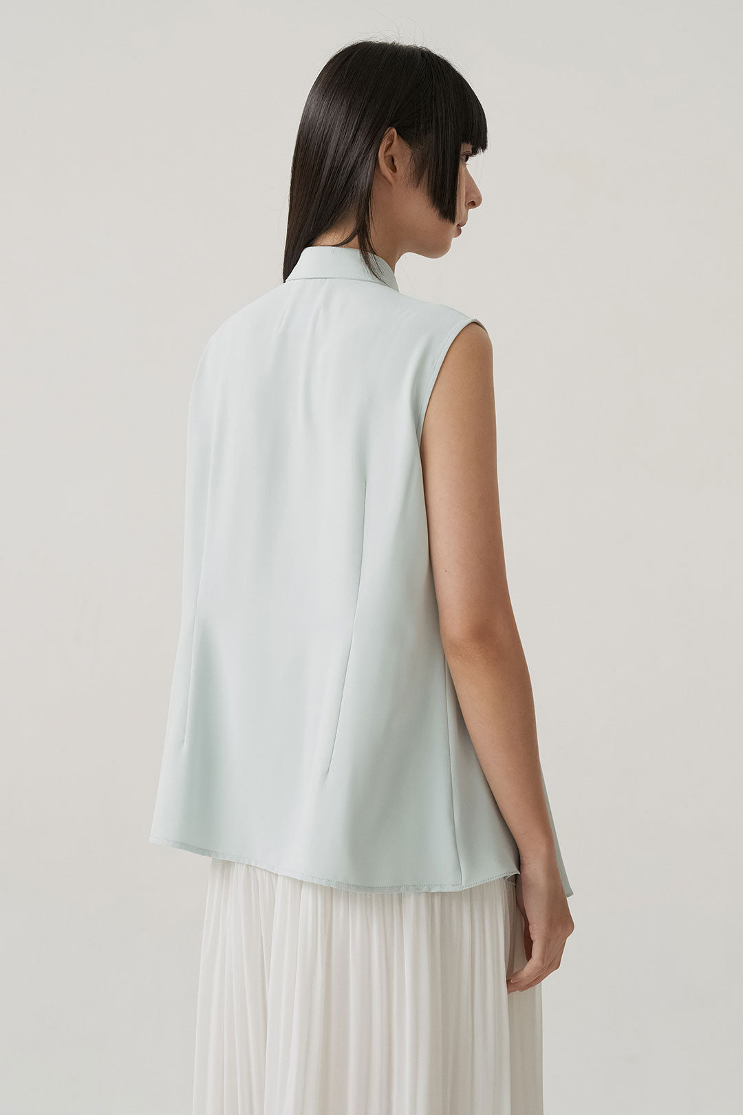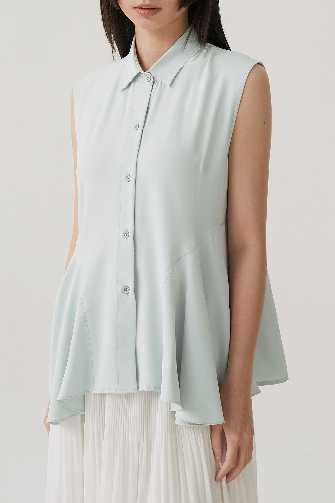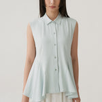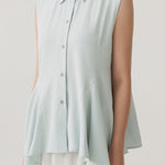 - Sleeveless shirt design with structured collar and full button closure