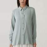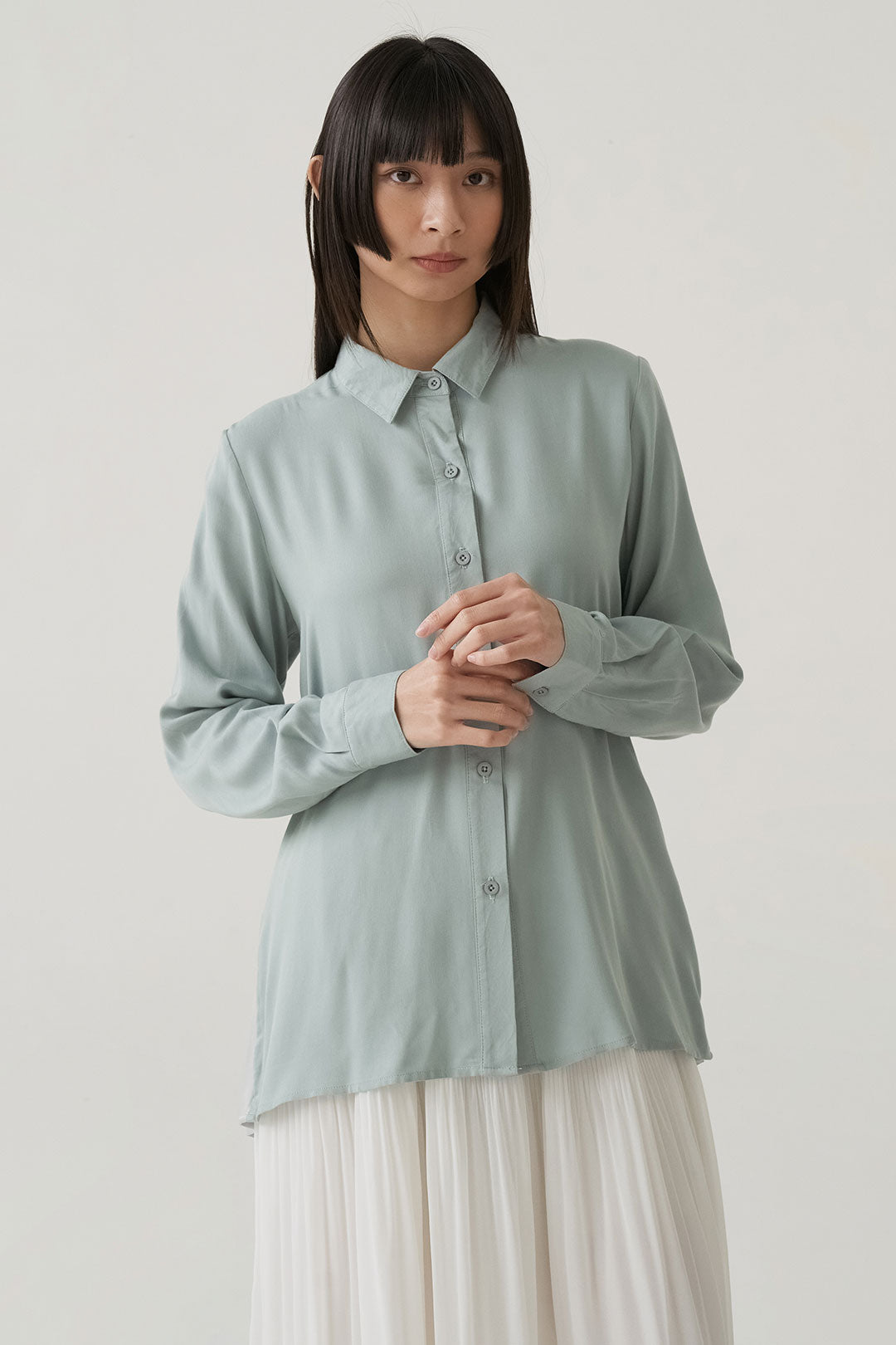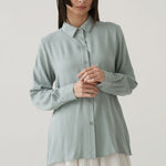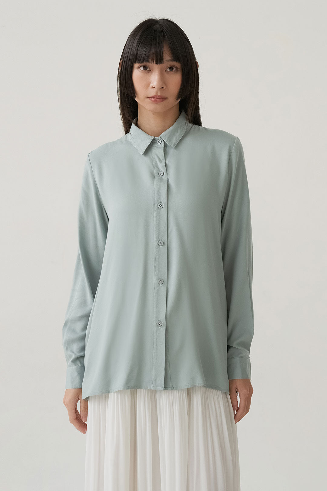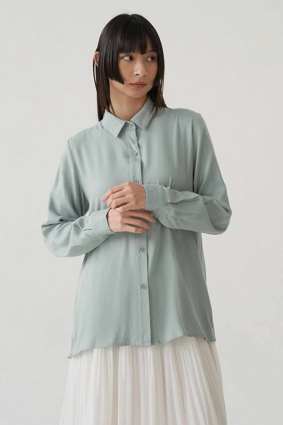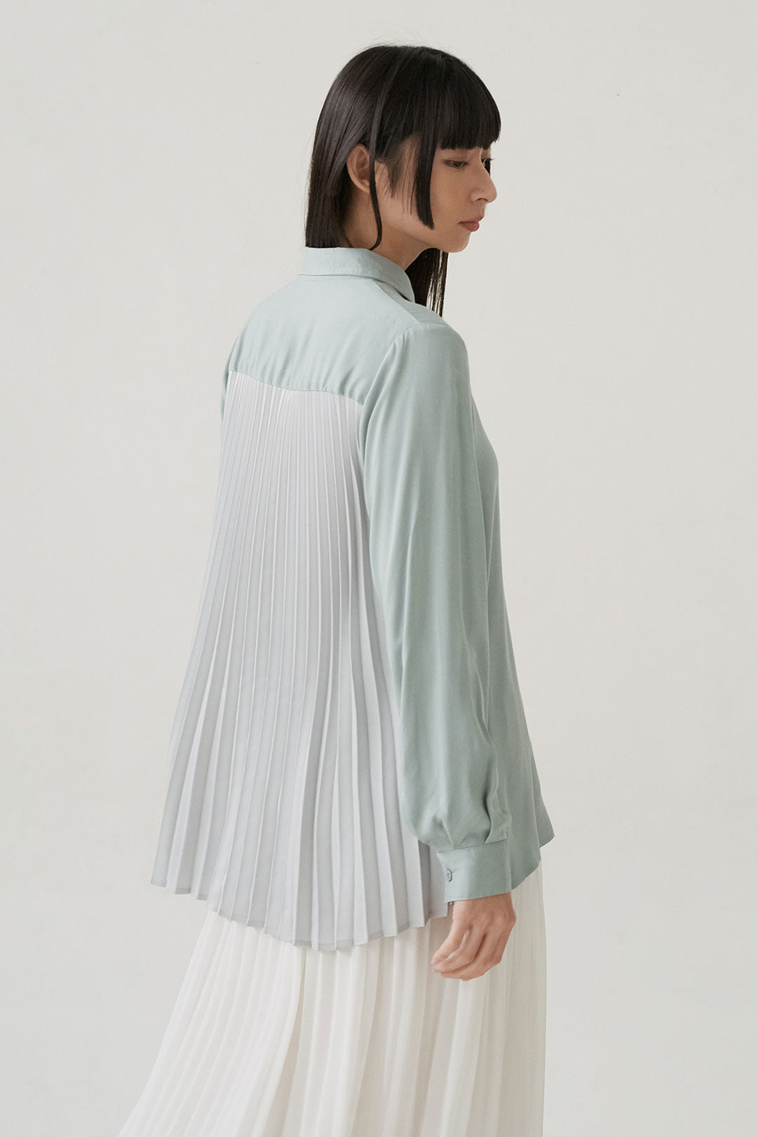 - Button-down shirt with a clean front and pleated back panel, structured yet relaxed