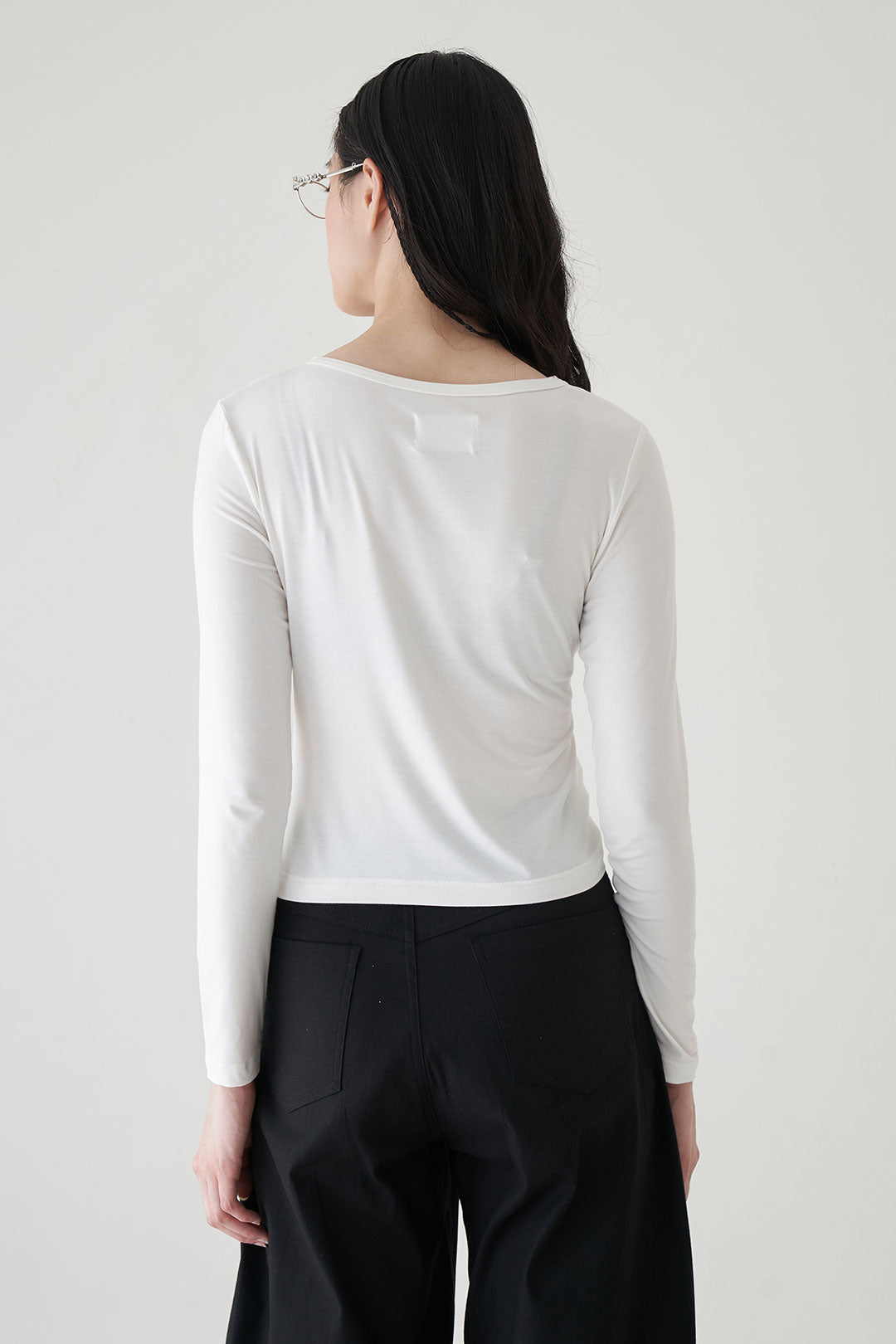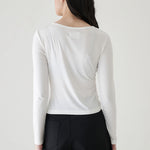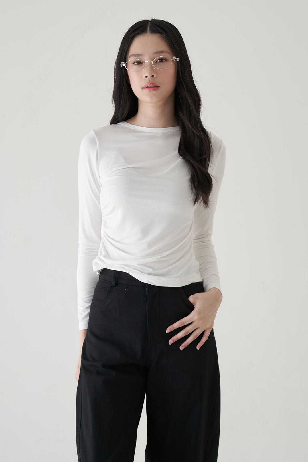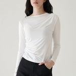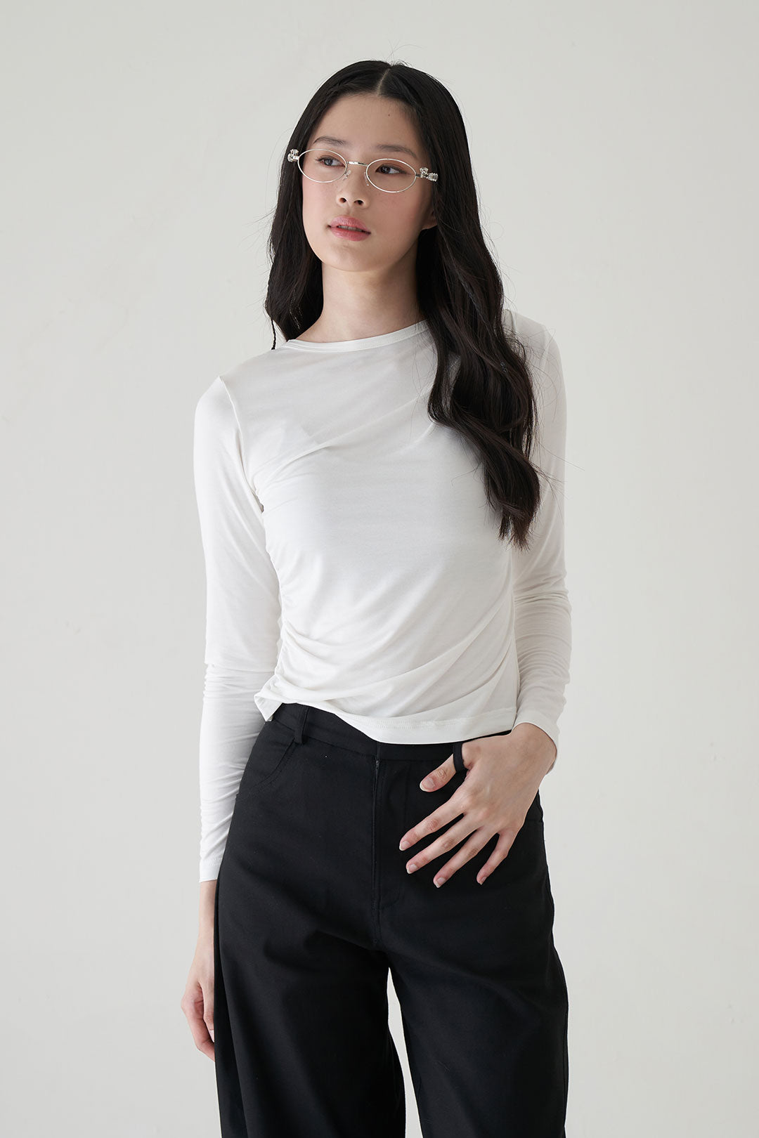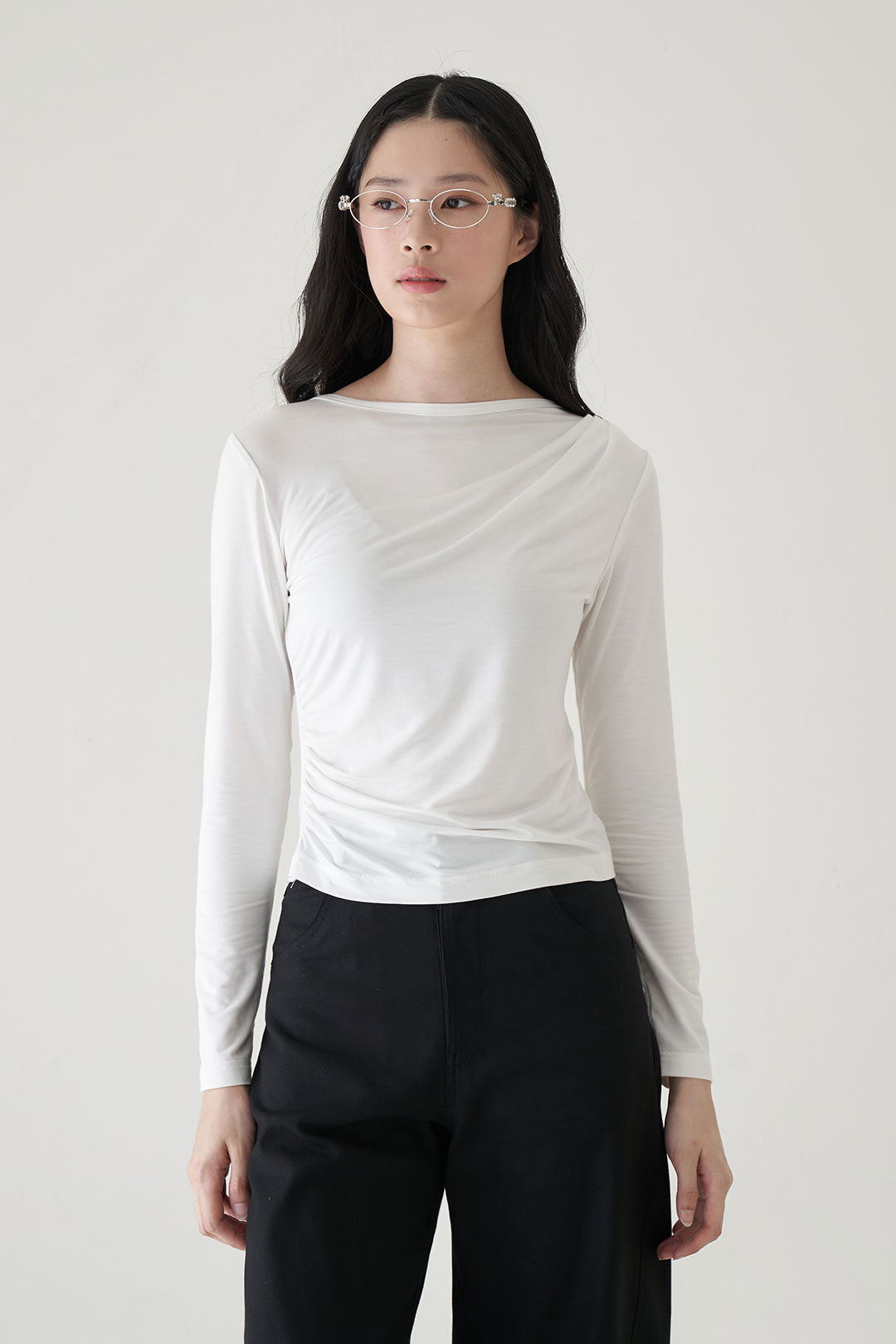 - Long sleeve top with asymmetric draping that flows diagonally from shoulder to waist