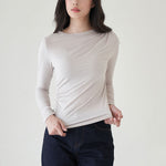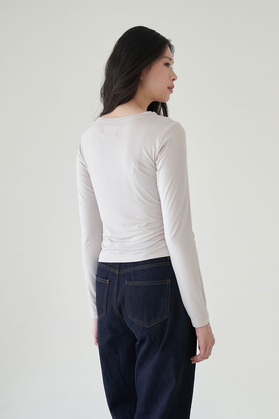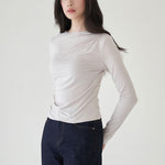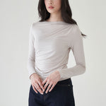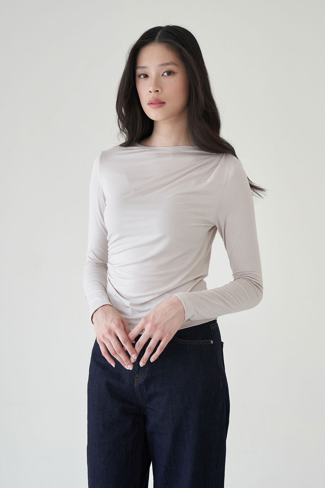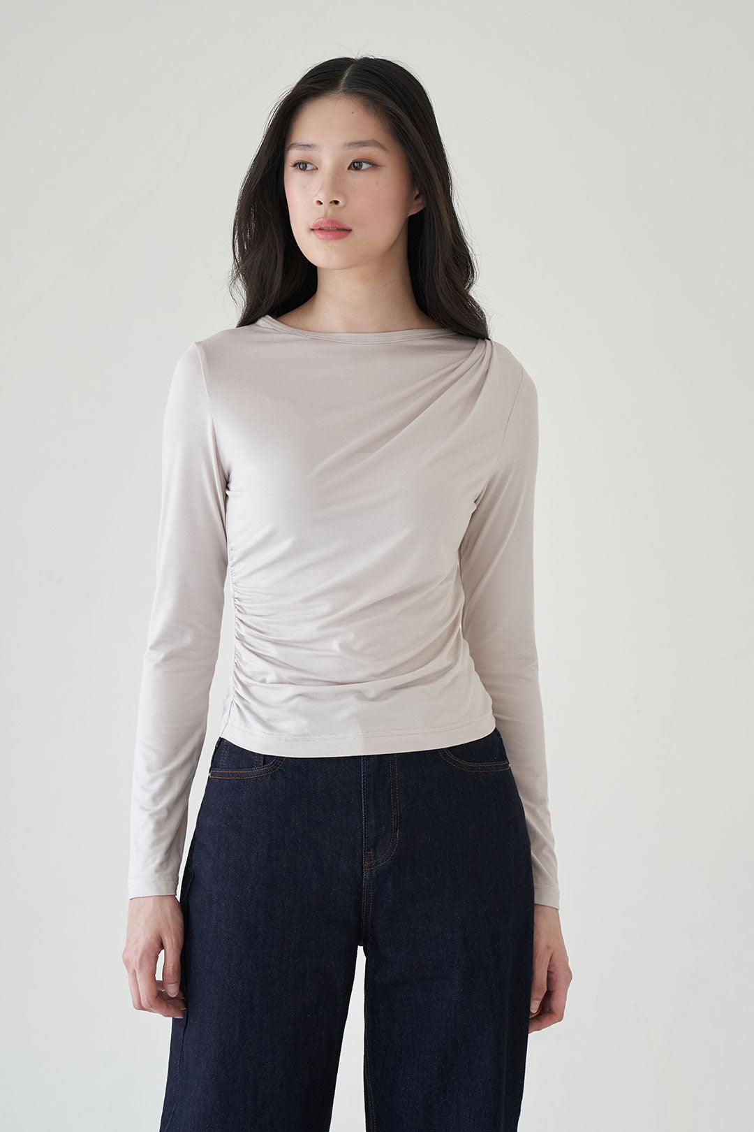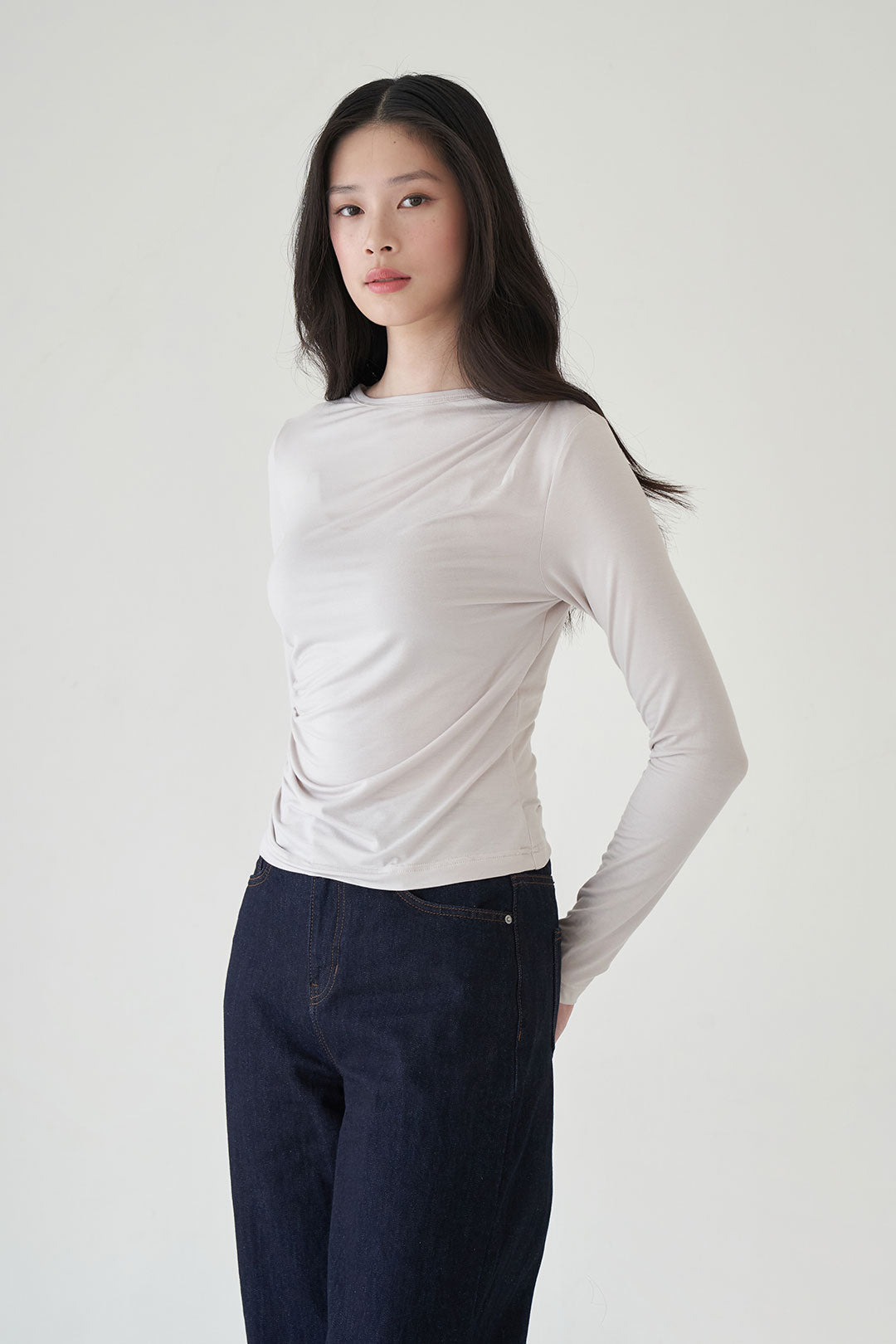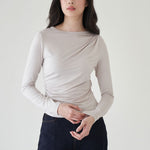 - Long sleeve top with asymmetric draping that flows diagonally from shoulder to waist
