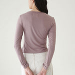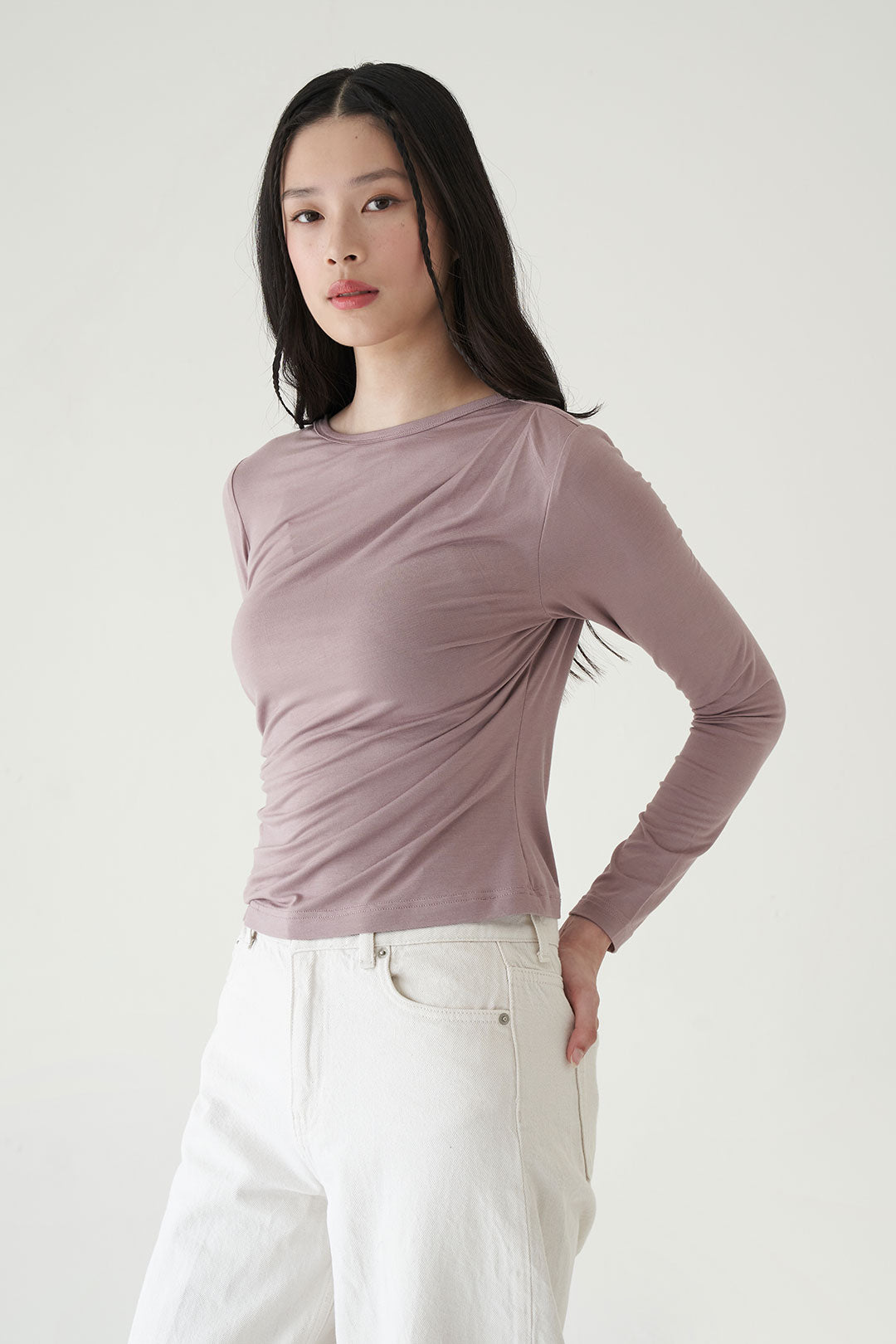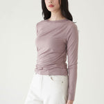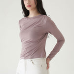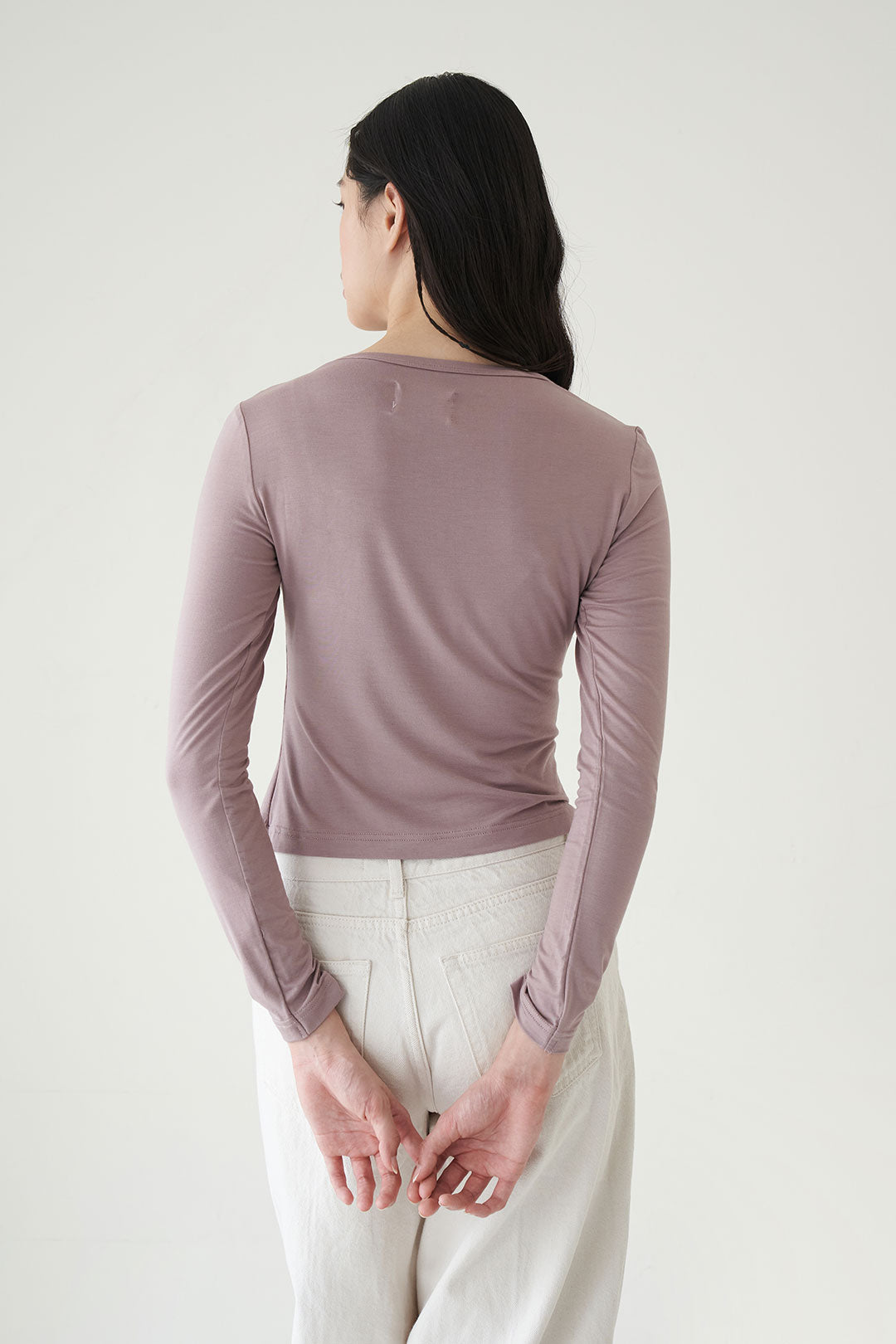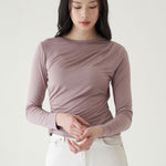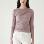 - Long sleeve top with asymmetric draping that flows diagonally from shoulder to waist