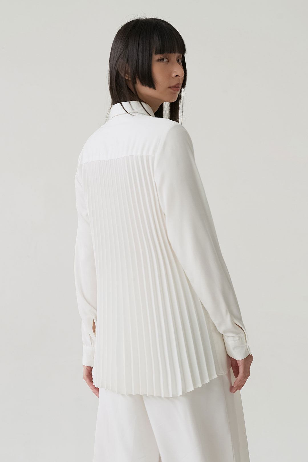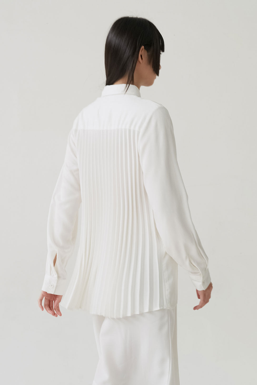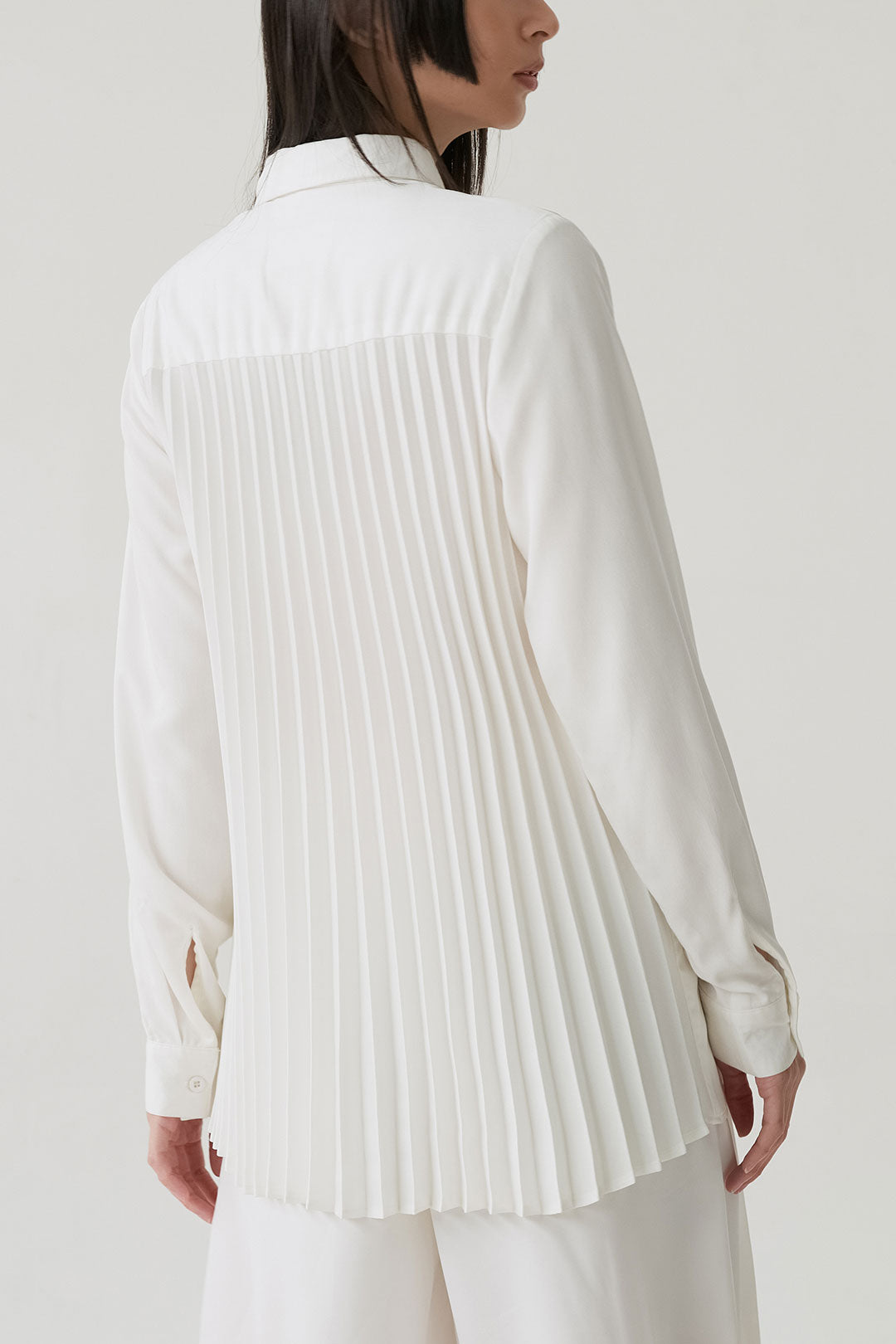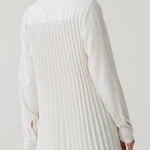 - Button-down shirt with a clean front and pleated back panel, structured yet relaxed