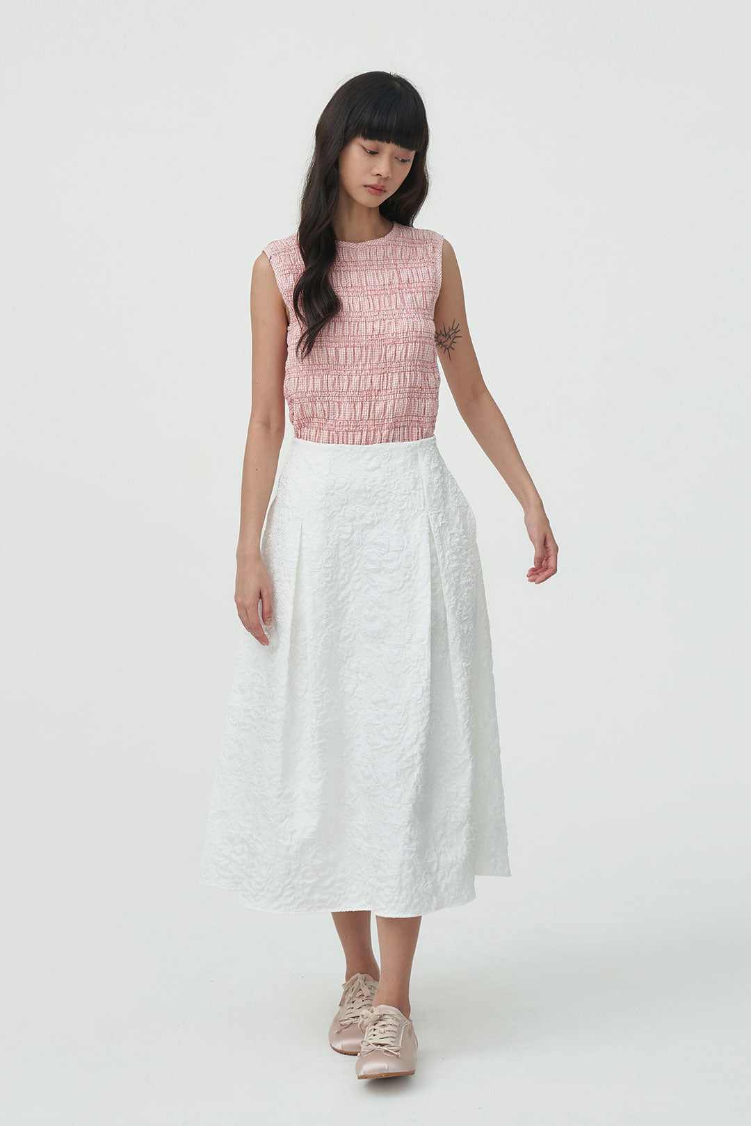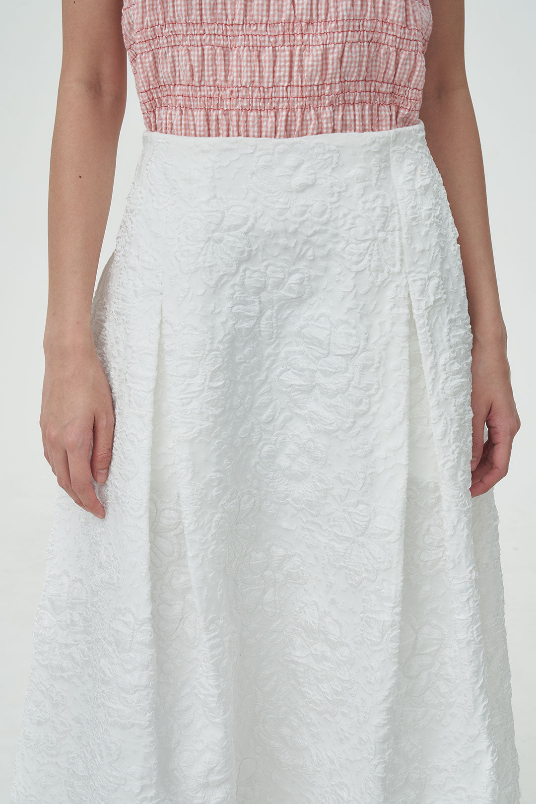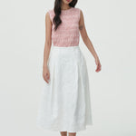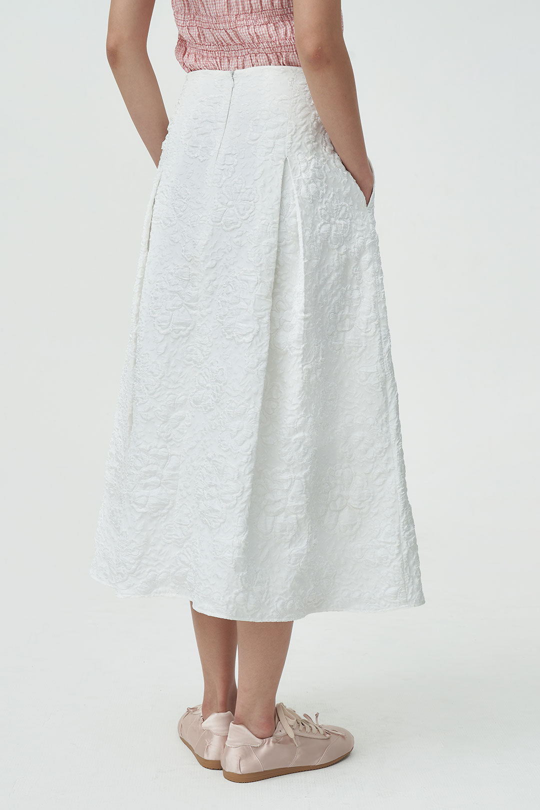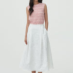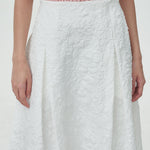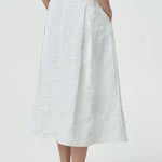 - A midi skirt crafted from textured floral fabric that adds subtle dimension to your look.