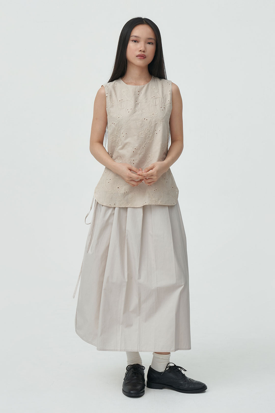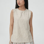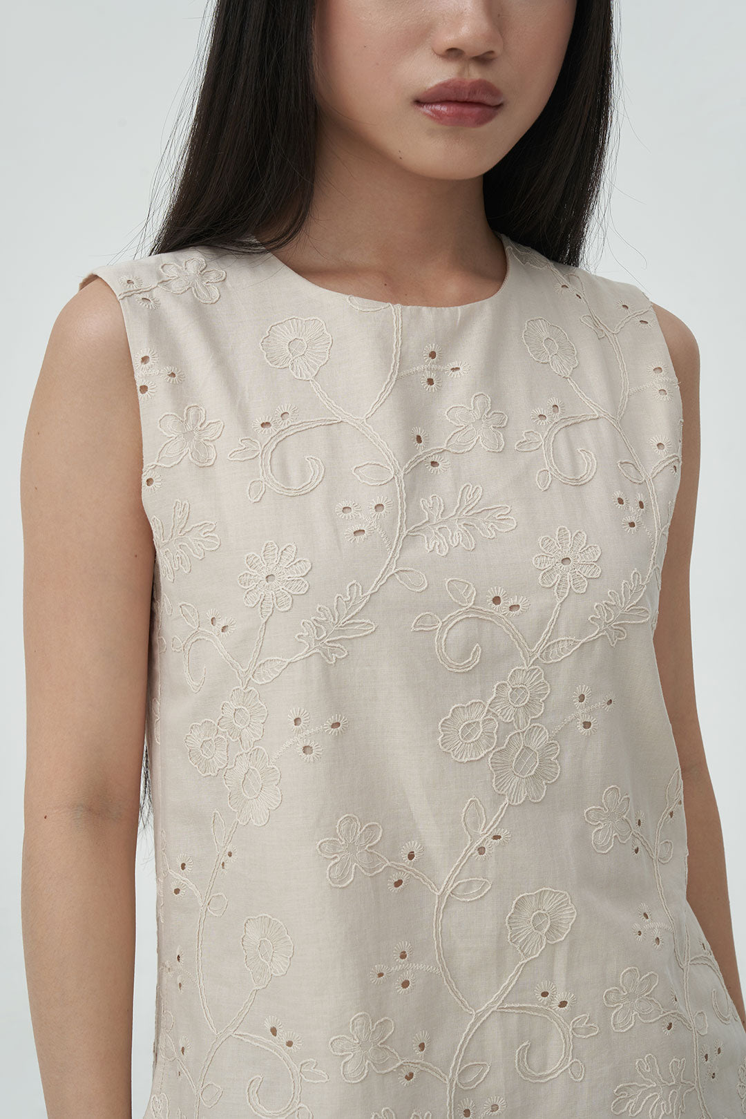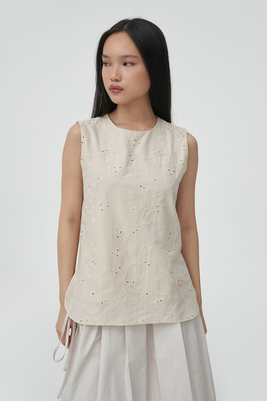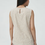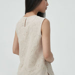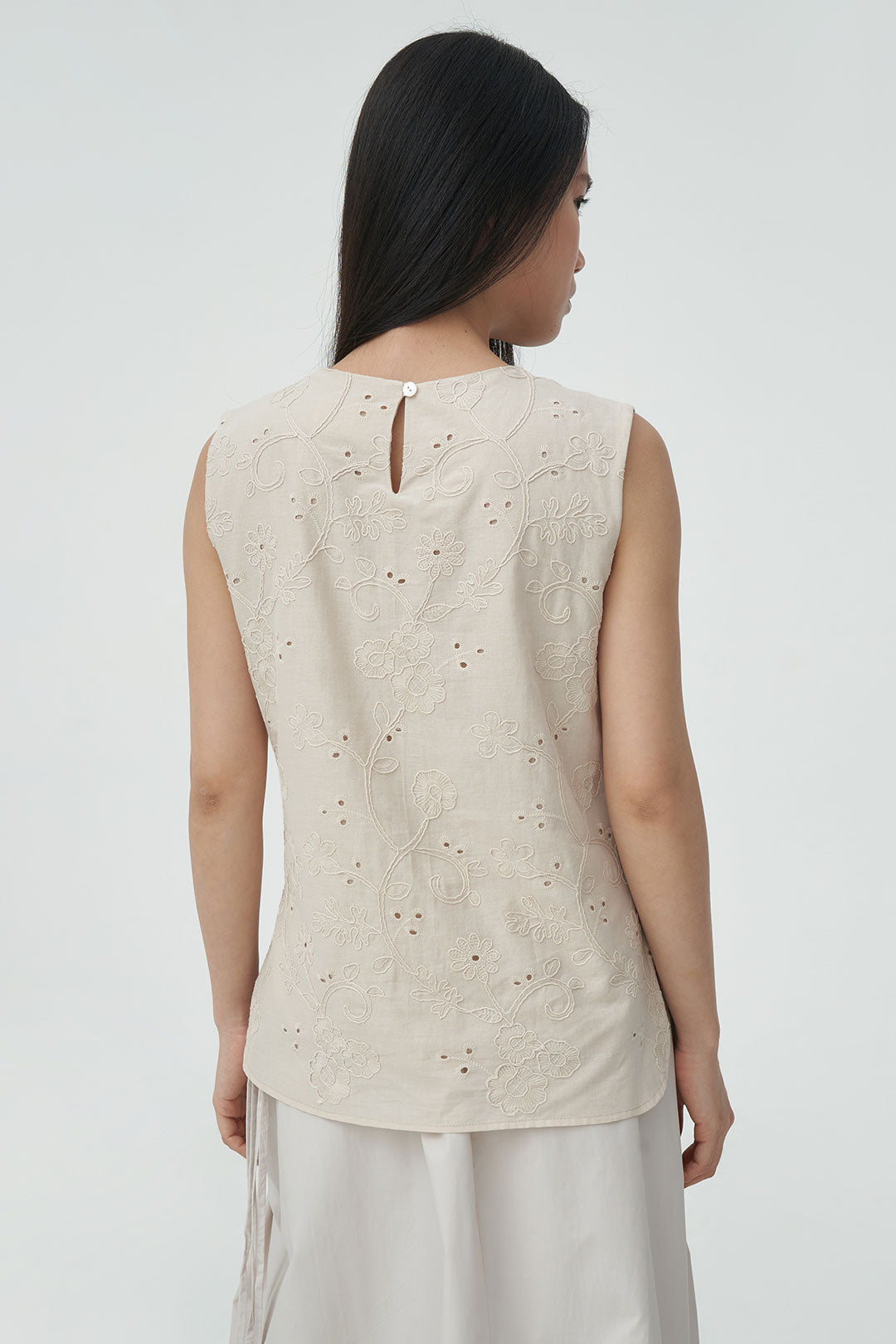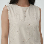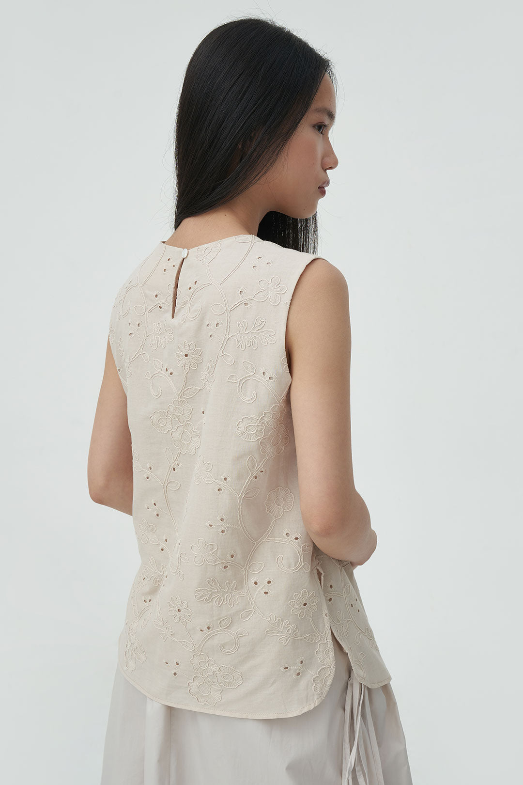 - A sleeveless embroidered top crafted in soft cotton with intricate floral eyelet details throughout.