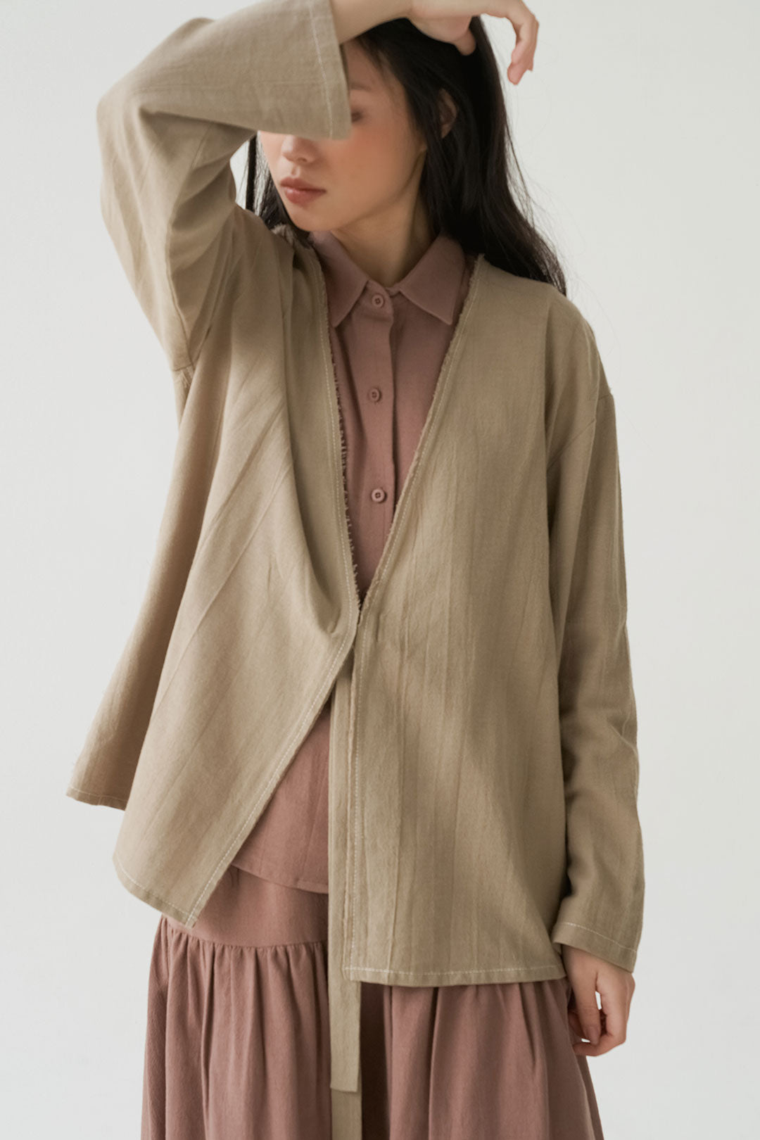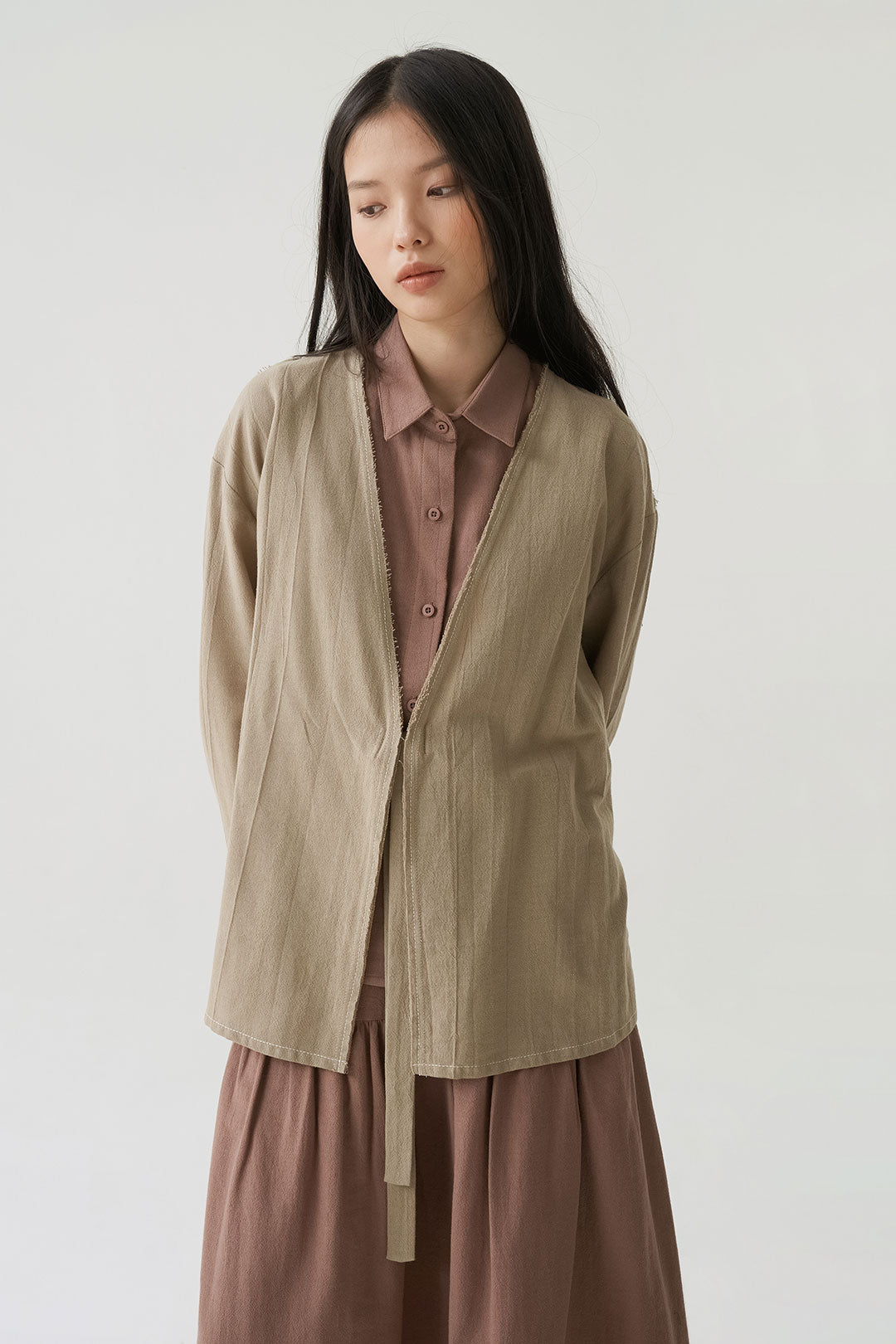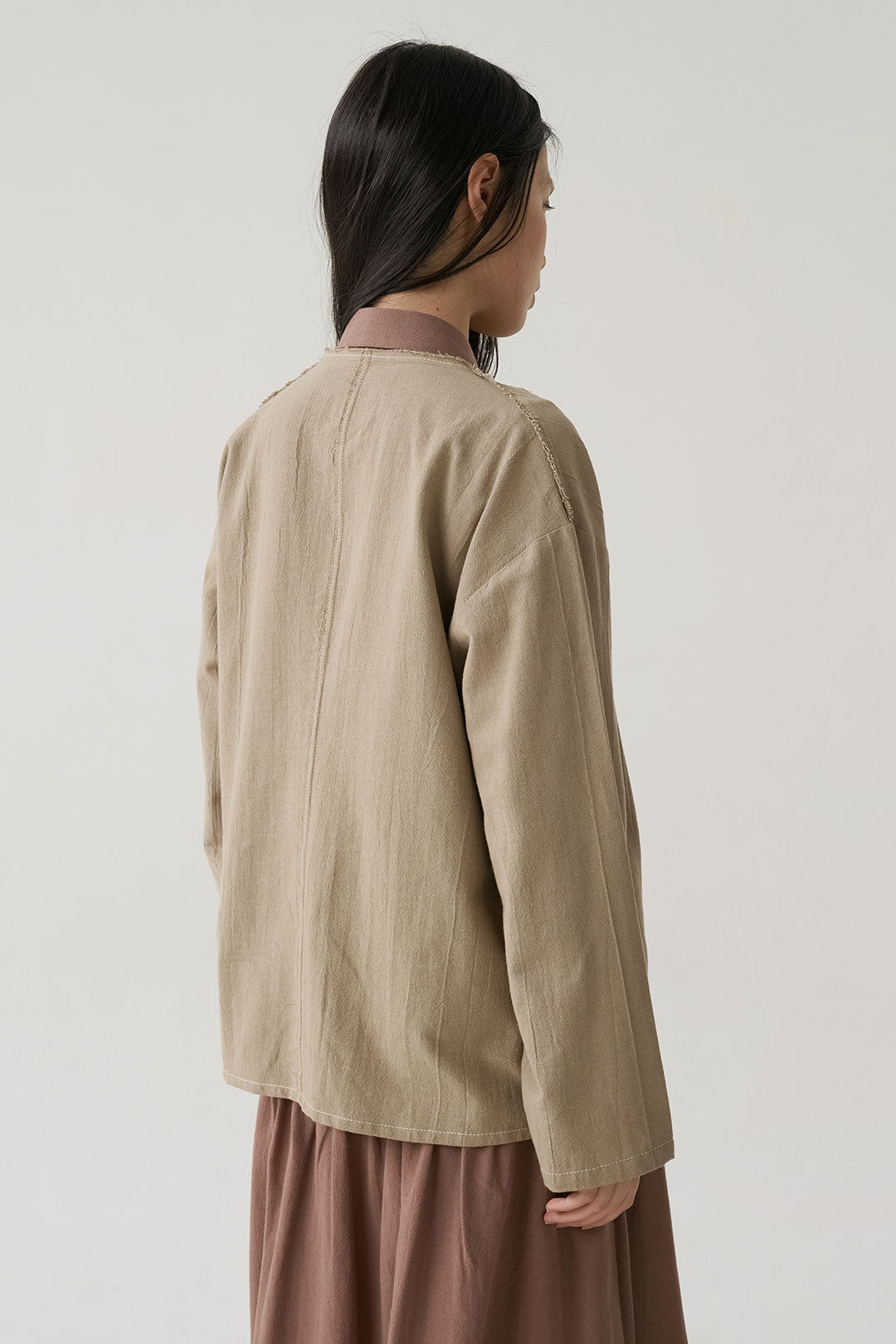 - Raw-edge finishing along the neckline and opening for a subtle, lived-in character