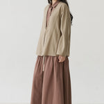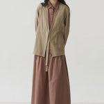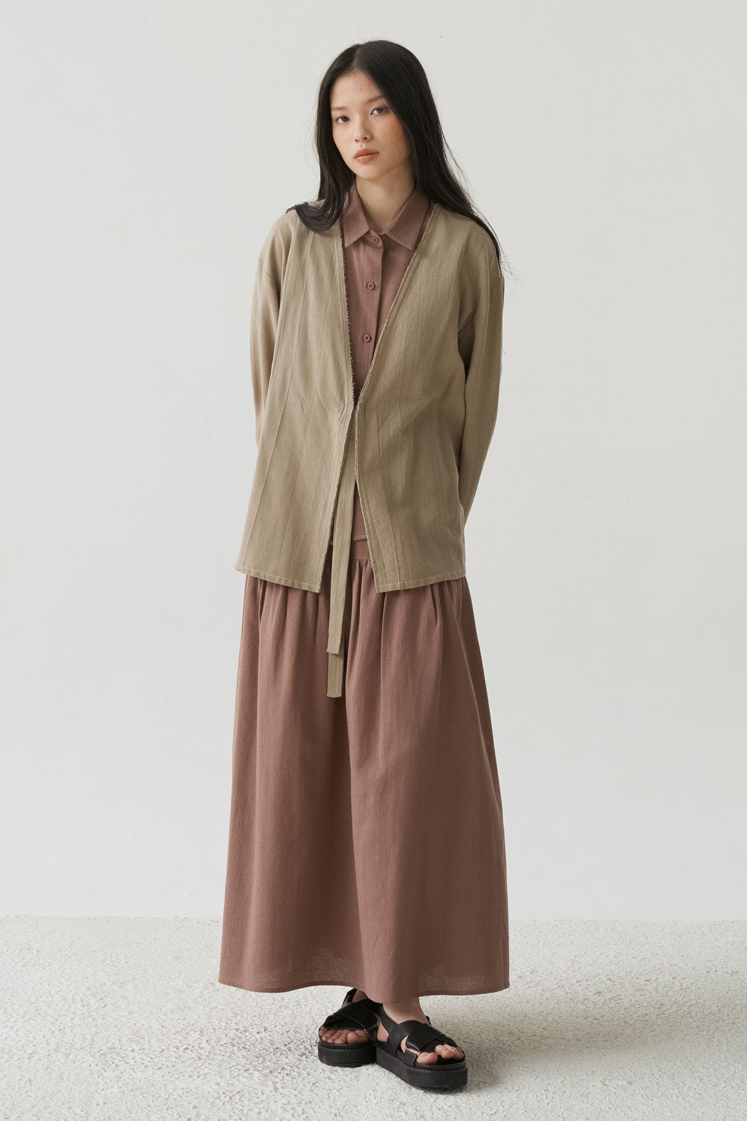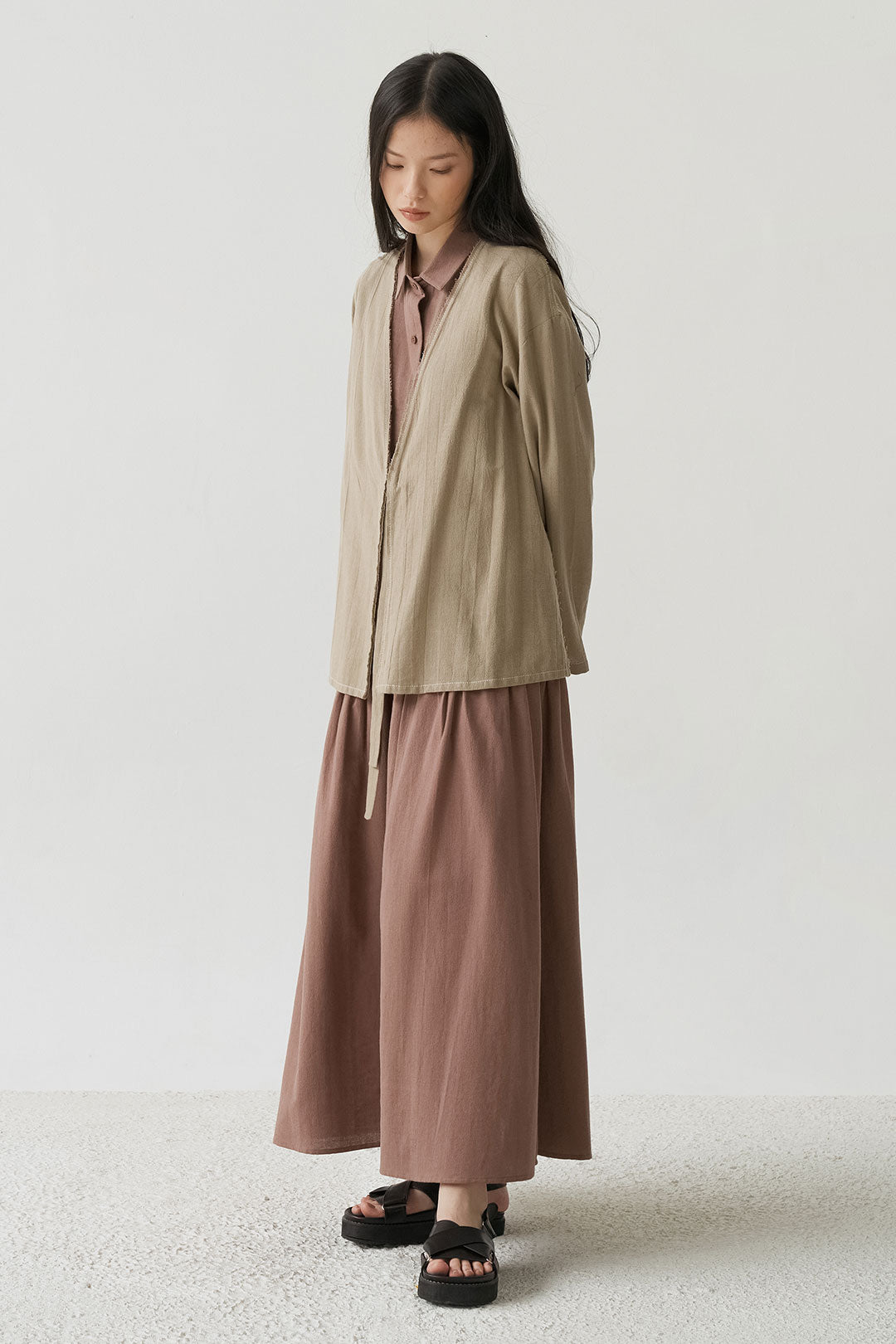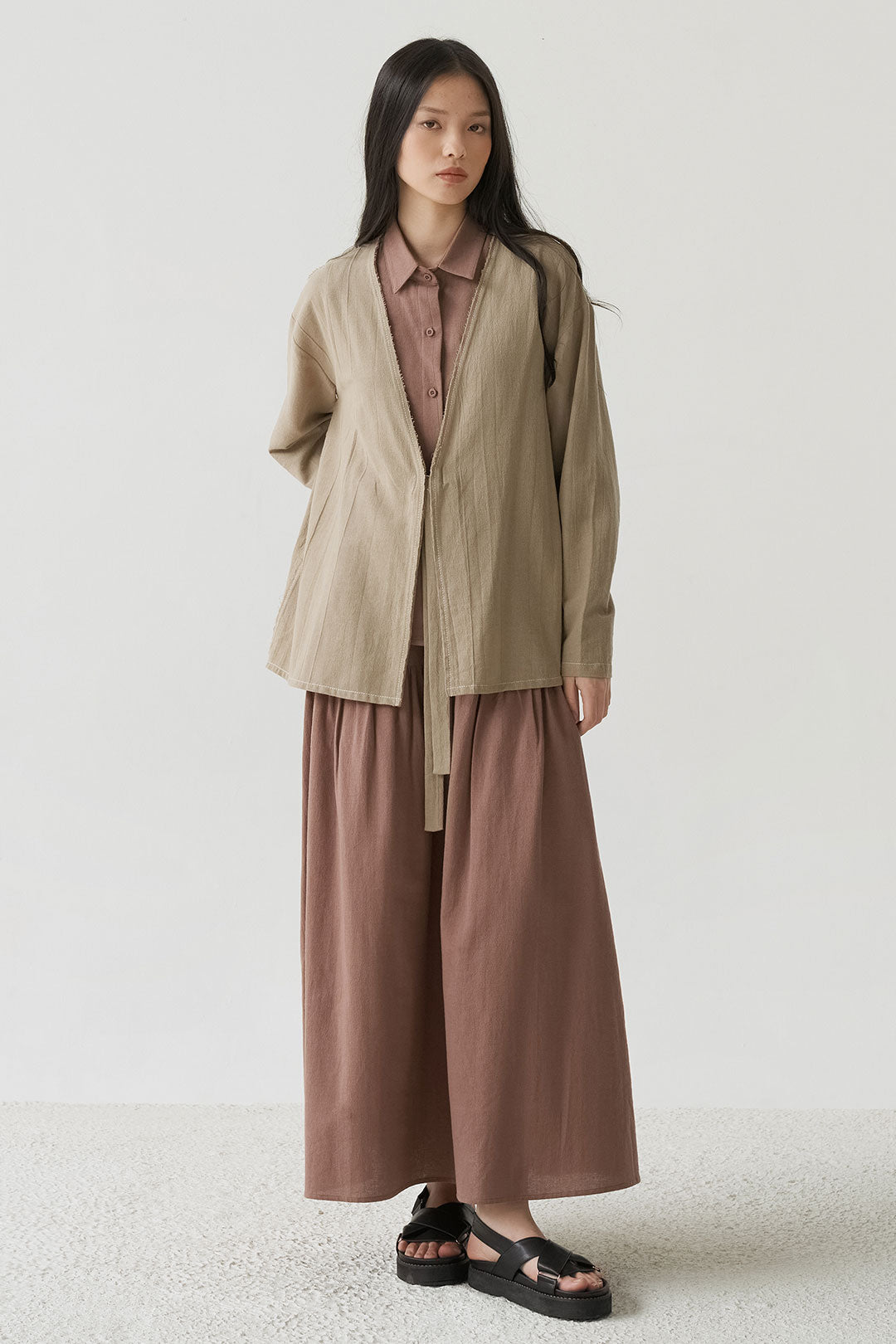 - Raw-edge finishing along the neckline and opening for a subtle, lived-in character