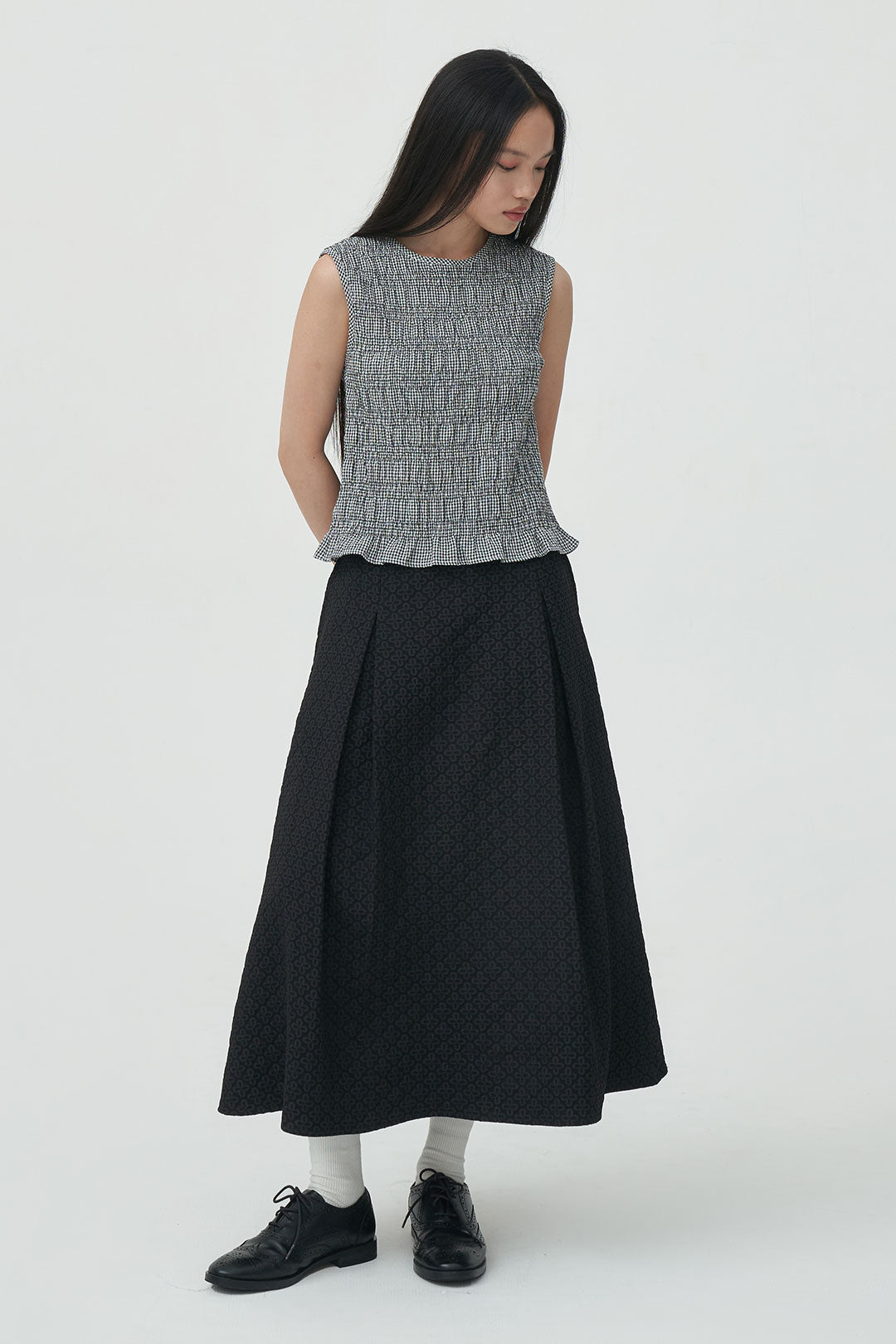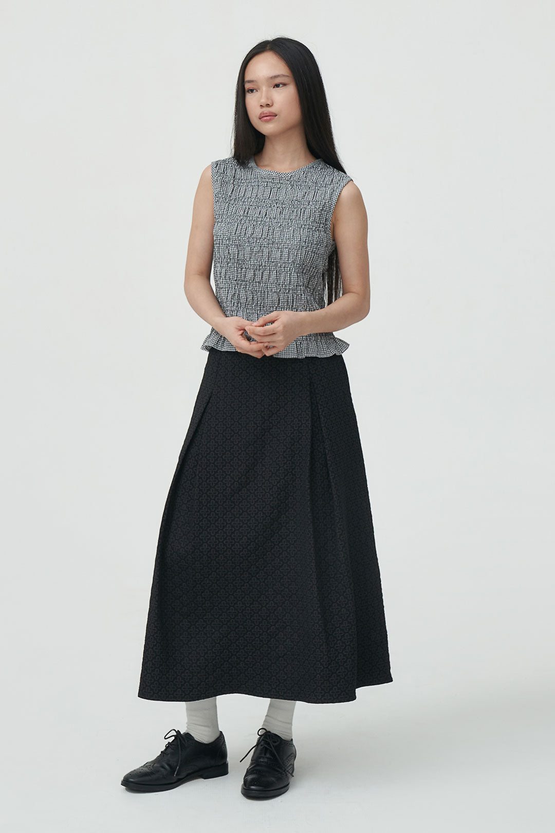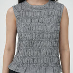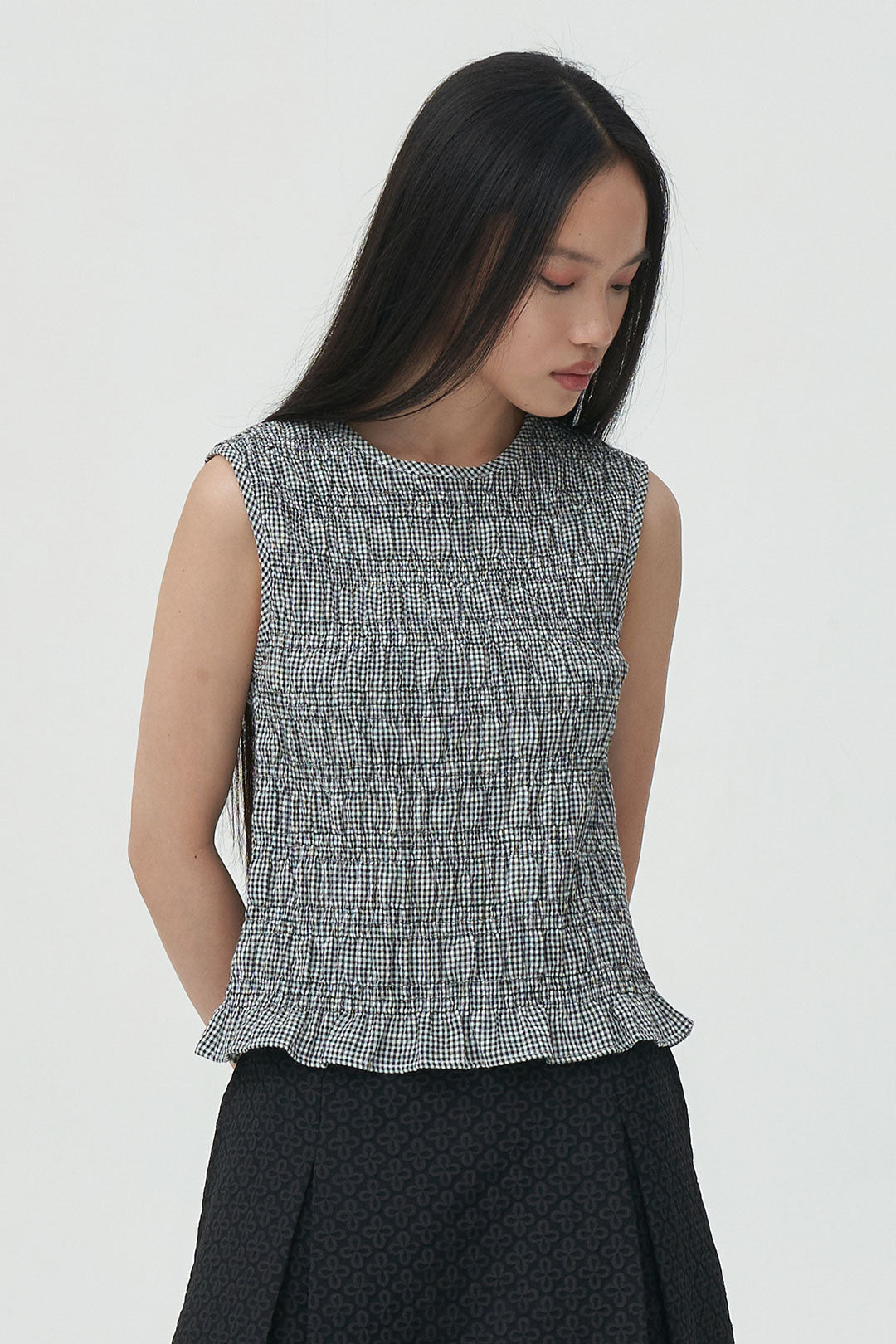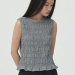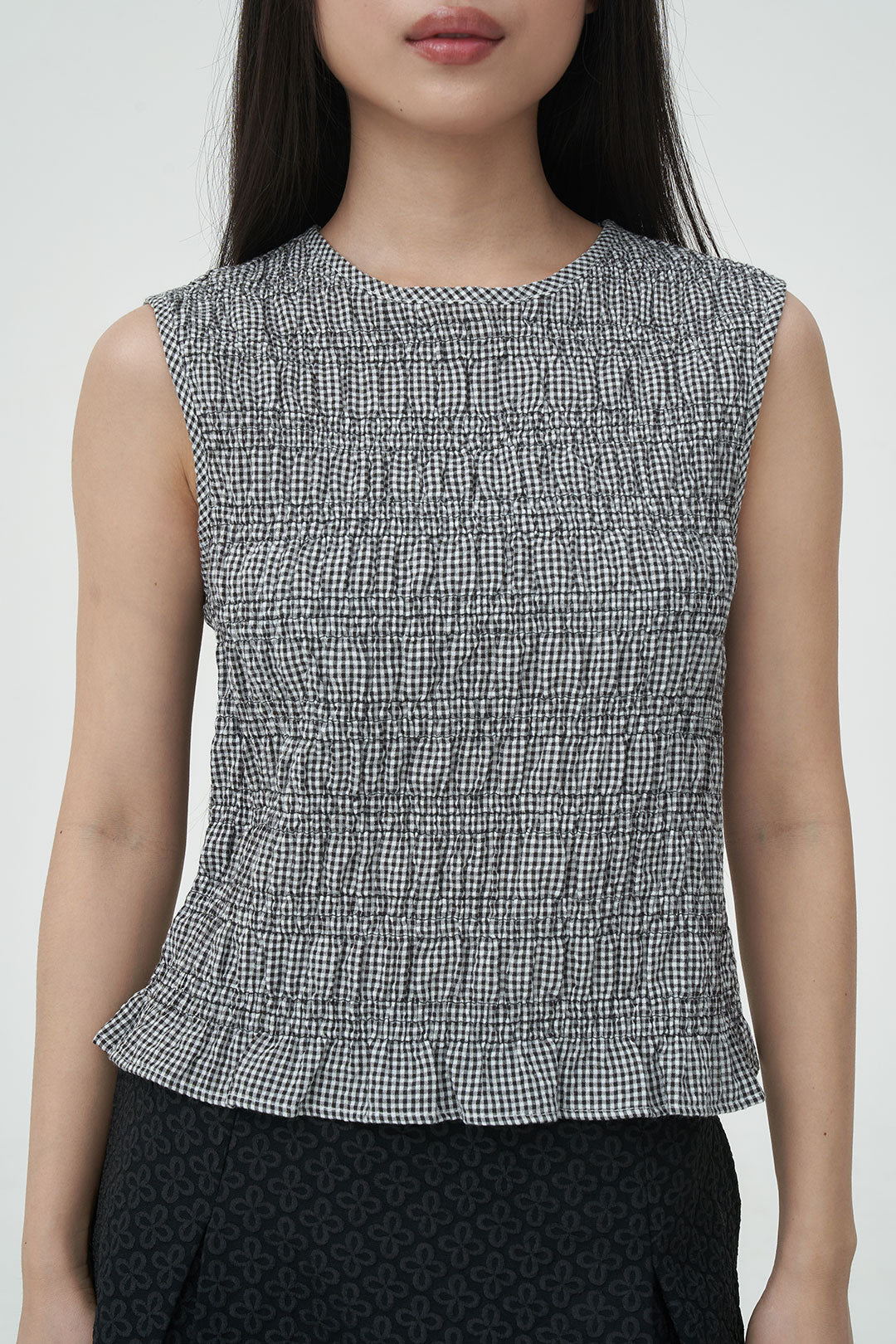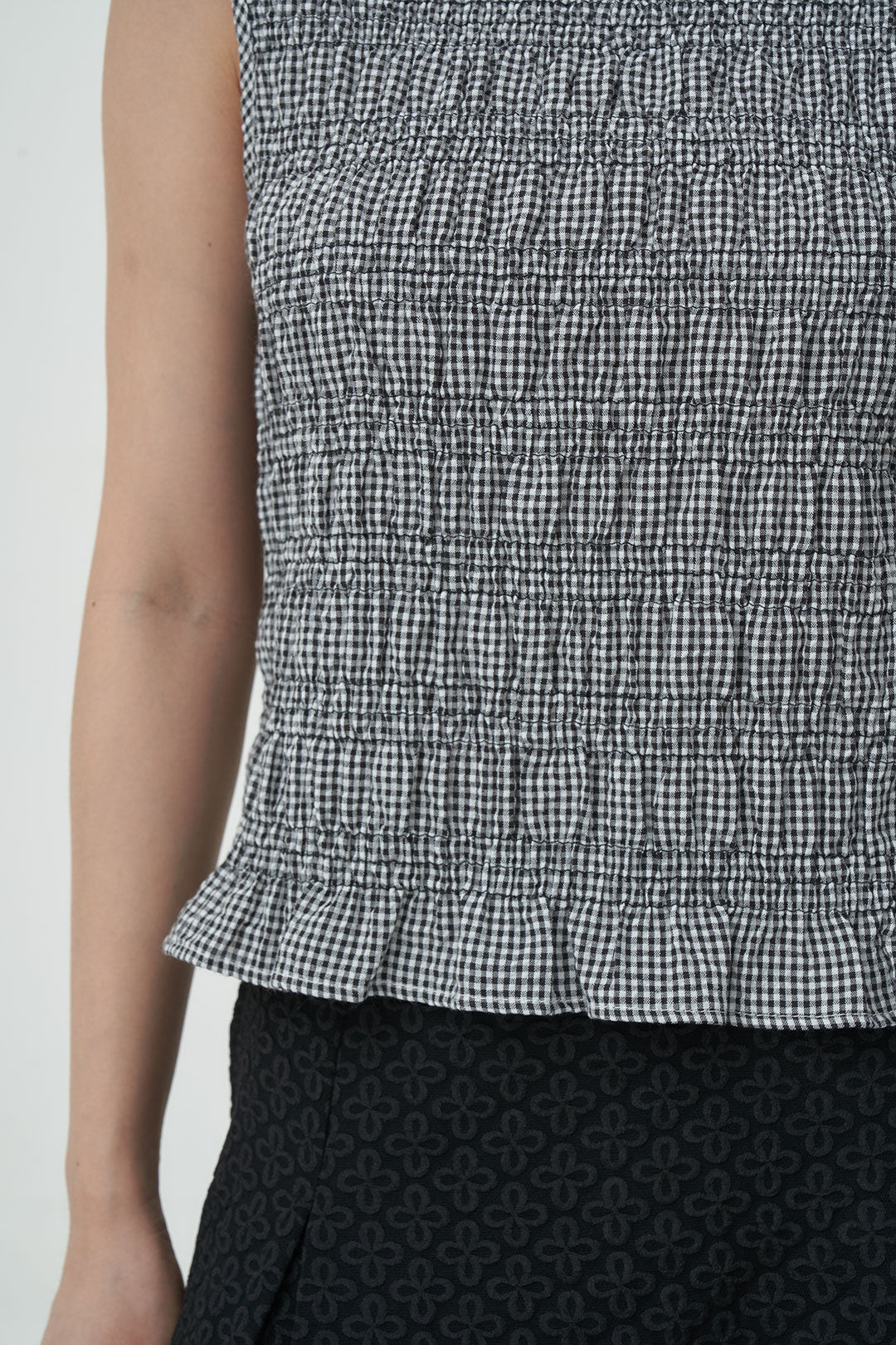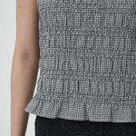- A sleeveless gingham top with subtle textured smocking throughout.