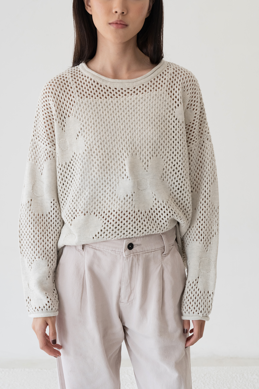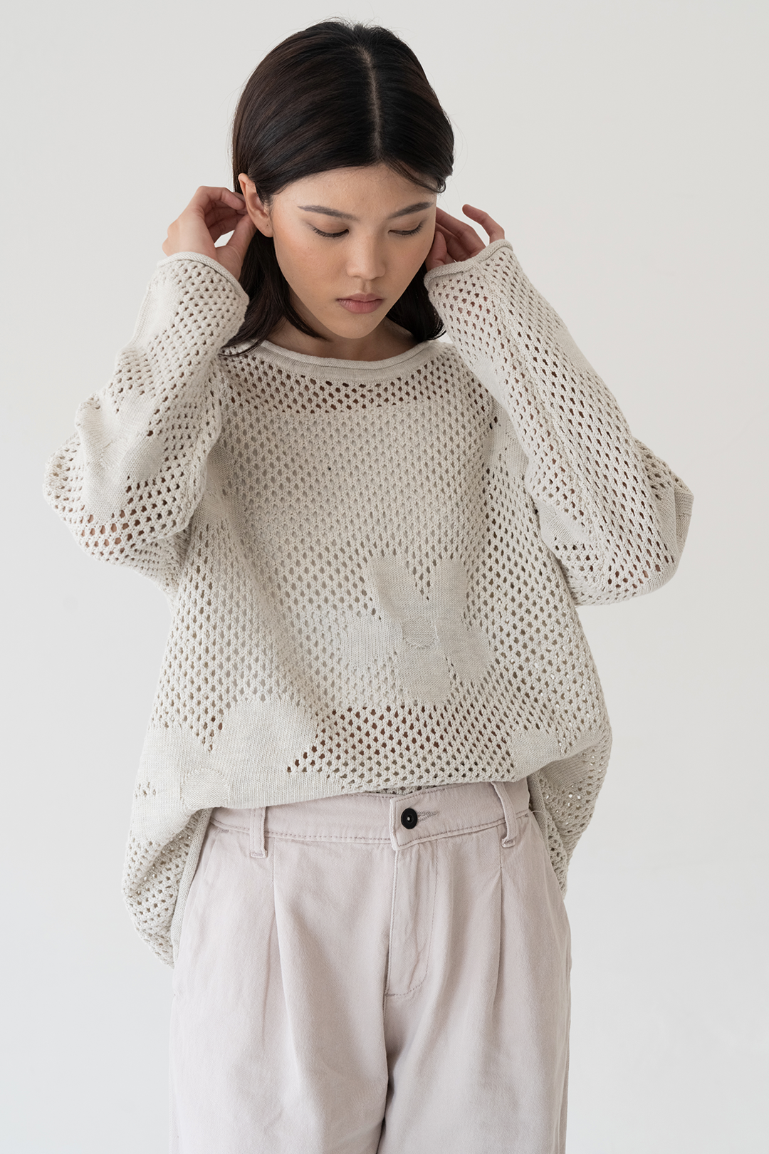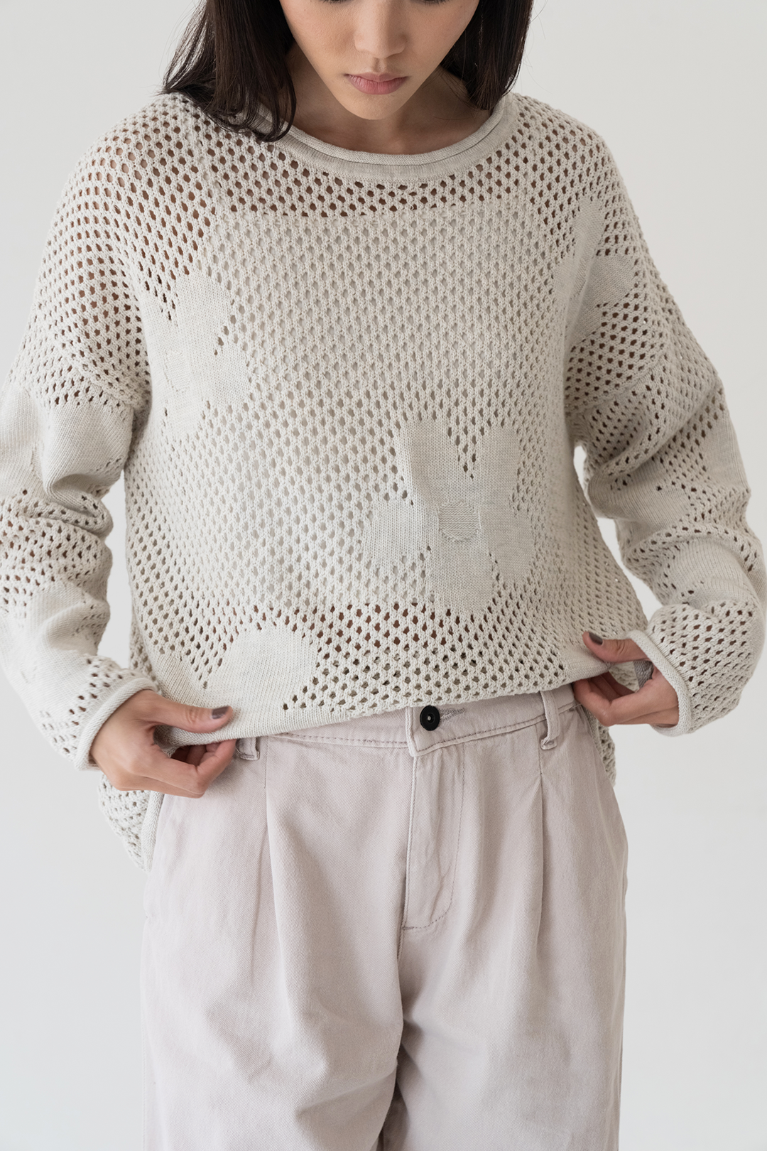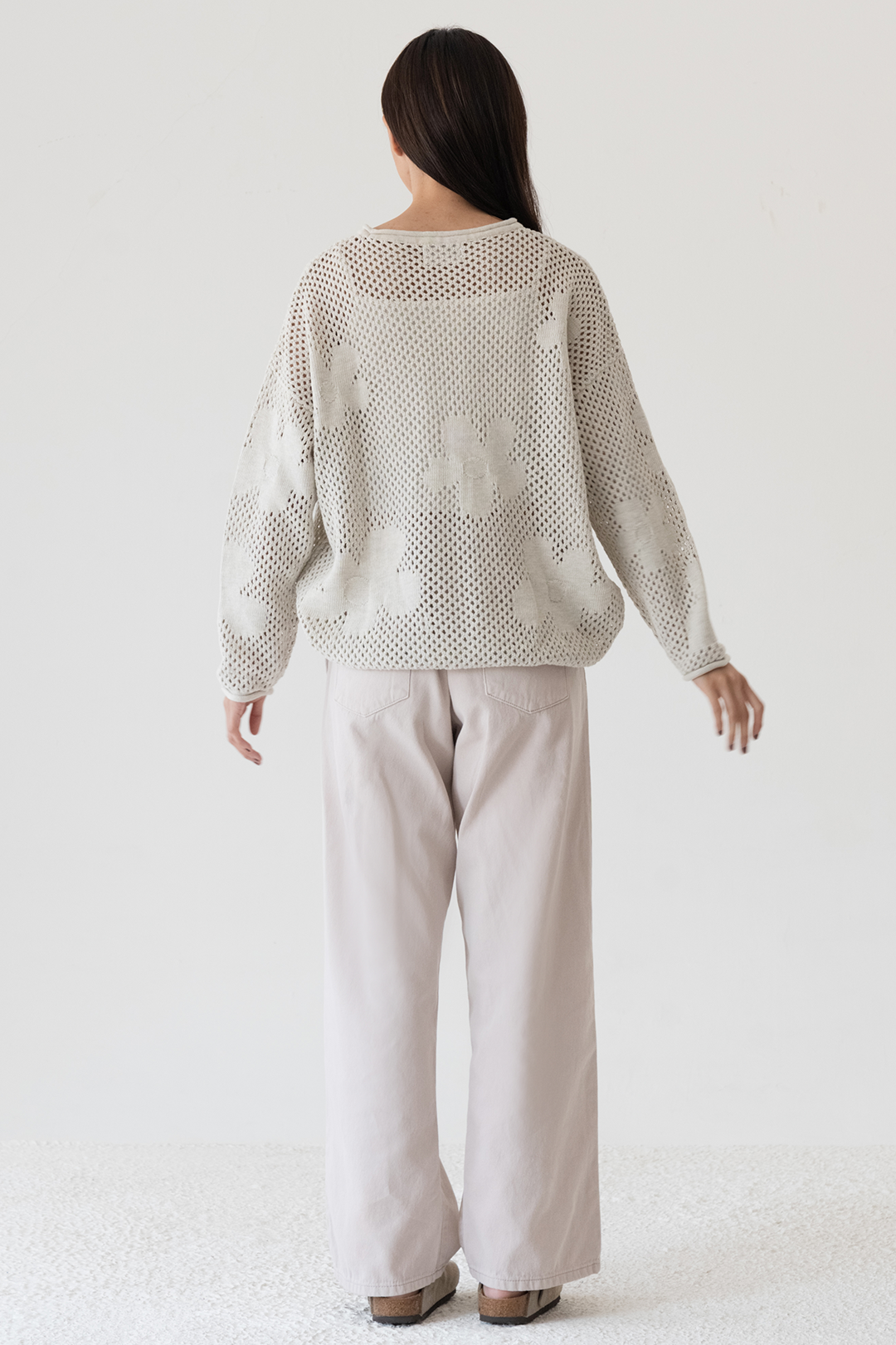 - Long-sleeve knit top with open weave and floral details, perfect for layering.