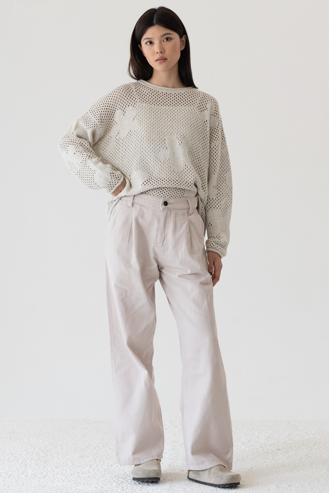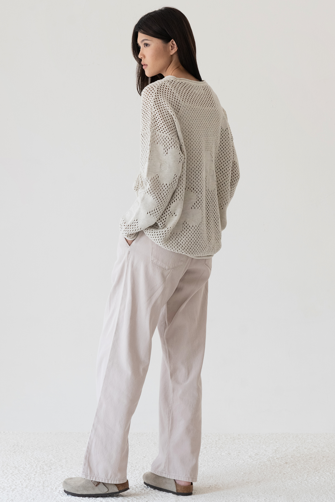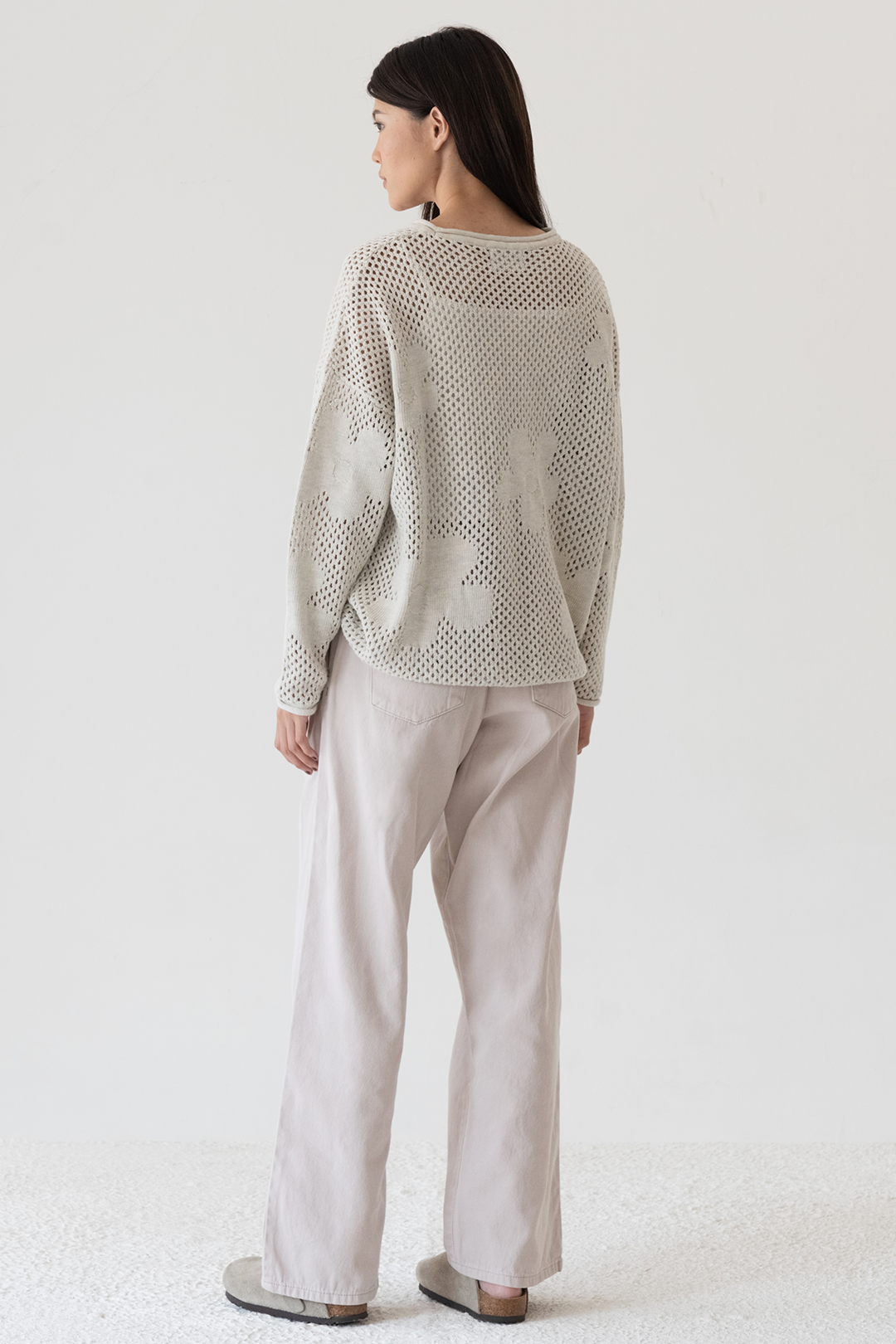 - Long-sleeve knit top with open weave and floral details, perfect for layering.