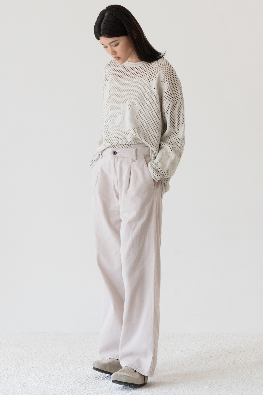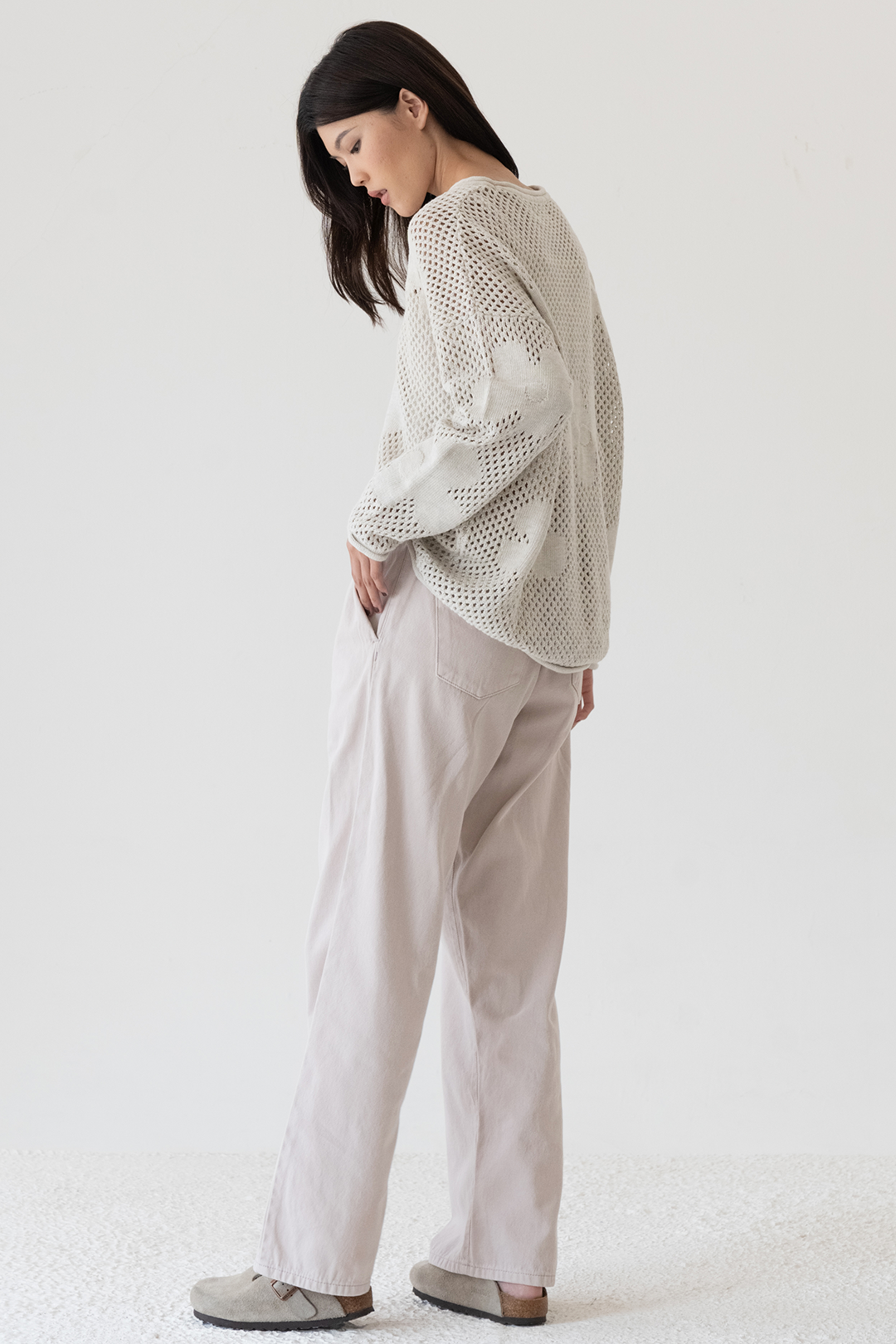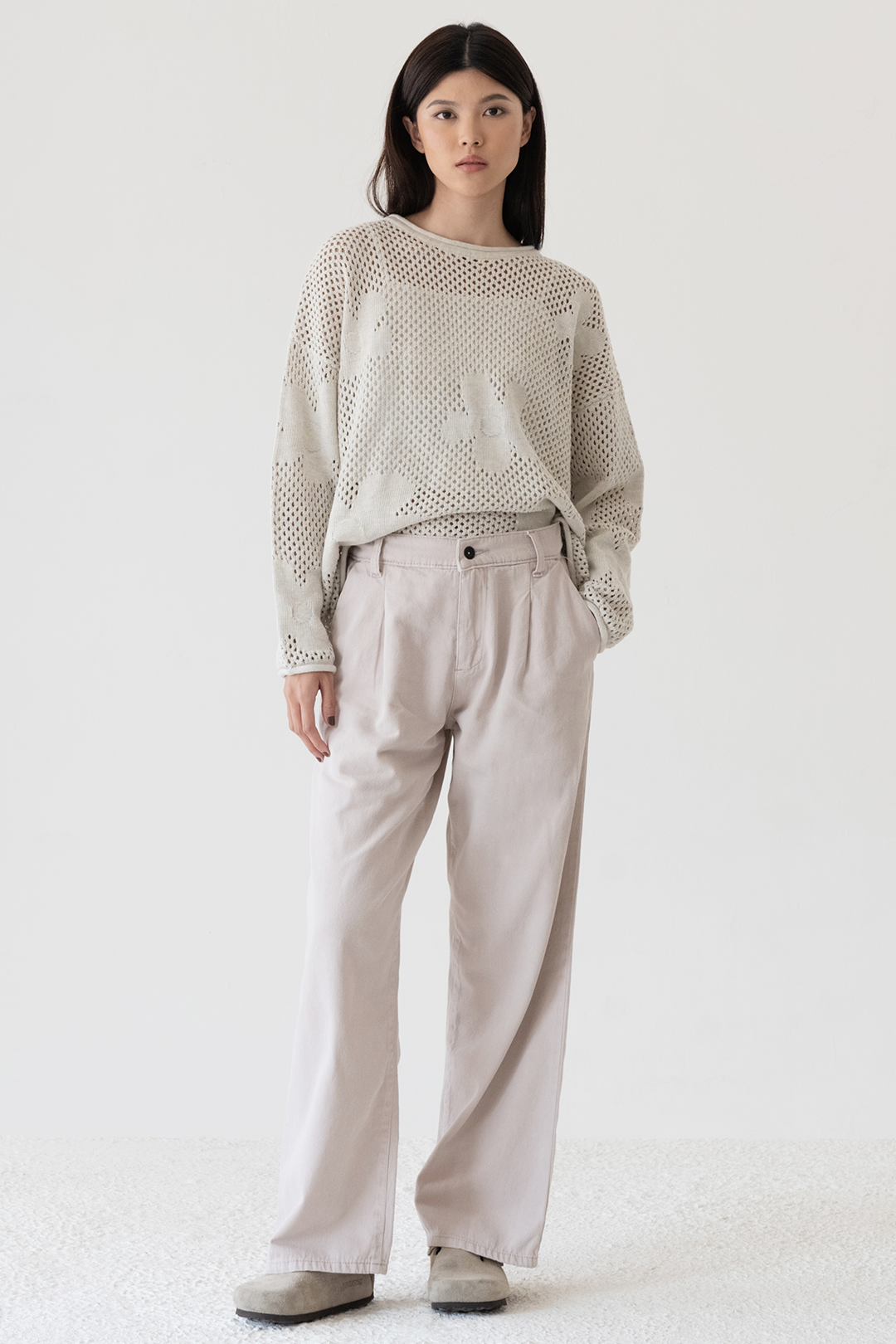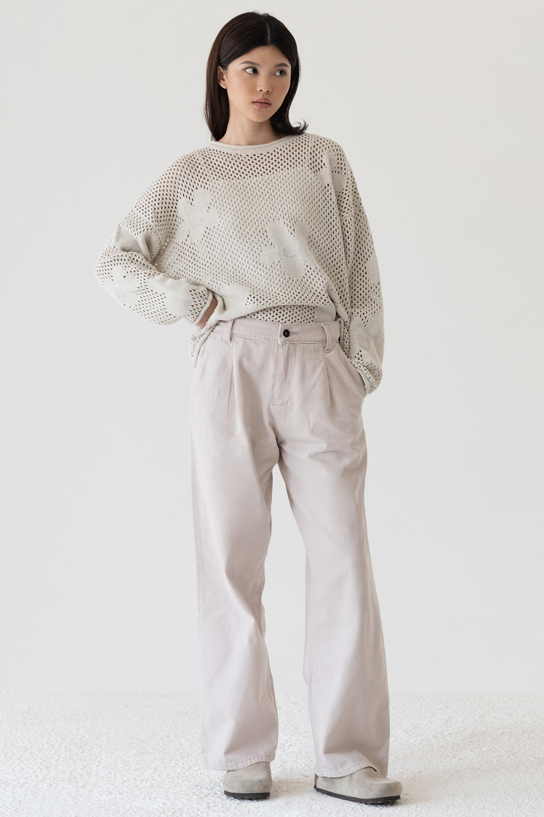 - Long-sleeve knit top with open weave and floral details, perfect for layering.