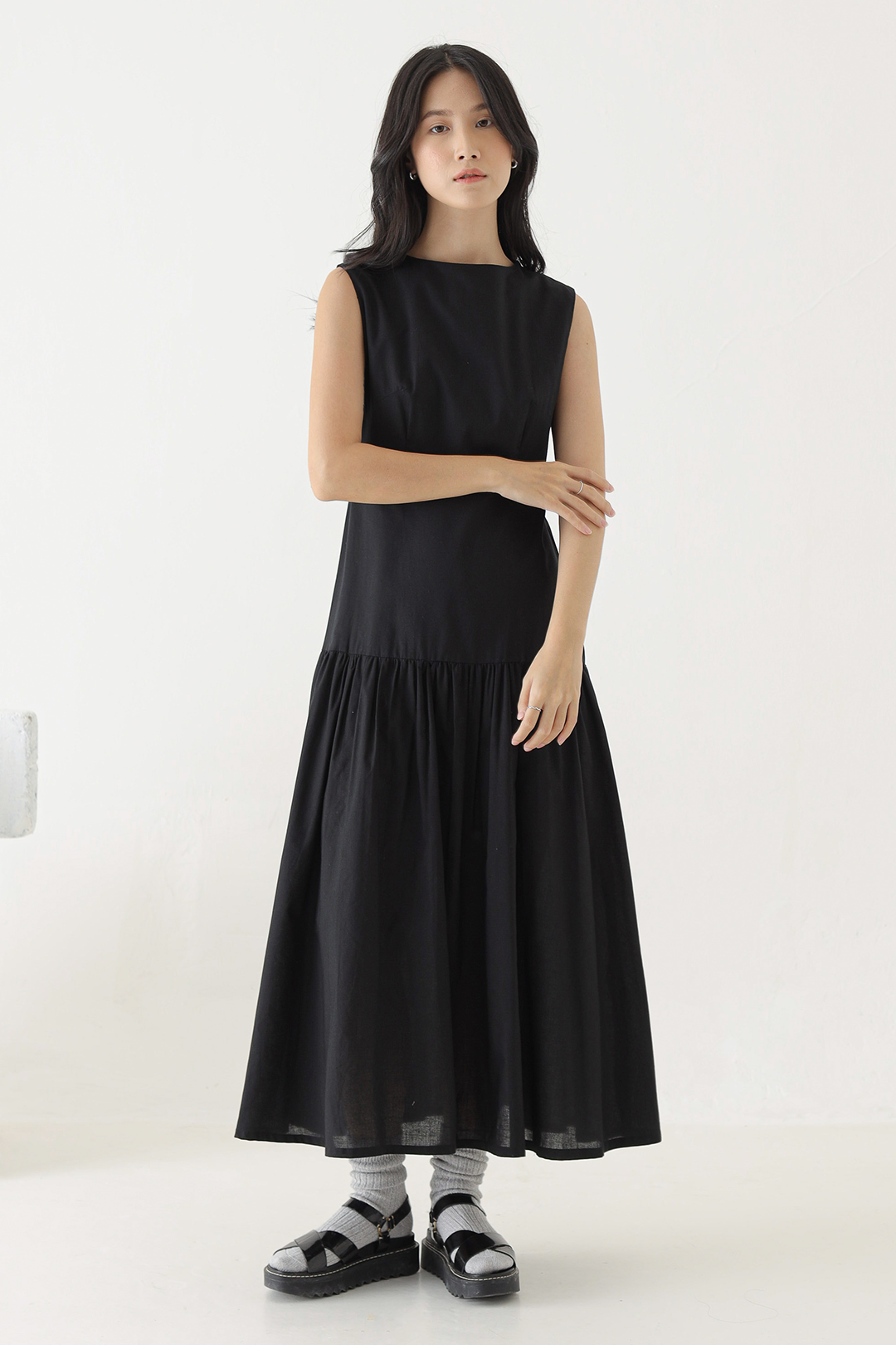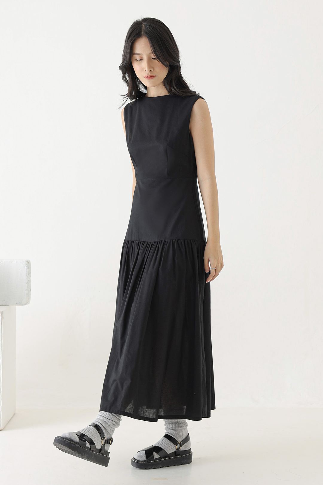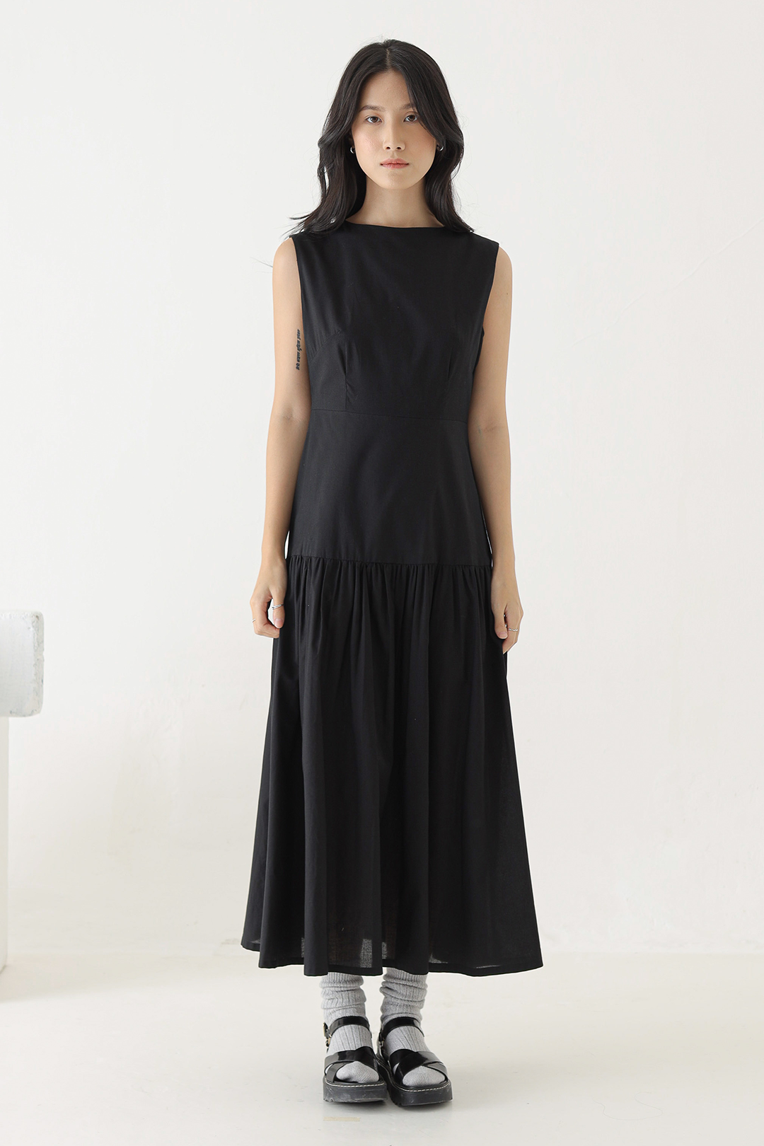 - Sleeveless dress with a gathered waistline