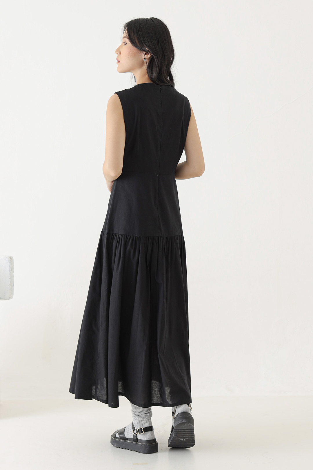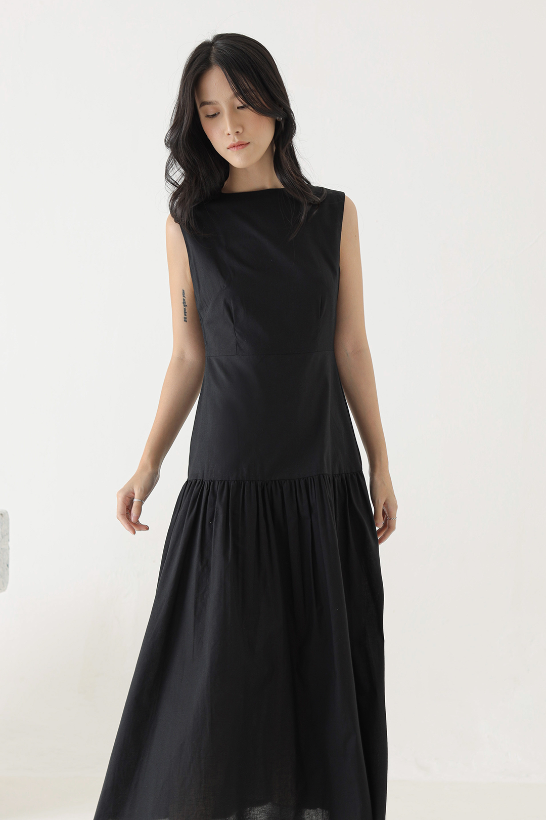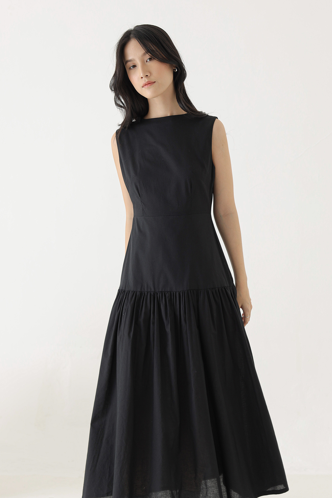 - Sleeveless dress with a gathered waistline