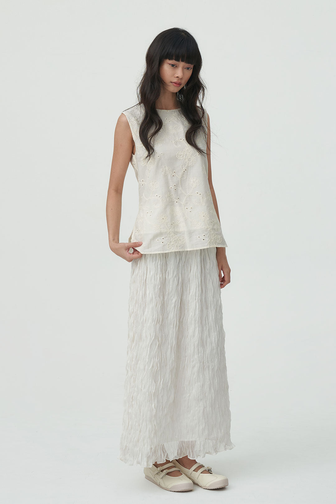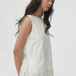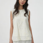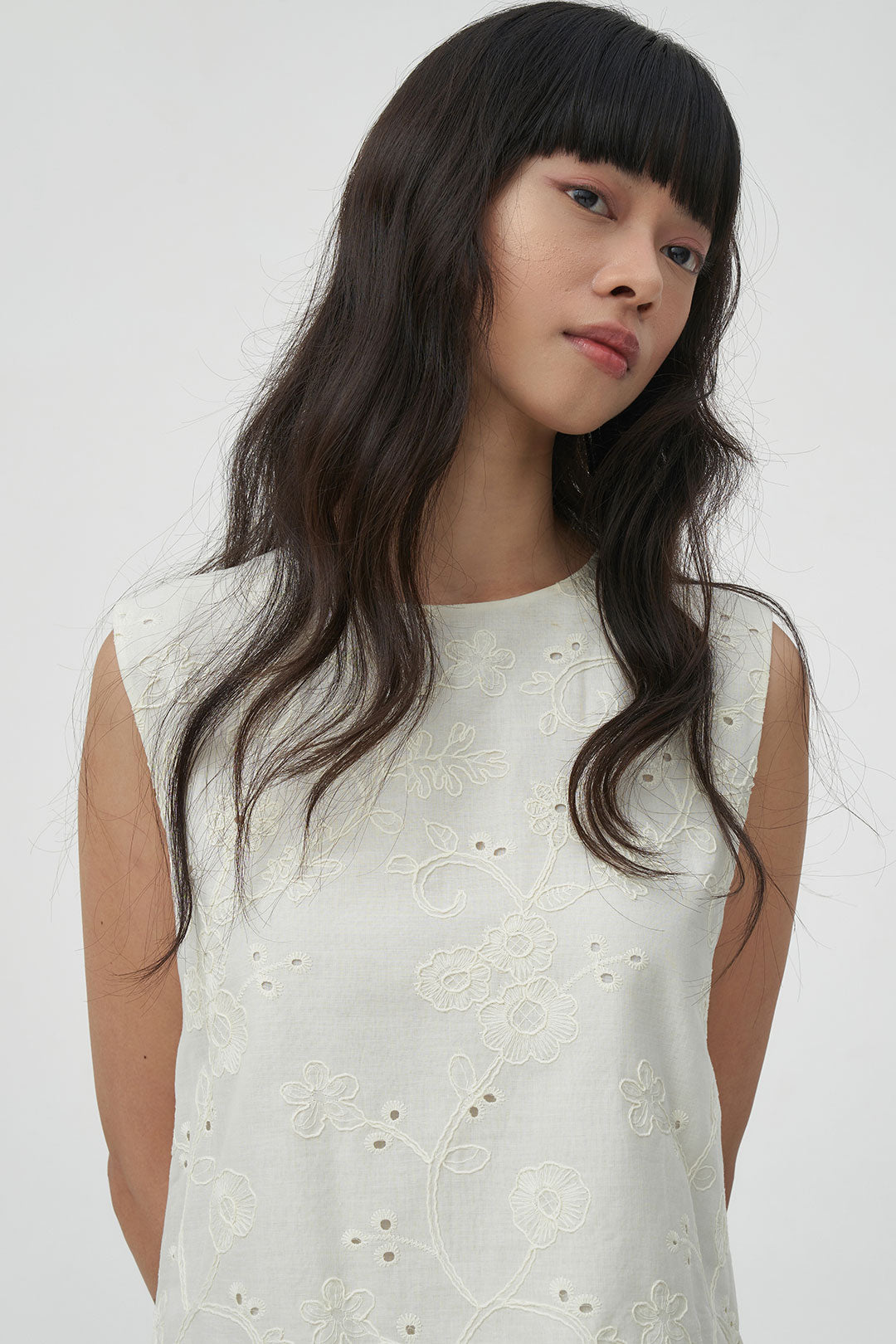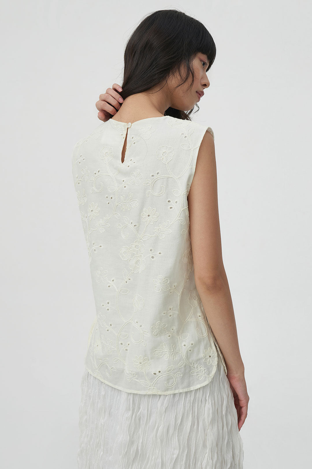 - A sleeveless embroidered top crafted in soft cotton with intricate floral eyelet details throughout.